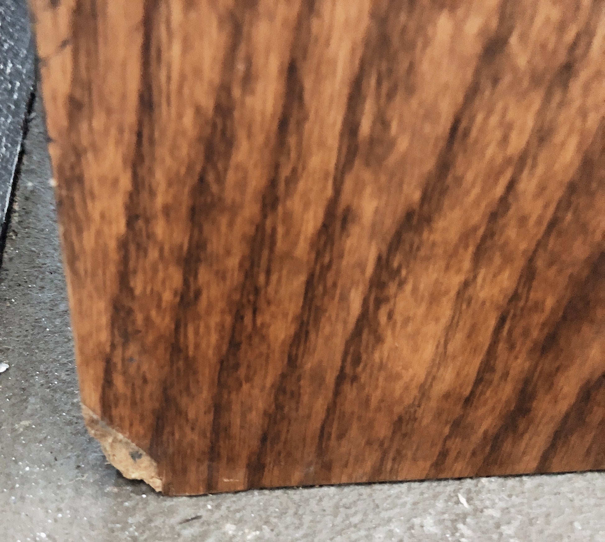Dresser has smooth drawers and integrated handles. A very faint mark or two on the top which you can barely see. One small chip to base in the rear as pictured 36x18x28” tall