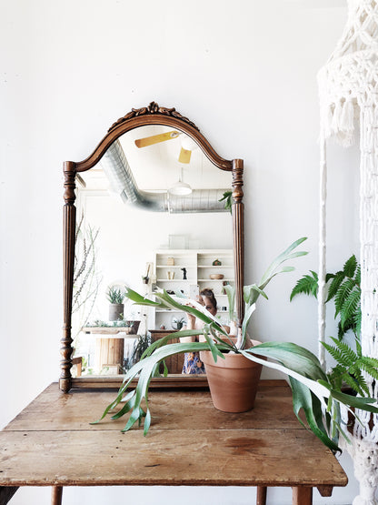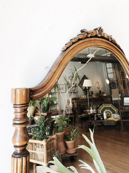 Beautiful age to this vintage wood mirror. Arched top and floral carving. Nice look to glass.