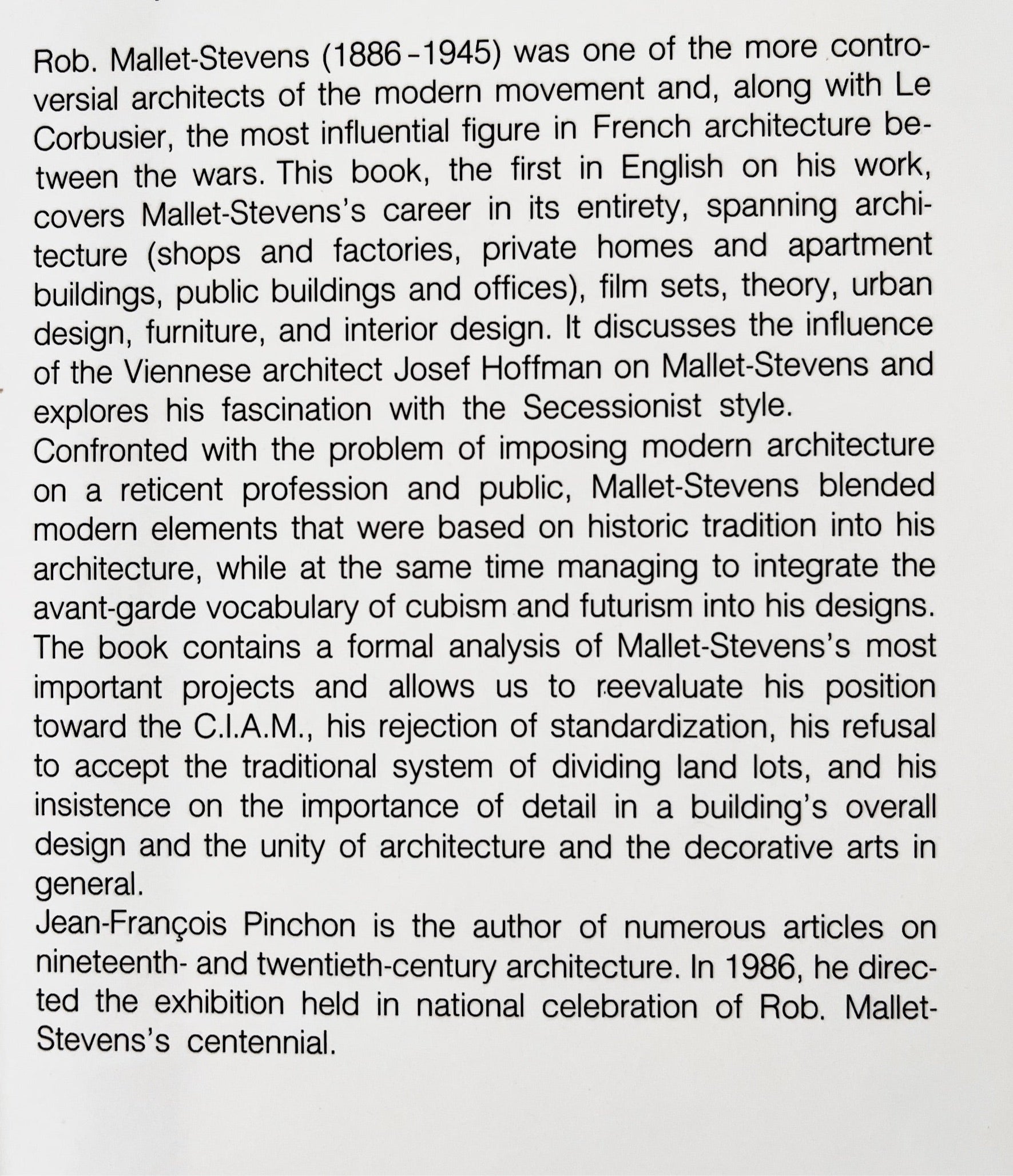 Rob. Mallet Stevens, most influential and controversial French architect along with Courbusier. Color and black and white plates along with a history of his life and work. Published by MIT university.