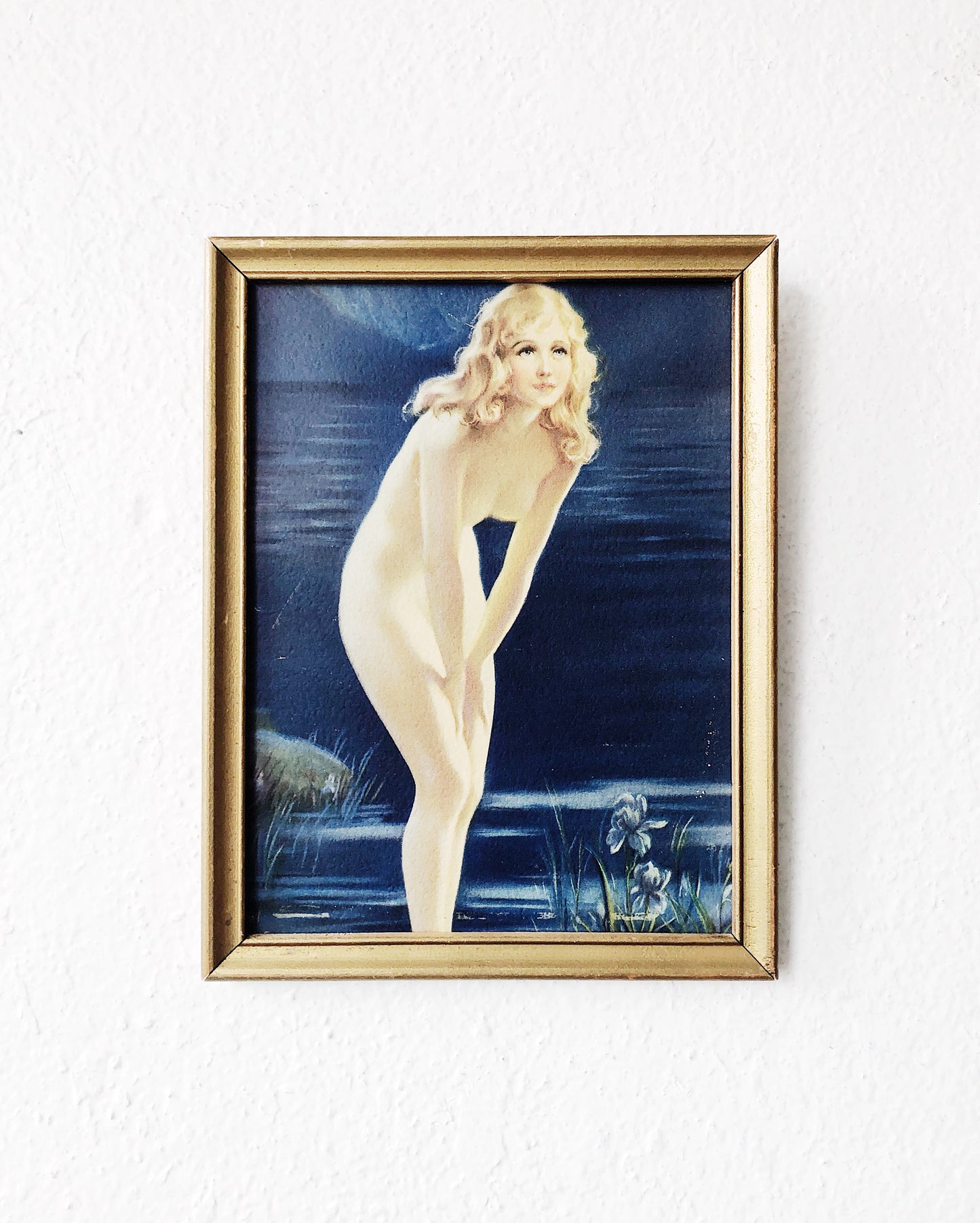 A sweetly modest art deco nude lake swimming at night. She’s surrounded by lake grass and water lilies. Framed in goldleaf and glass