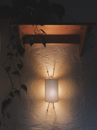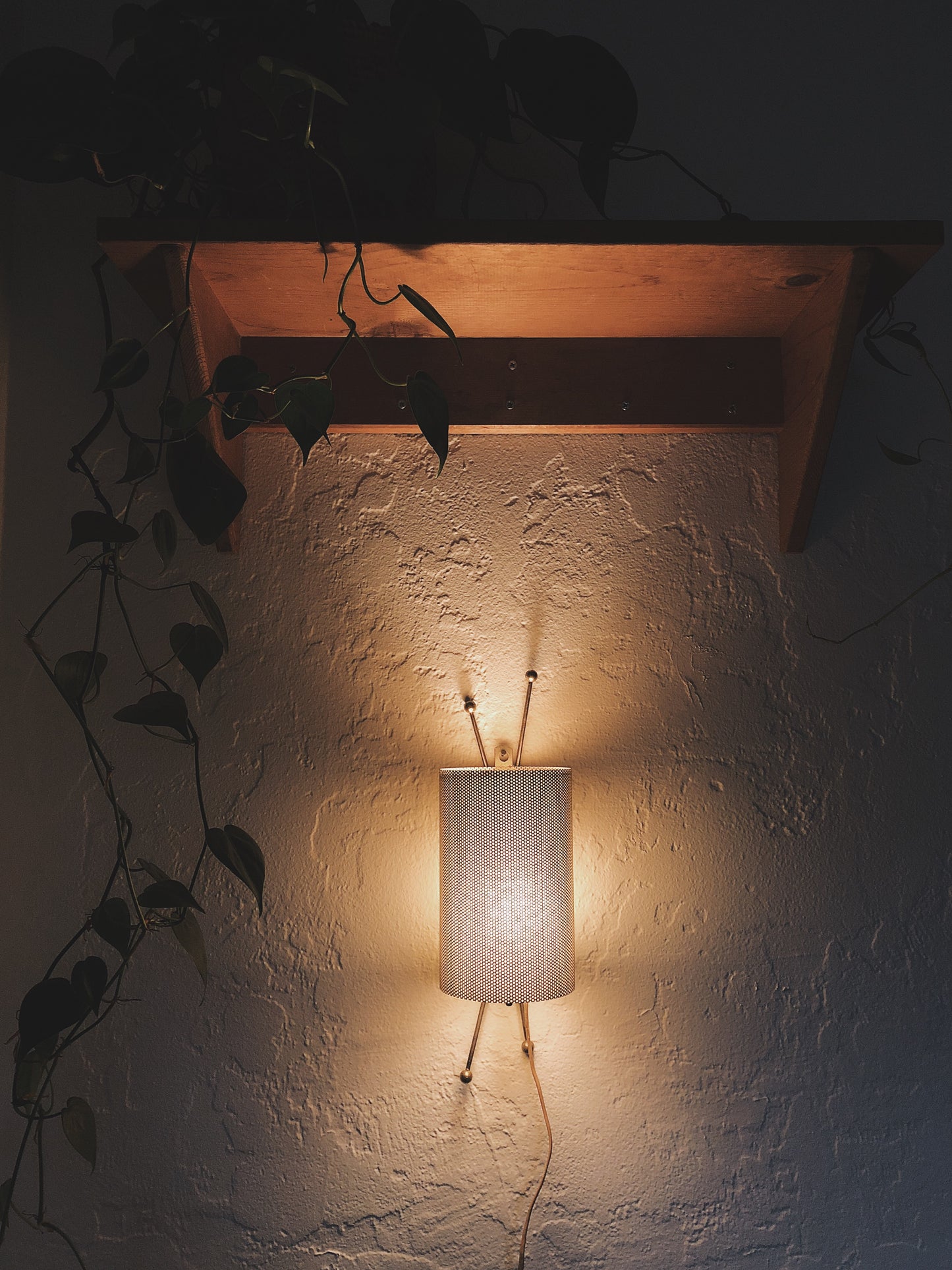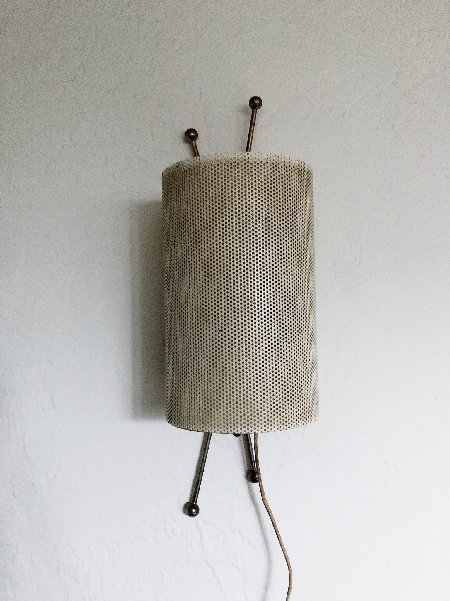 Vintage Mid Century Atomic era sconce. A metal mesh cover with metal accents. Plug end, on off switch on lamp