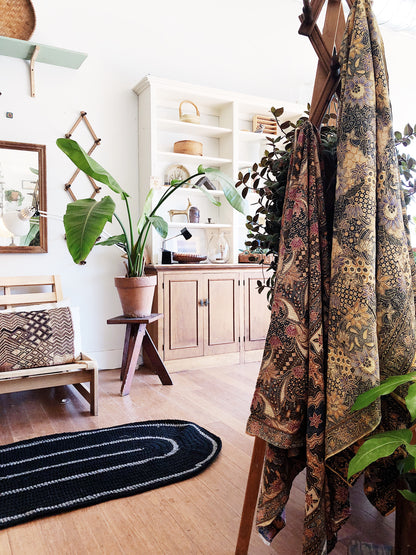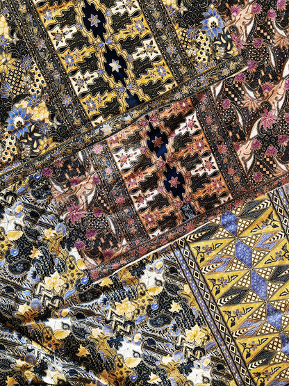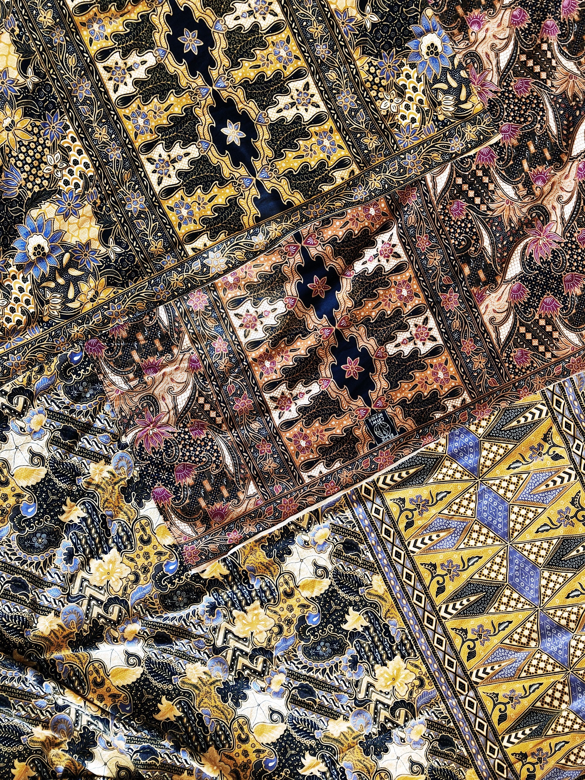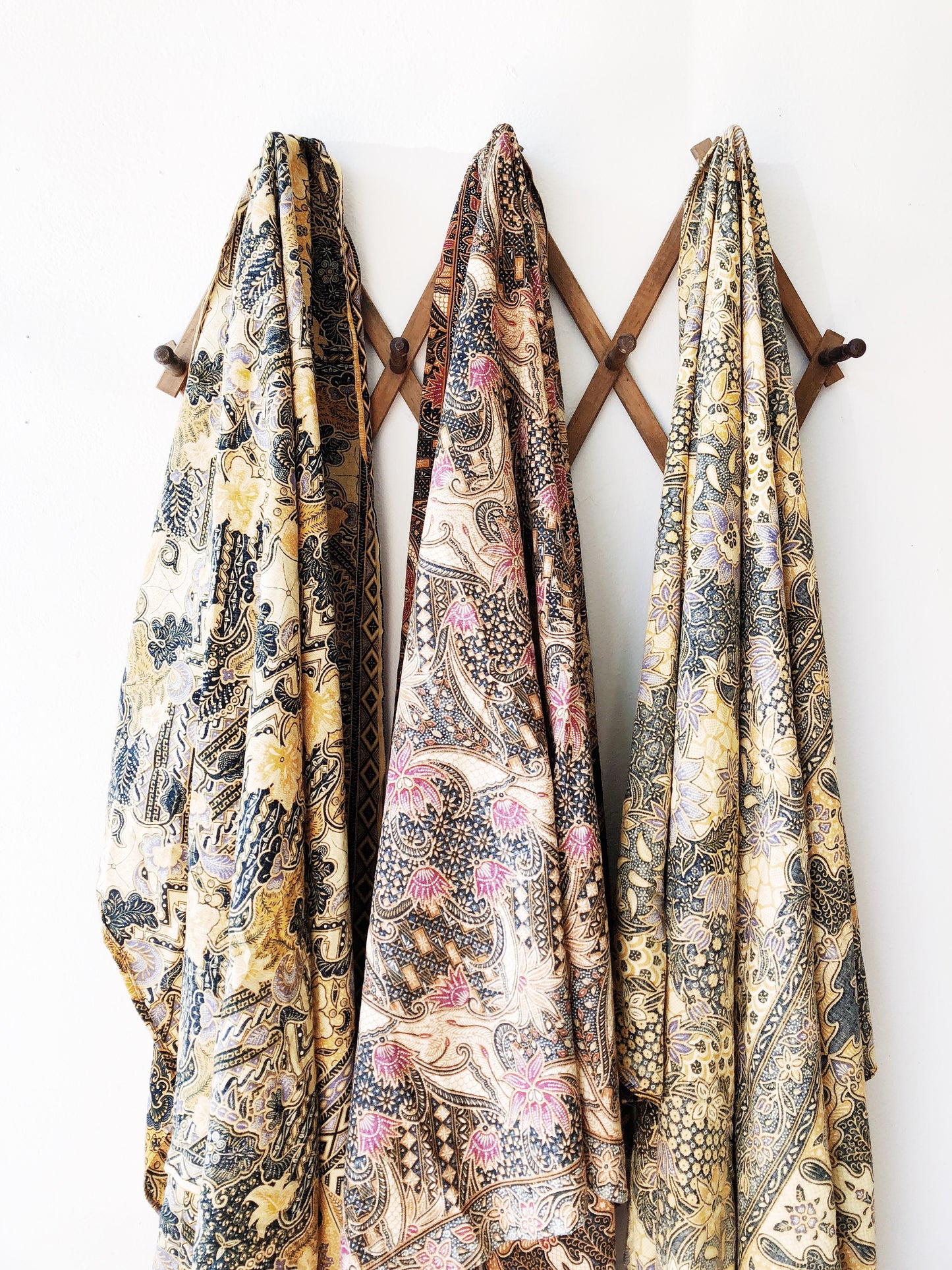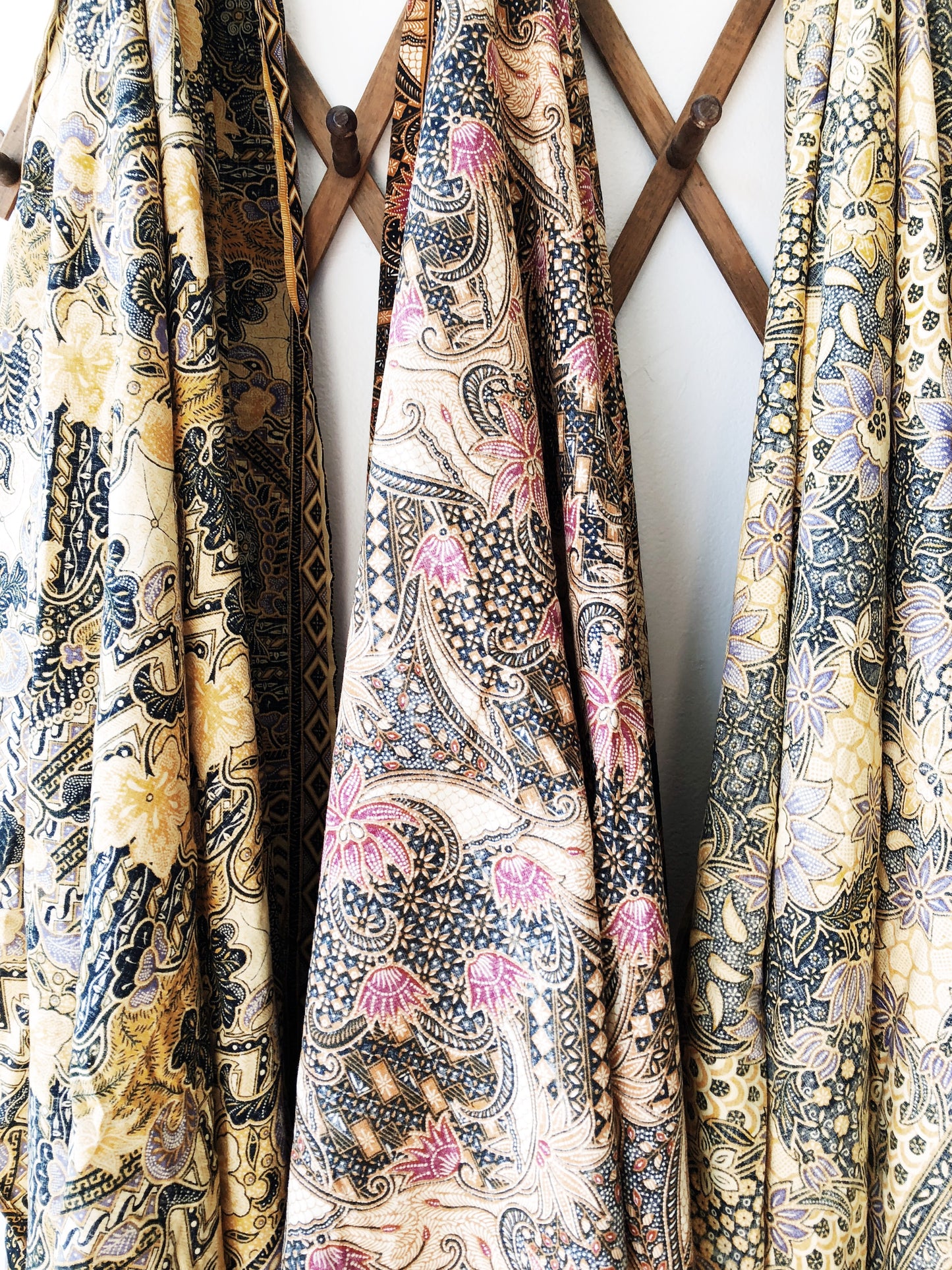 Vintage Balinese batik textiles all in a row. Lovely blockprinted patterns in rich colors. Faded on one side and saturated on the other. Perfect for fall.