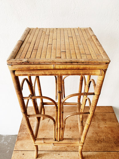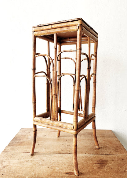 Tall vintage bamboo plant stand with arched sides. A little bit wobbly but sturdy enough to hold a larger sized plant.
