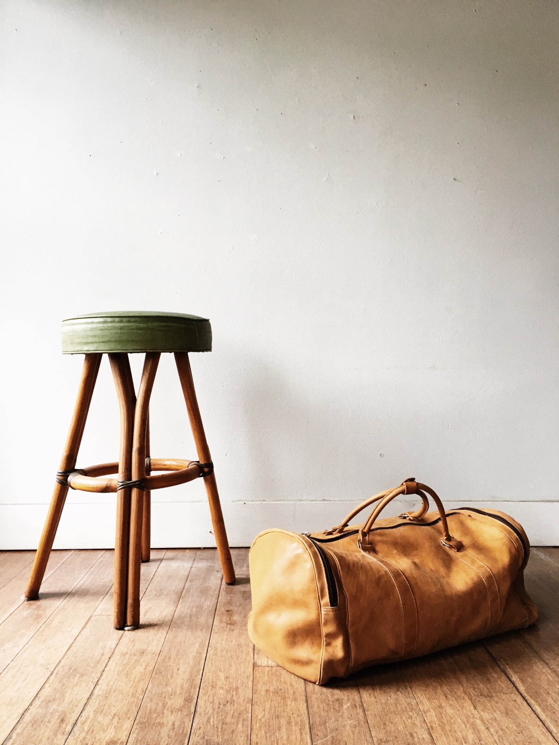 Vintage bamboo stool with green vinyl seat. In excellent condition.
