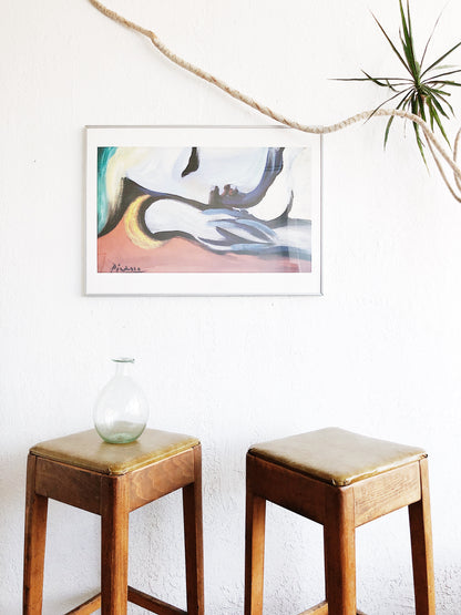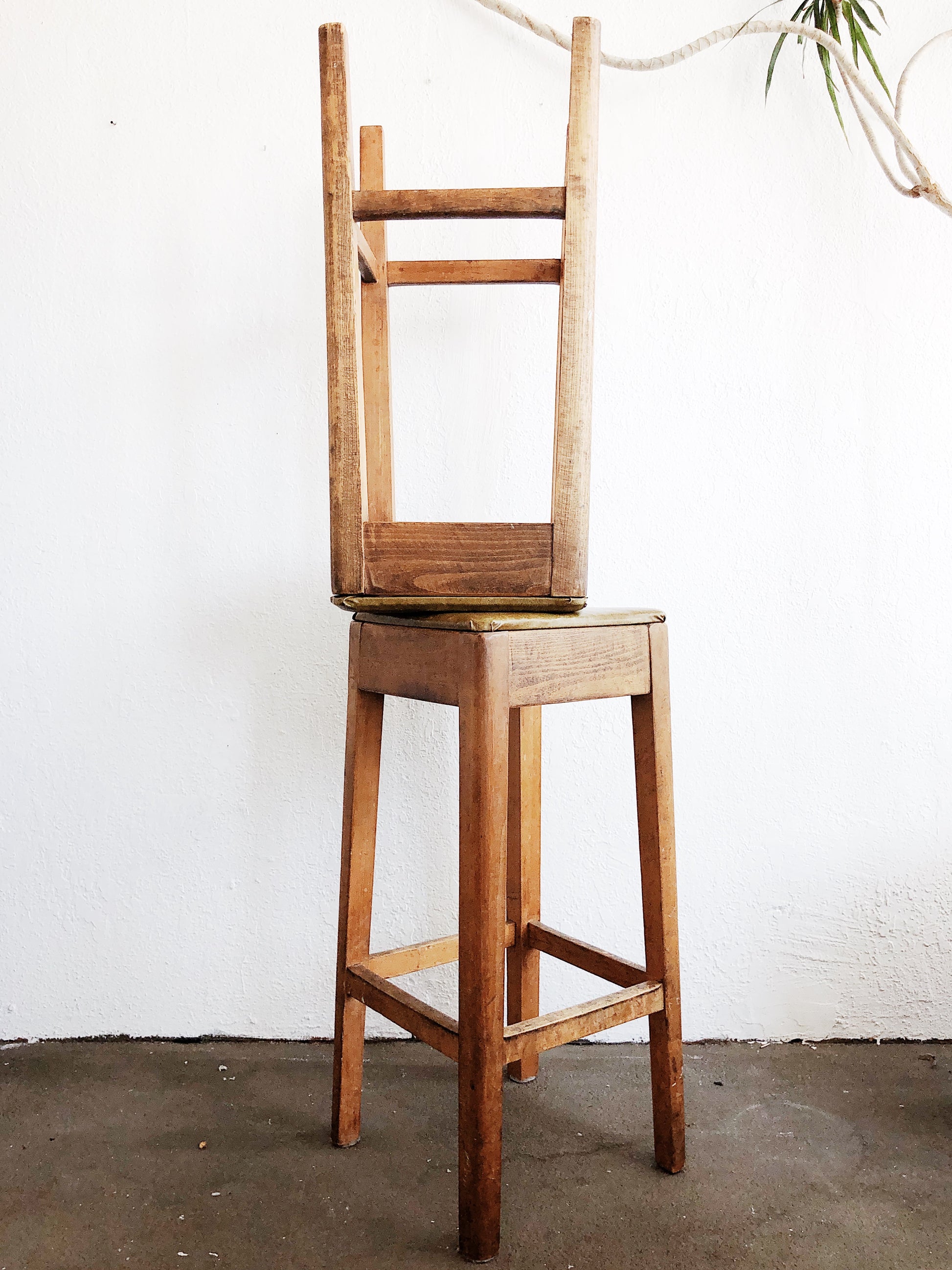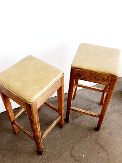 Fantastic shape and mellow patina to these wooden bar stools. Vinyl seat in an ochre color. Very sturdy