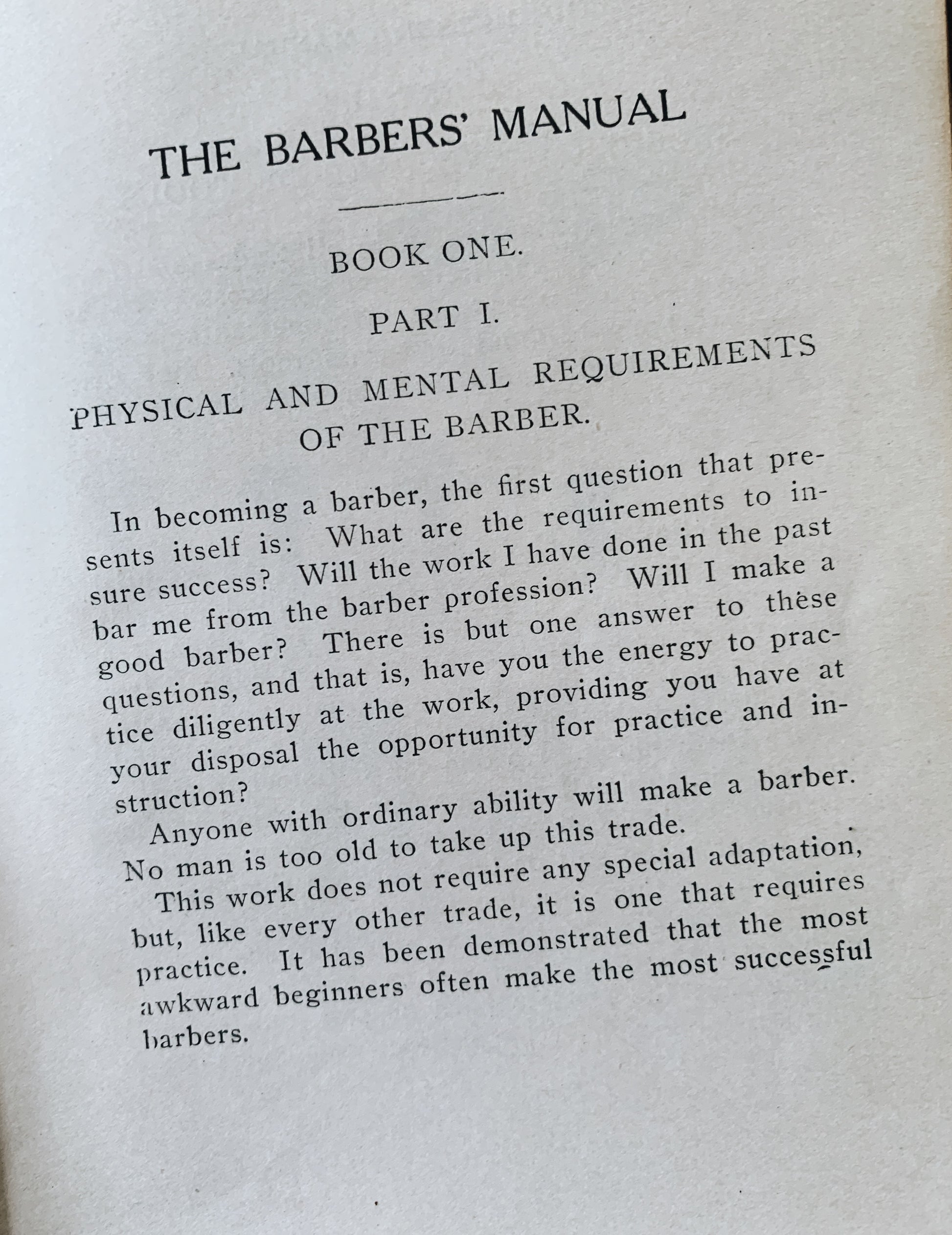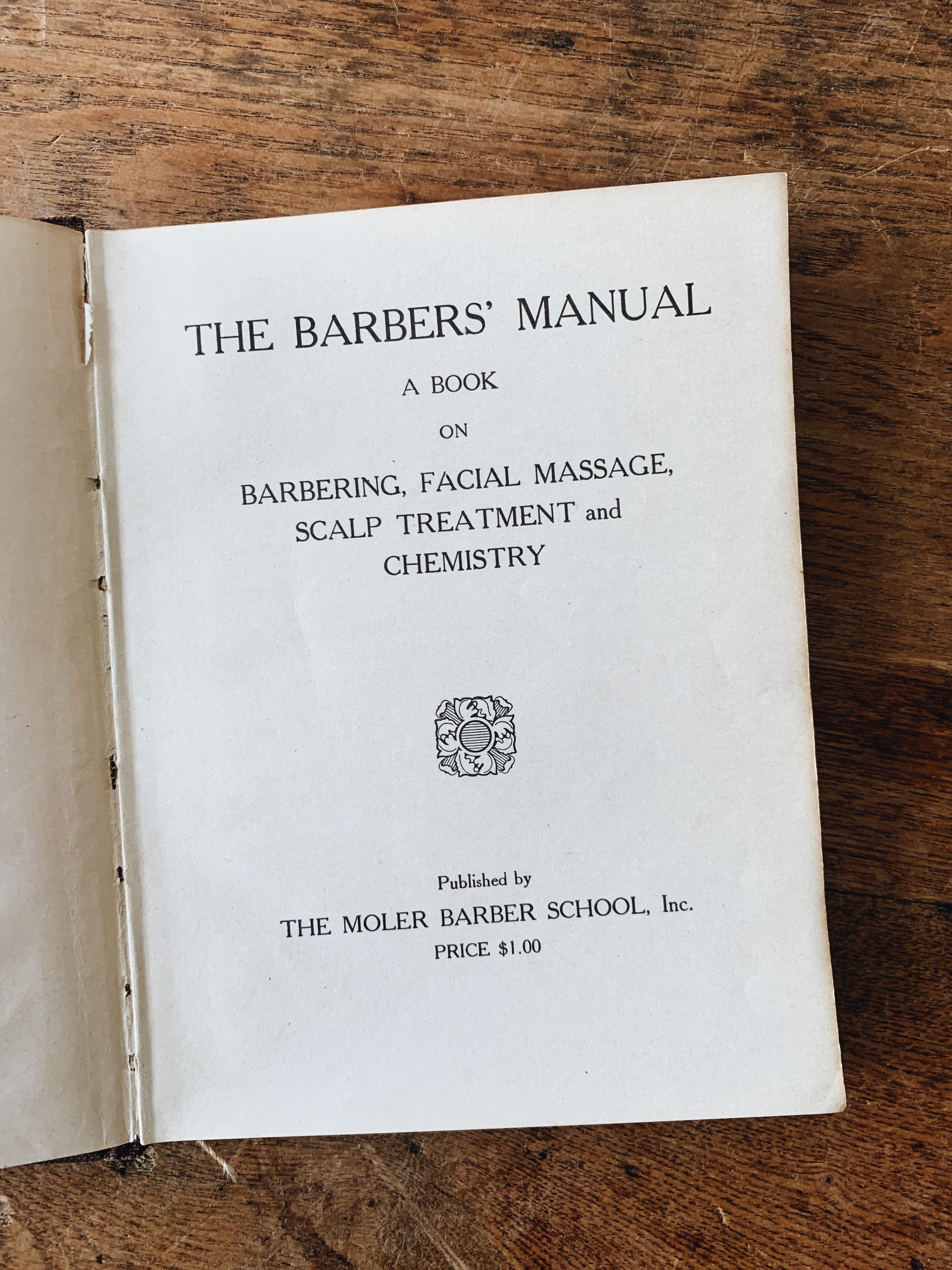 a book on barbering, facial massage, scalp treatment and chemistry.