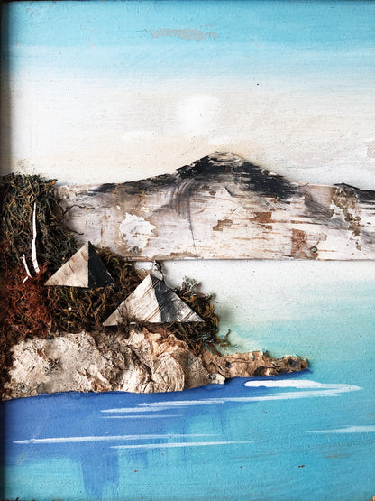 Lovely dimensional mixed media painting utilizing birch bark and moss. The color is pastel and has a wonderful chalky look. Deeply saturated and framed in wonderful old wood