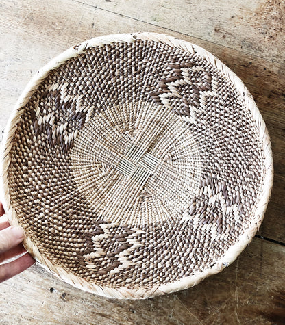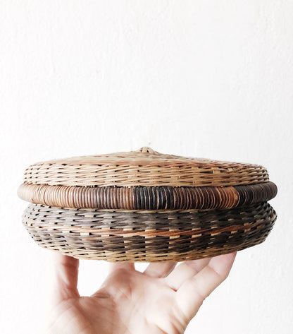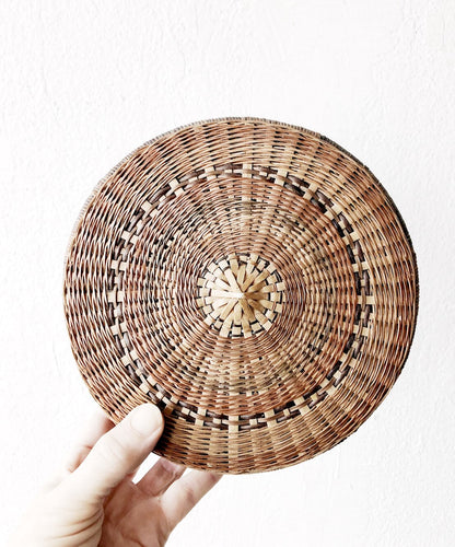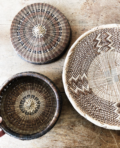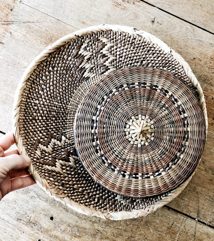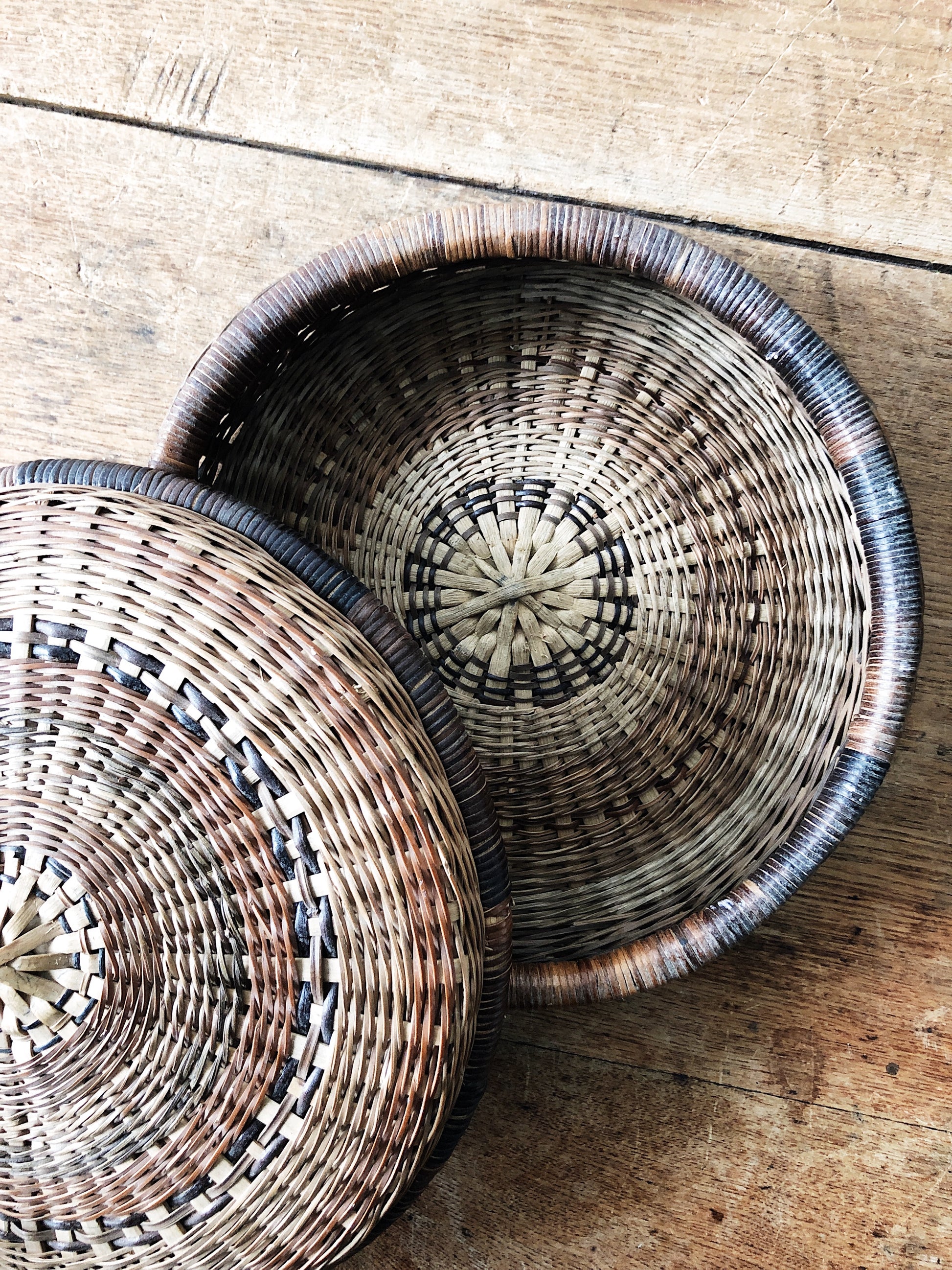 Beautiful weave on both of these baskets. Look lovely together. One is vintage Japanese lidded basket. Lid fits nicely and tight. The other is a larger shallow basket that can also be hung