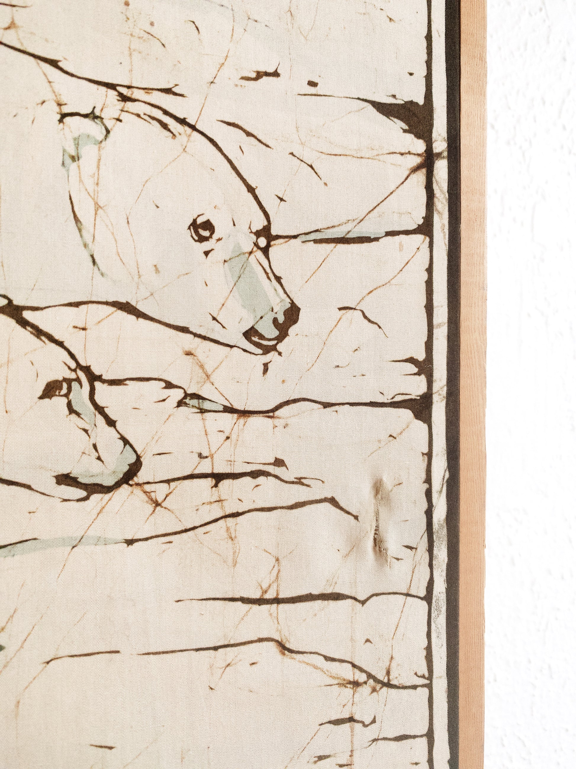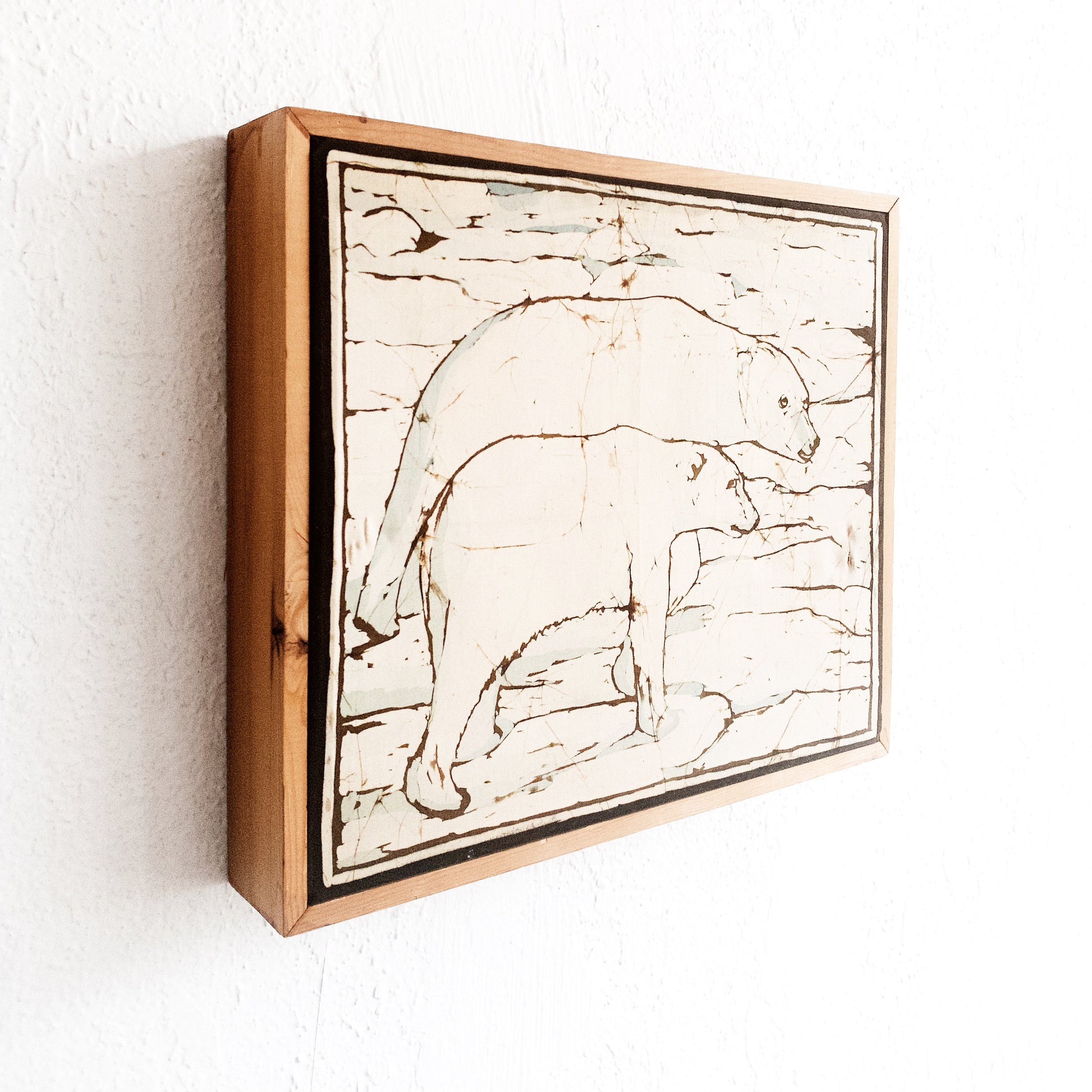 Vintage cotton batik polar bears in awesome wood box frame. Lovely find, one small repair tear. See close up photo.