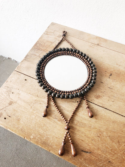 Concentric multi tonal wood beads frame a clear mirror. Hangs nicely. One tiny scratch to glass that is barely noticeable