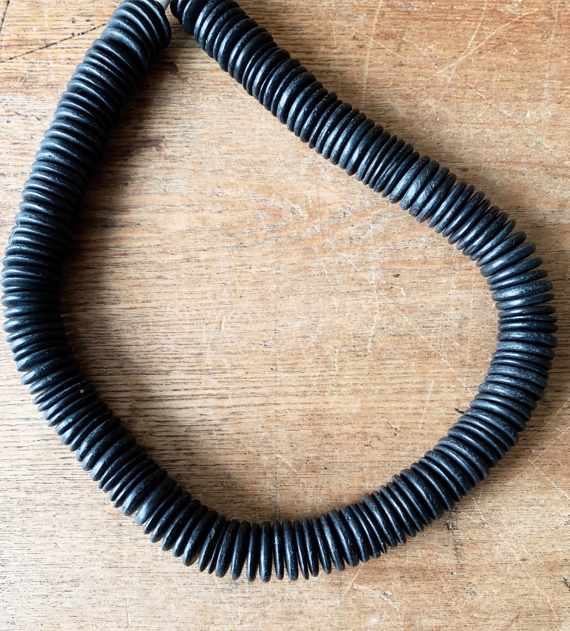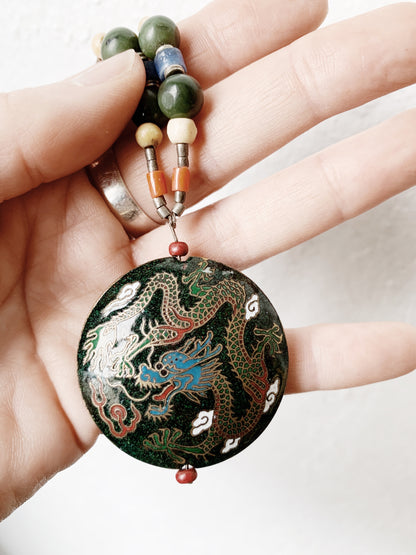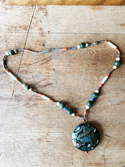 Lovely beaded necklaces of cloisonné, turquoise, coral, brass and agate to name a few. On delicate brass chain (two turquoise) with