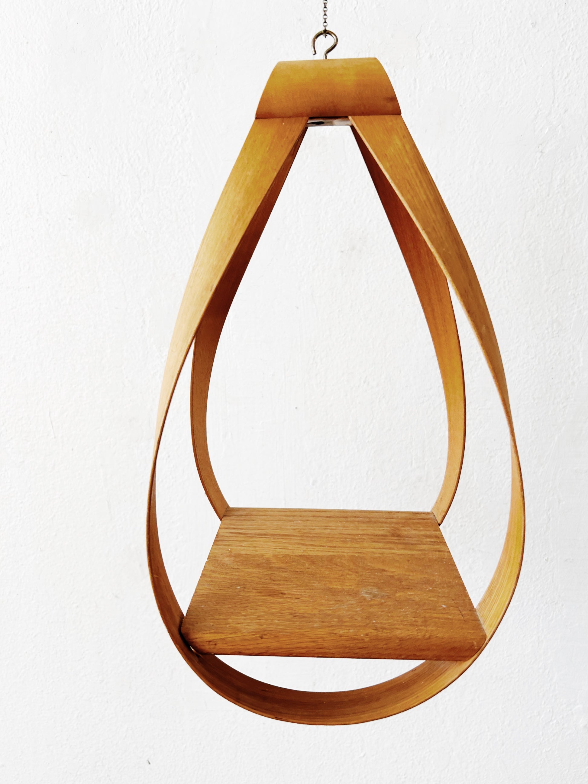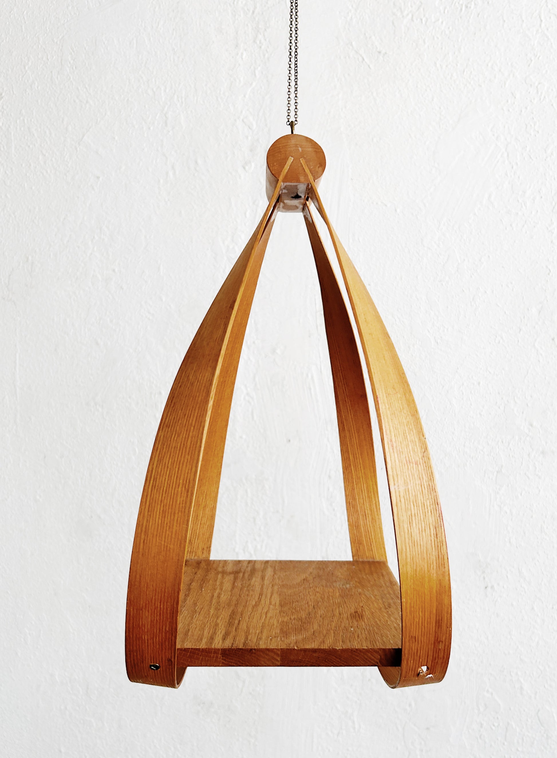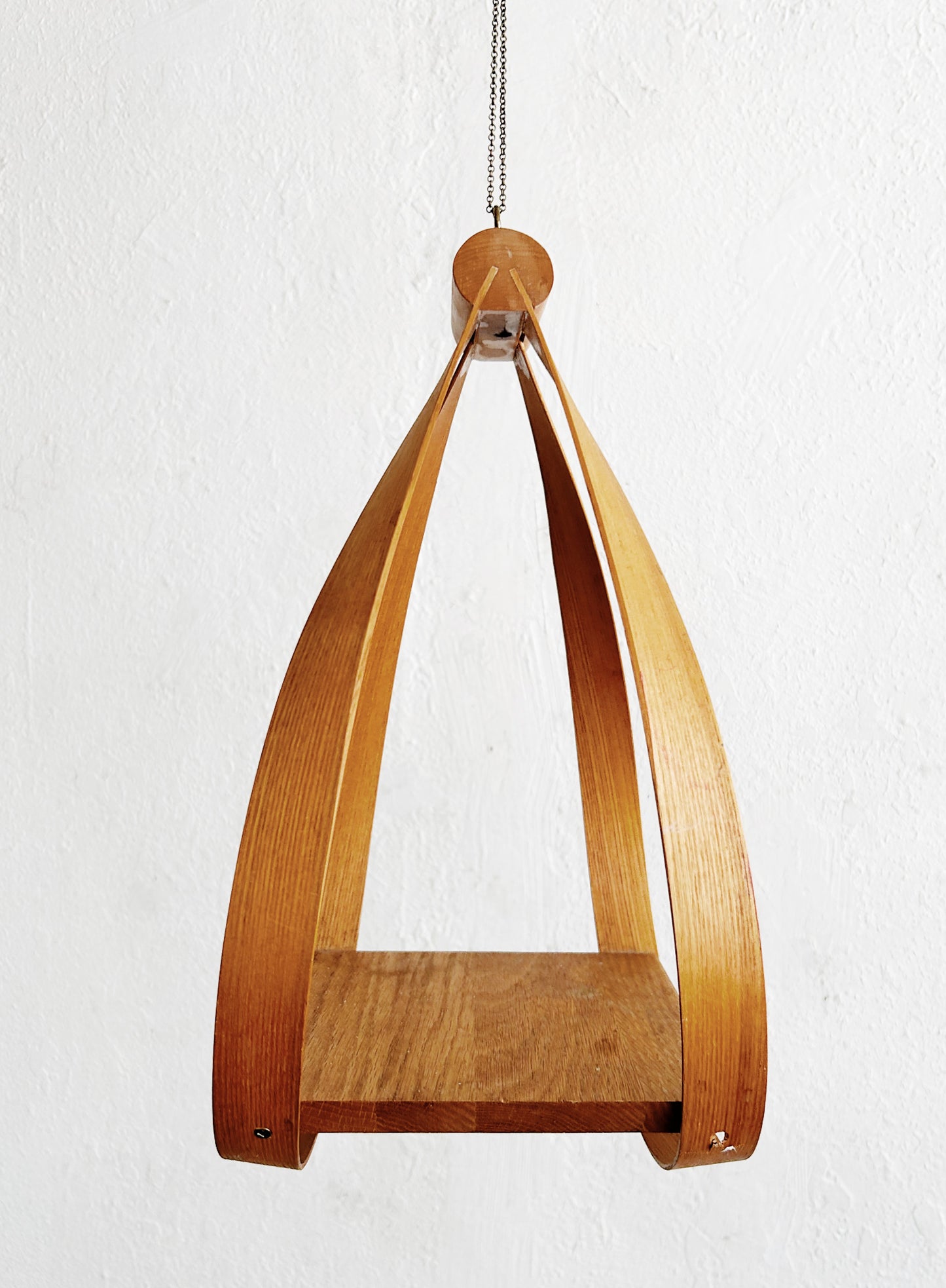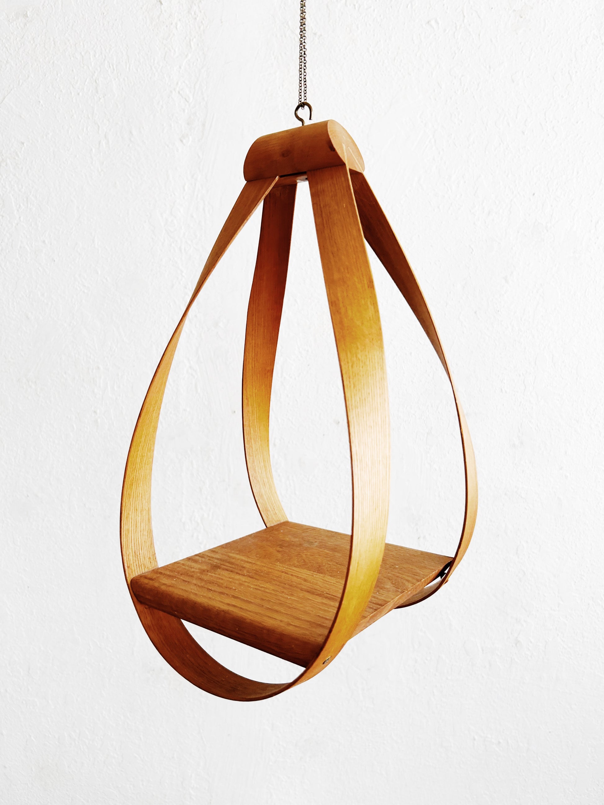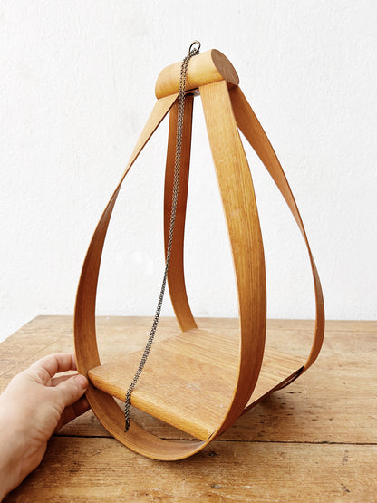 Sculptural bentwood hanging shelf. Delicate chain hanger.