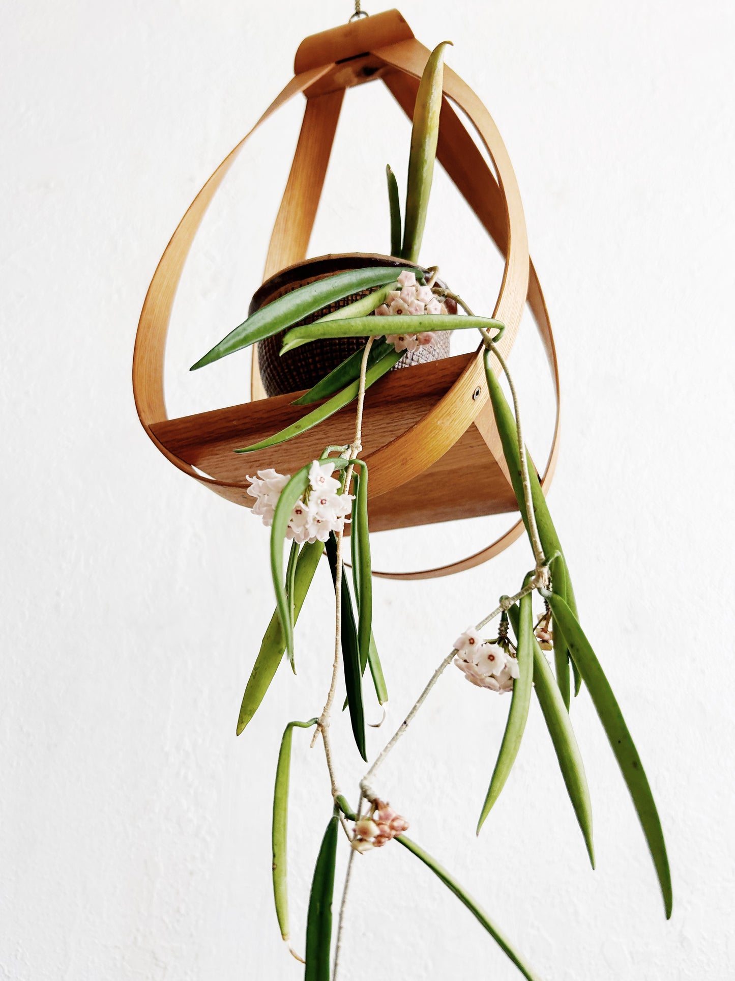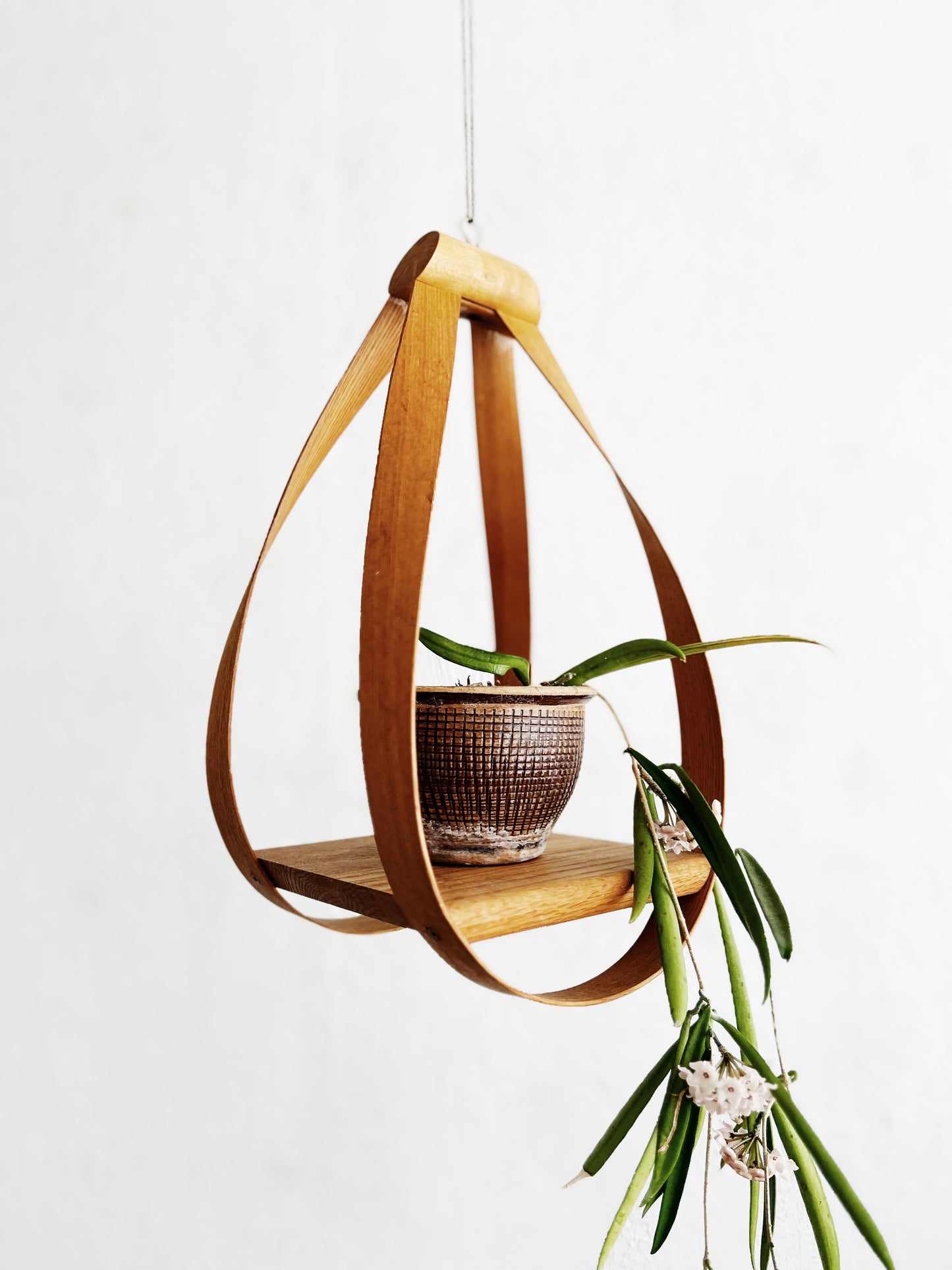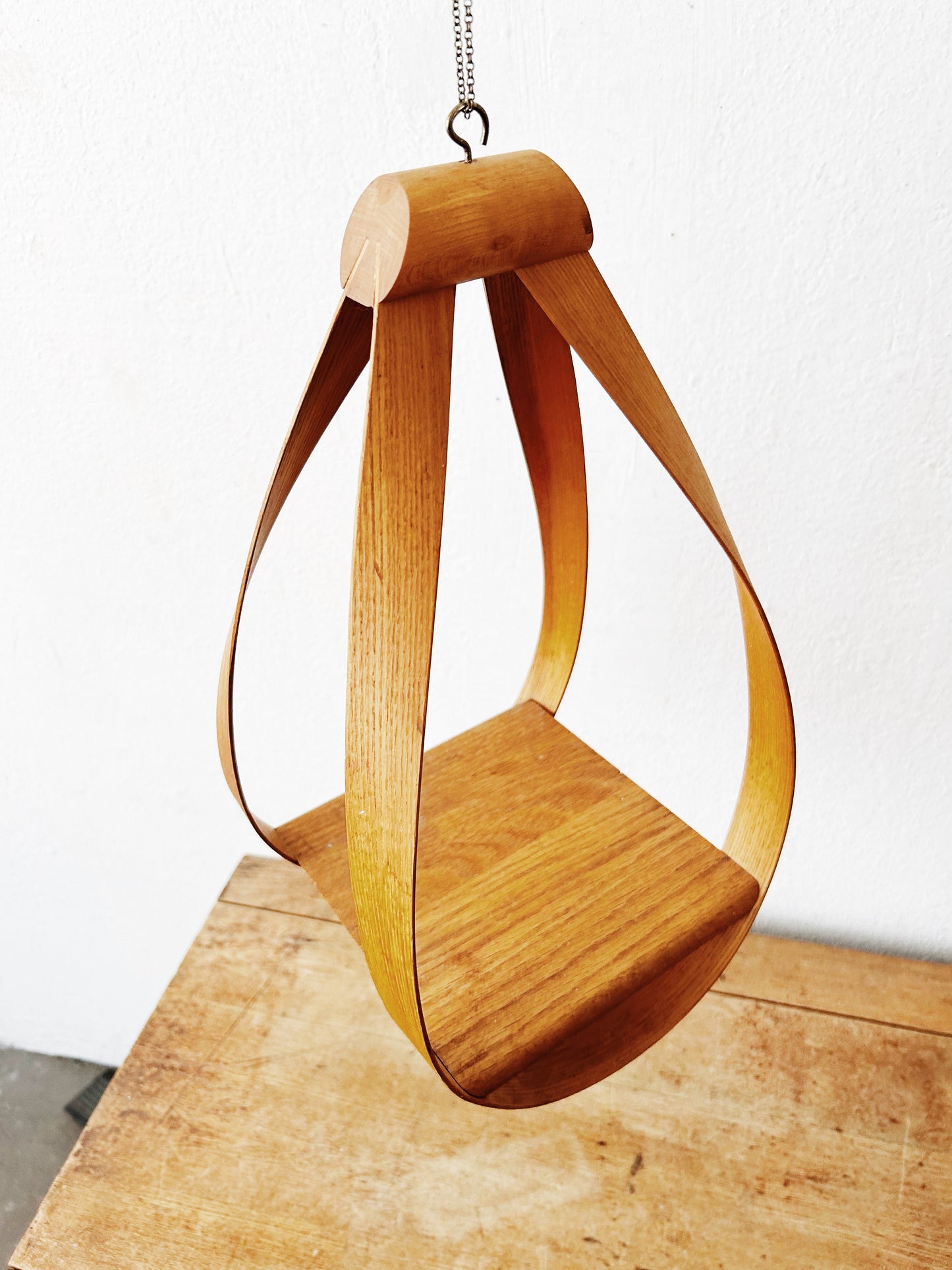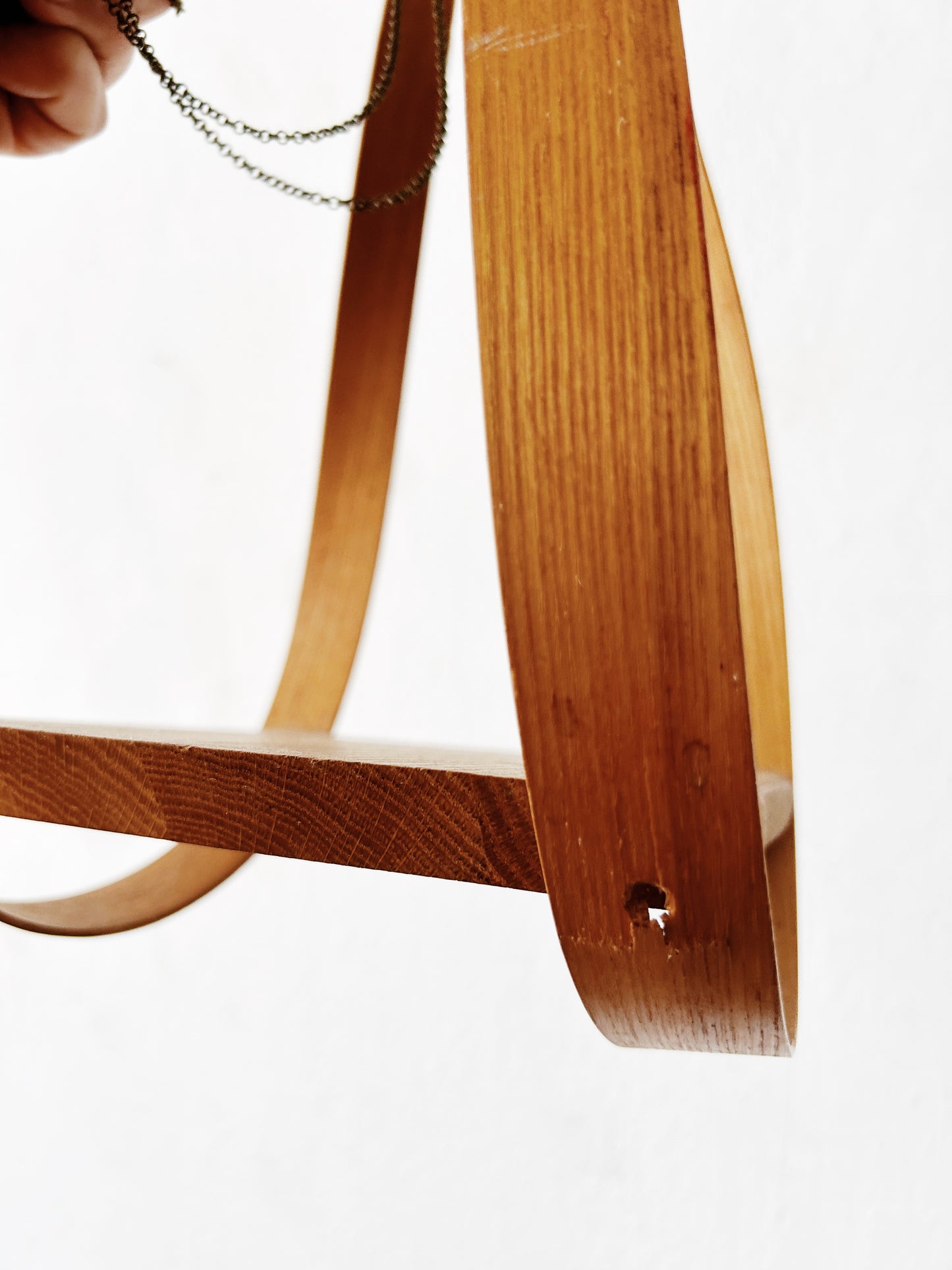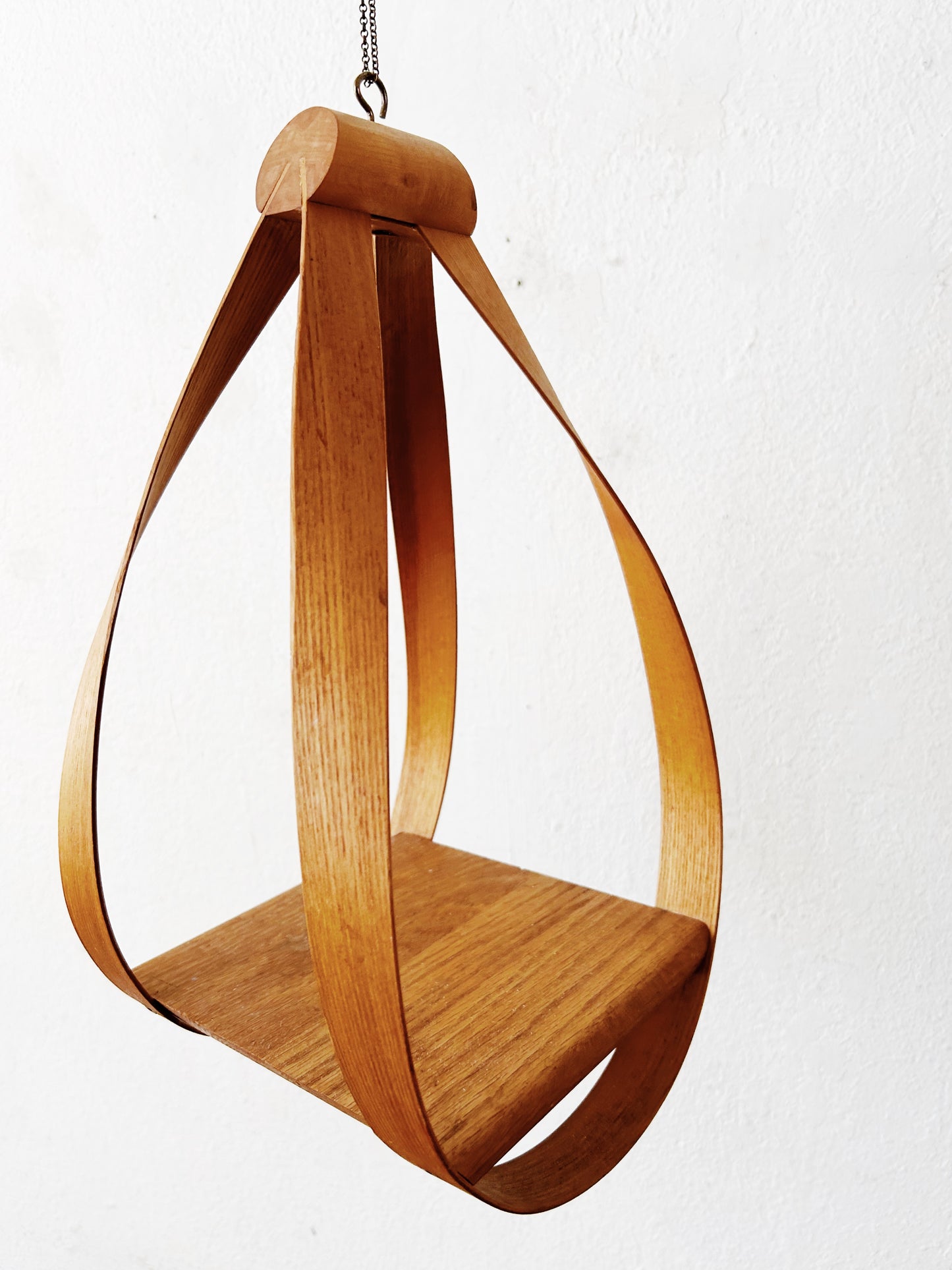 Sculptural bentwood hanging shelf. Delicate chain hanger.