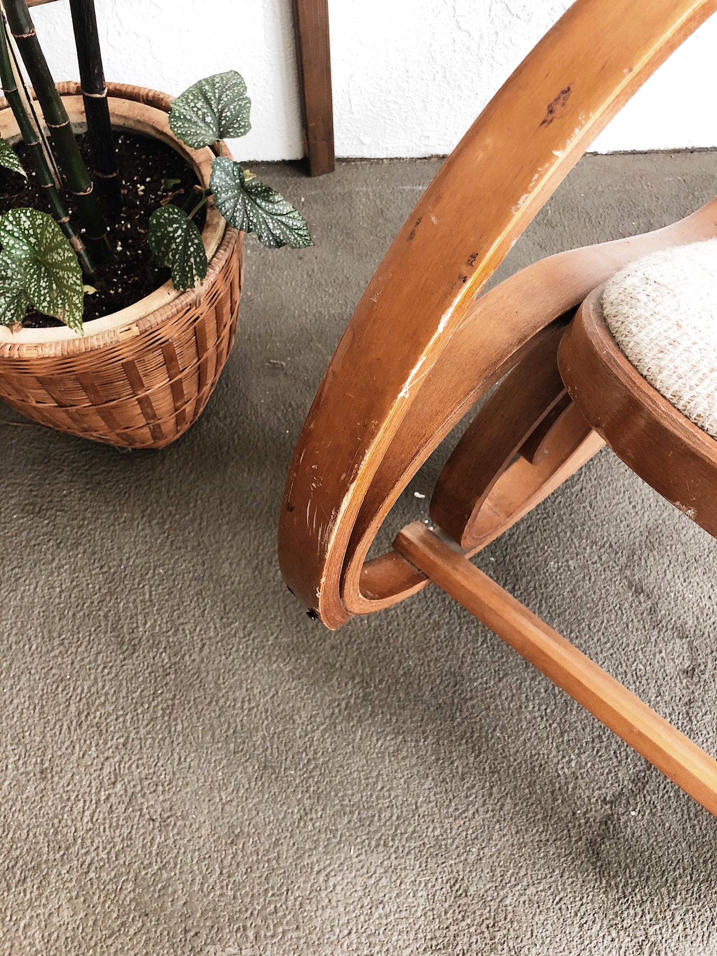 Fantastic Bentwood rocker in the style of Thonet. Most of these vintage ones were made in California or Romania. The upholstery on this one is nubby oatmeal, and in good condition. The bends are stable though the wood has some surface wear.