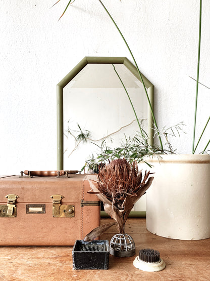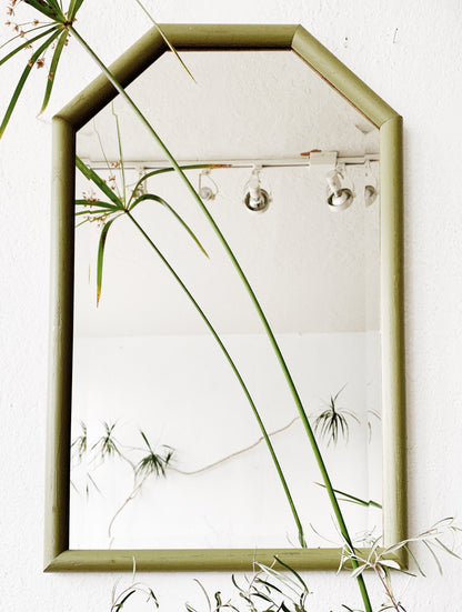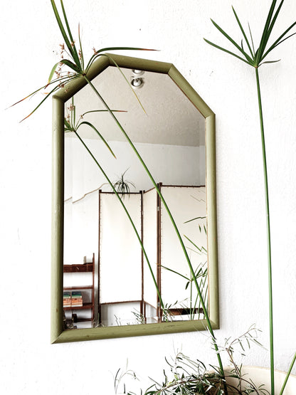 Nice looking vintage beveled mirror. Painted a missy green, wood with hanger on back. Lightweight and in great condition.