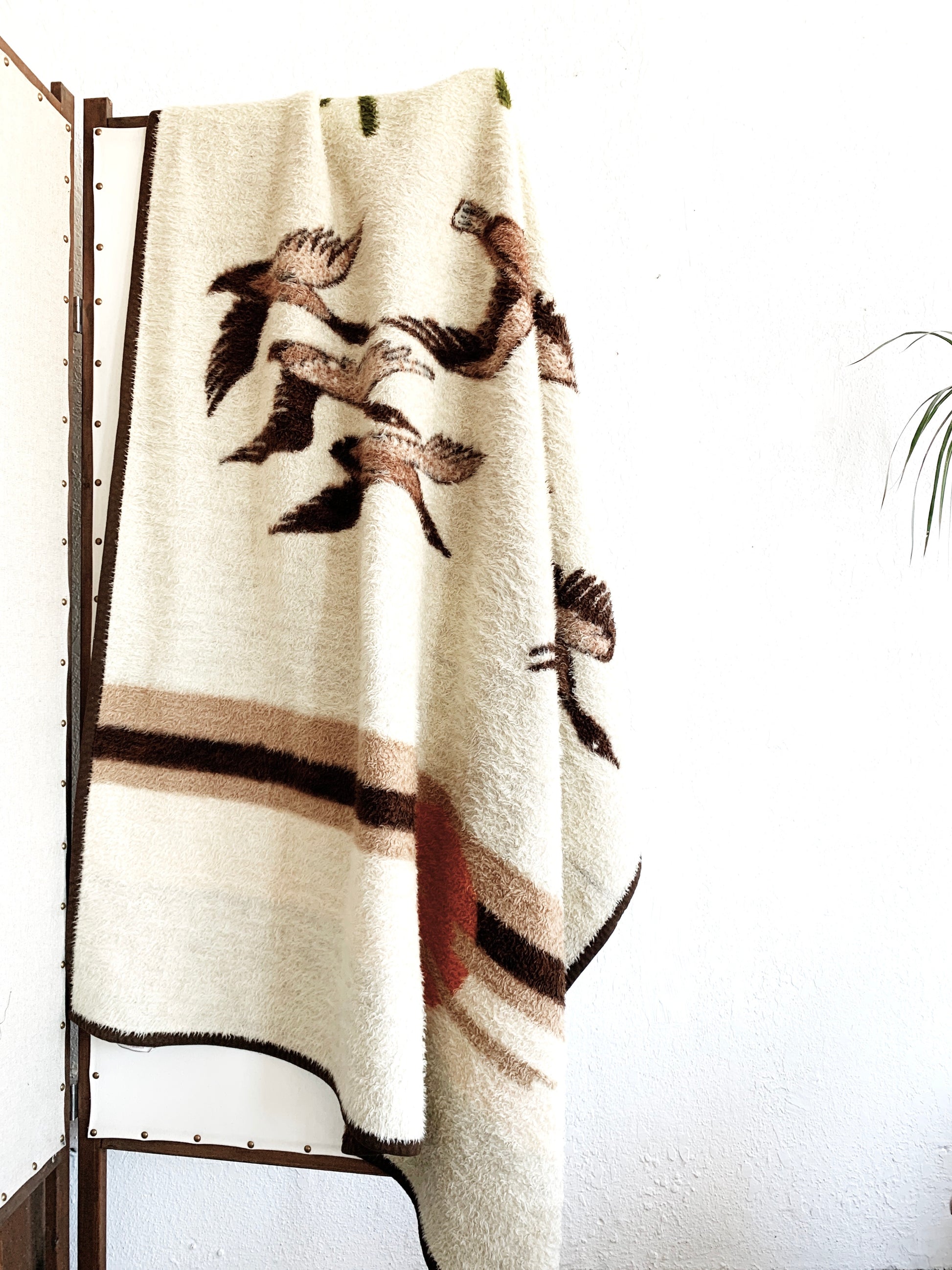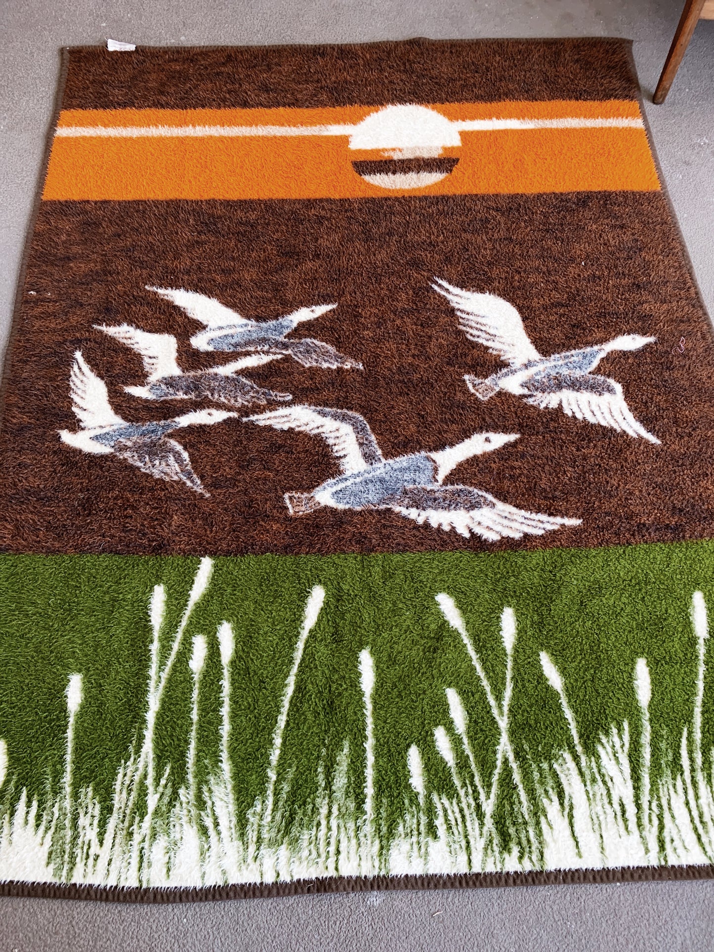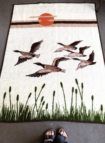 Vintage plush Biederlack reversible blanket with cattails, geese and setting sun. Soft and washable ! Acrylic. USA made. It has one small hole, see photos.