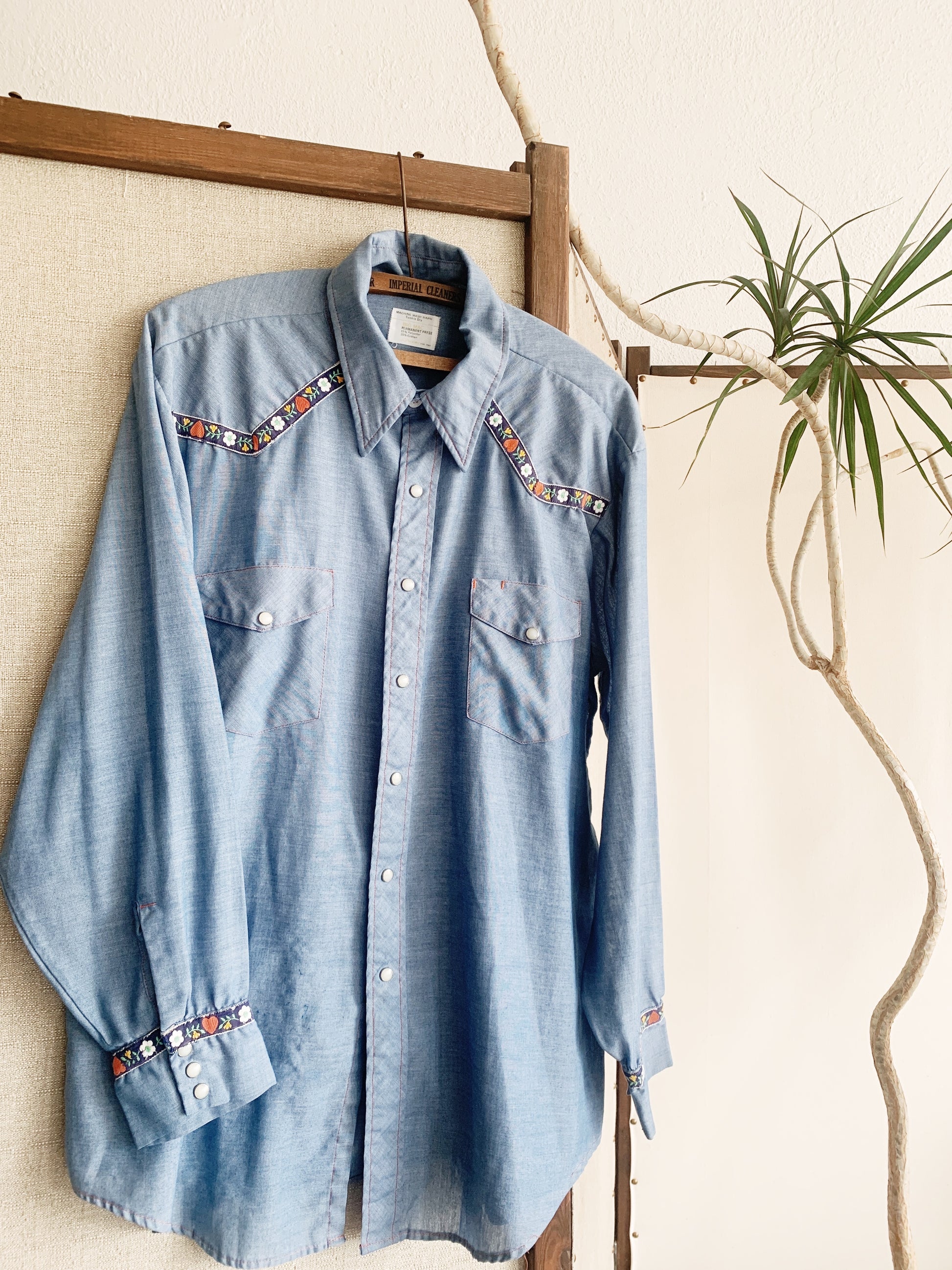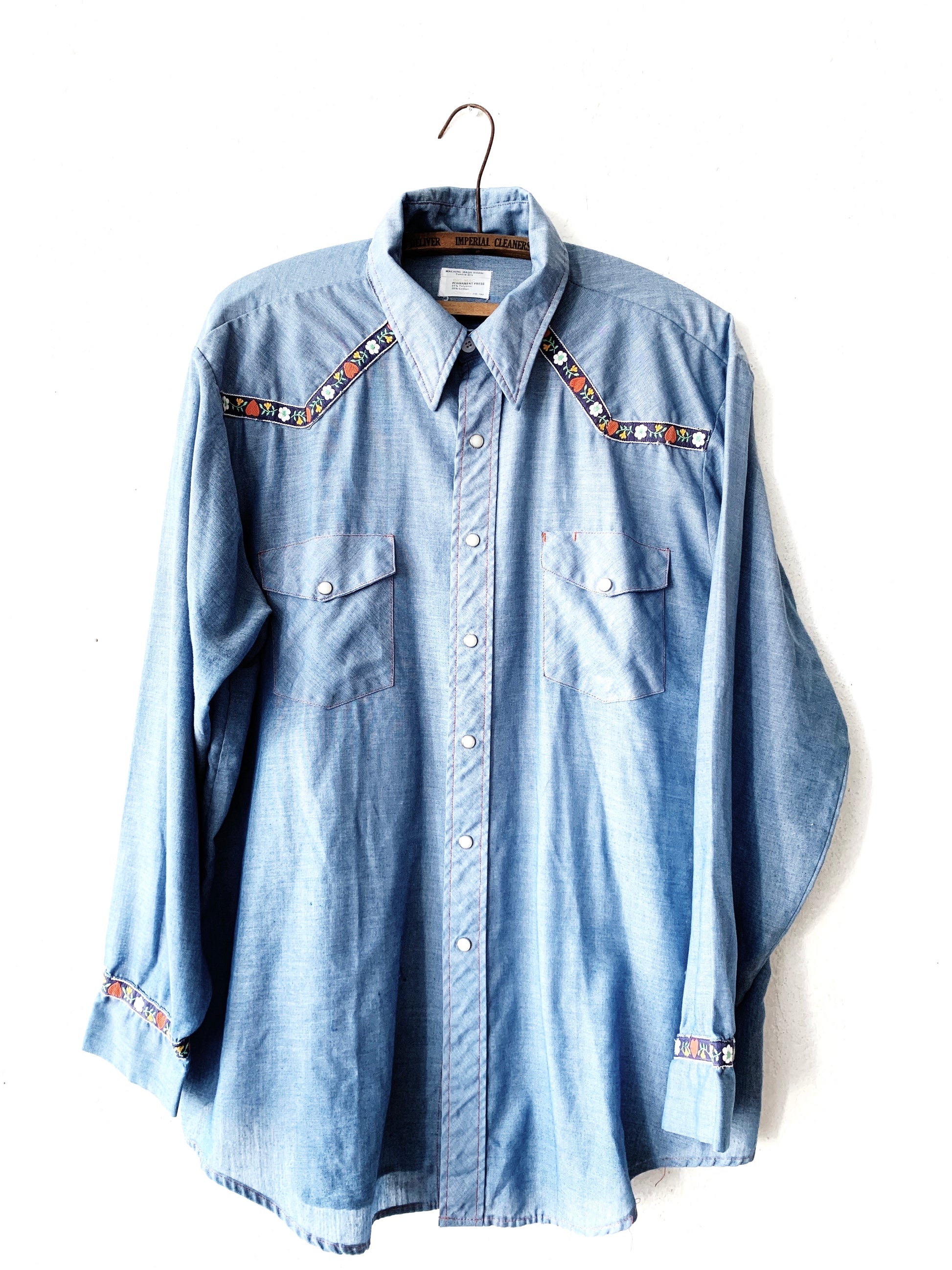 Feather weight chambray vintage Big Mac with embroidery and Pearl snap buttons. Perfect! Size L/XL
