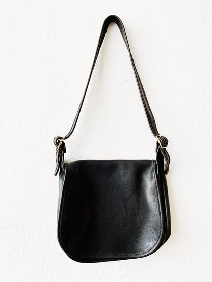 Black leather coach, vintage 80’s in excellent condition. Has an internal zip pocket, main compartment and front pocket under the flap. Adjustable strap.