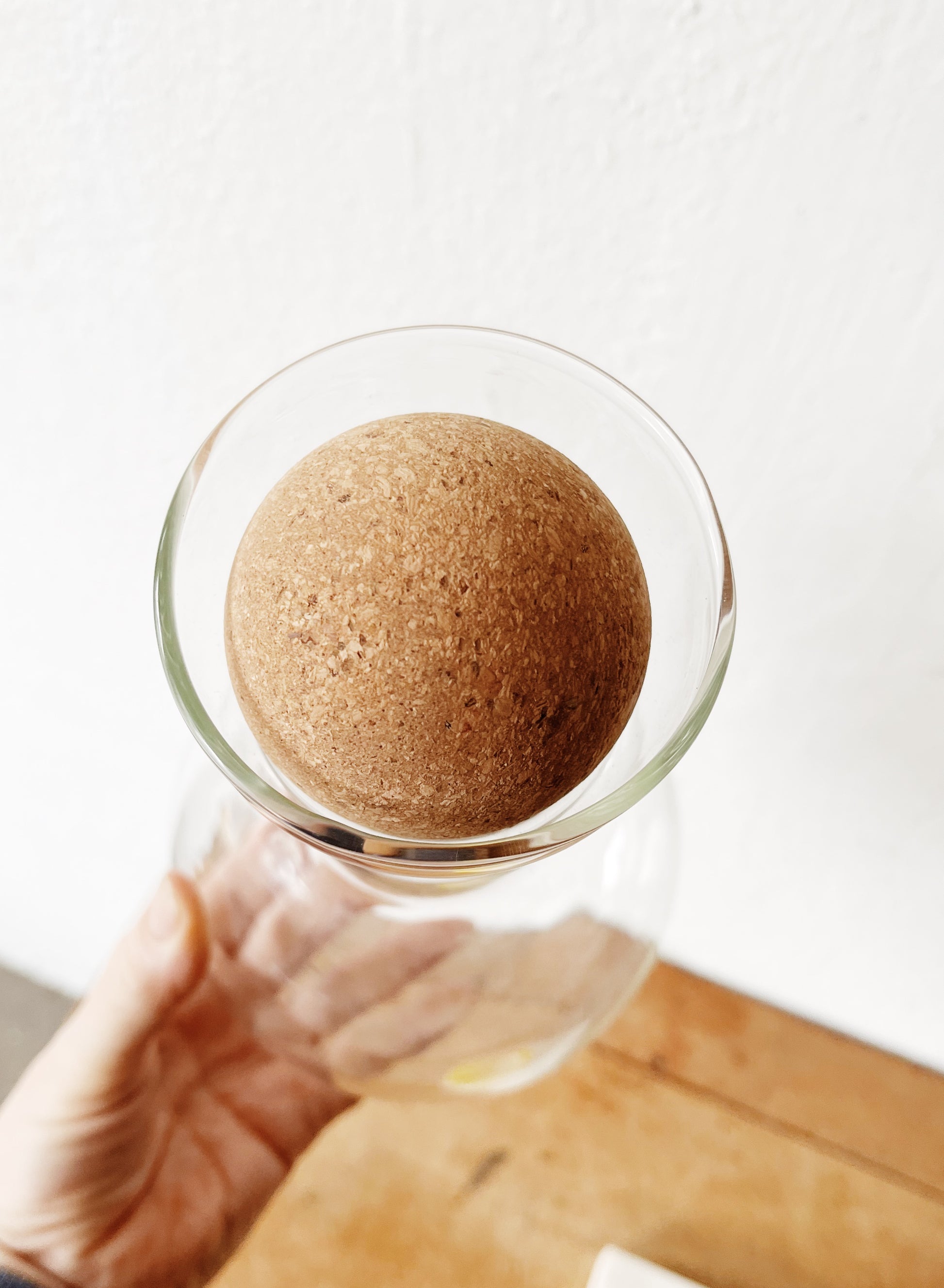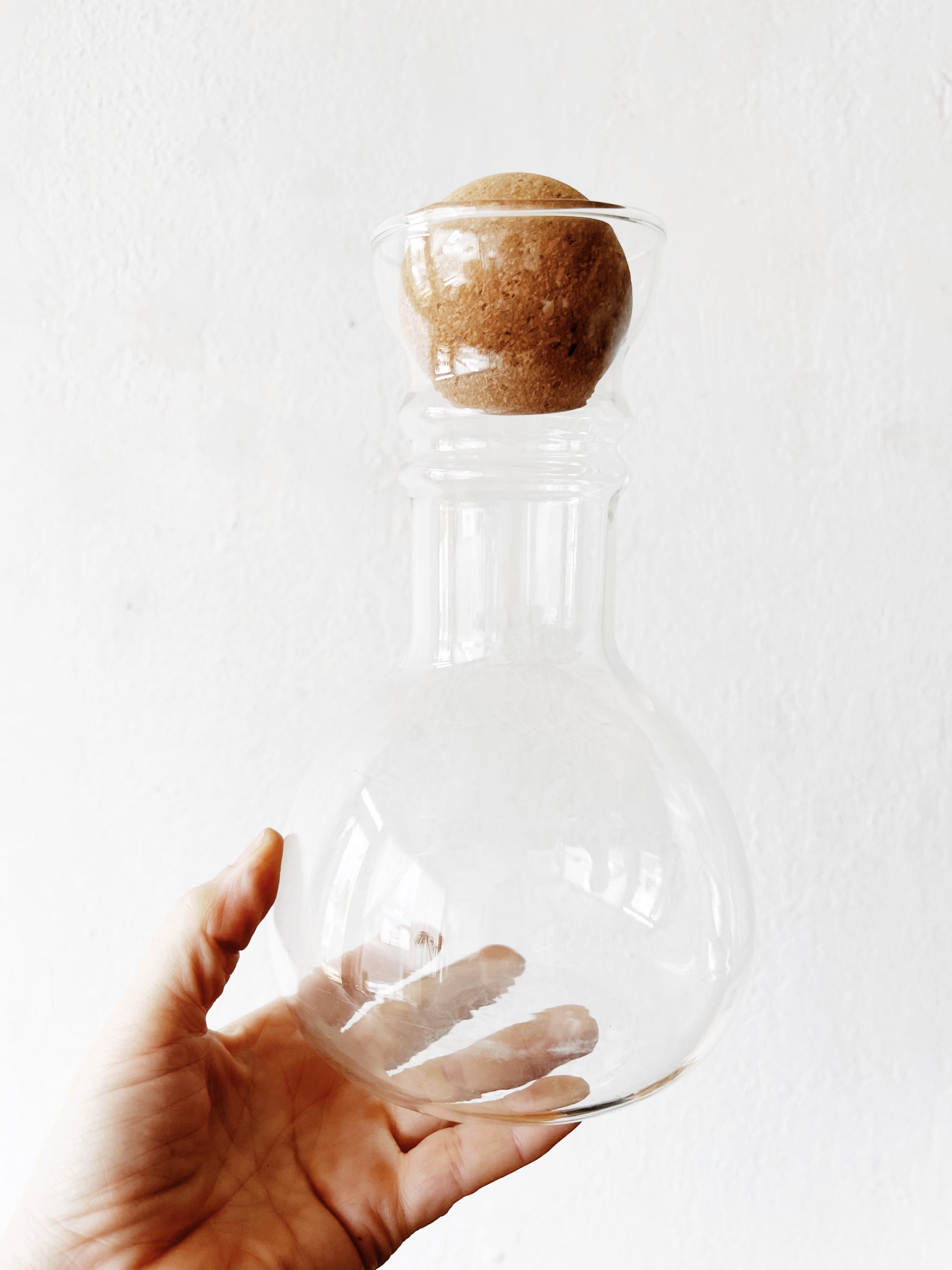 Lovely vintage blown glass Pyrex decanter with cork ball stopper. Great looking and useful! For cold liquids only