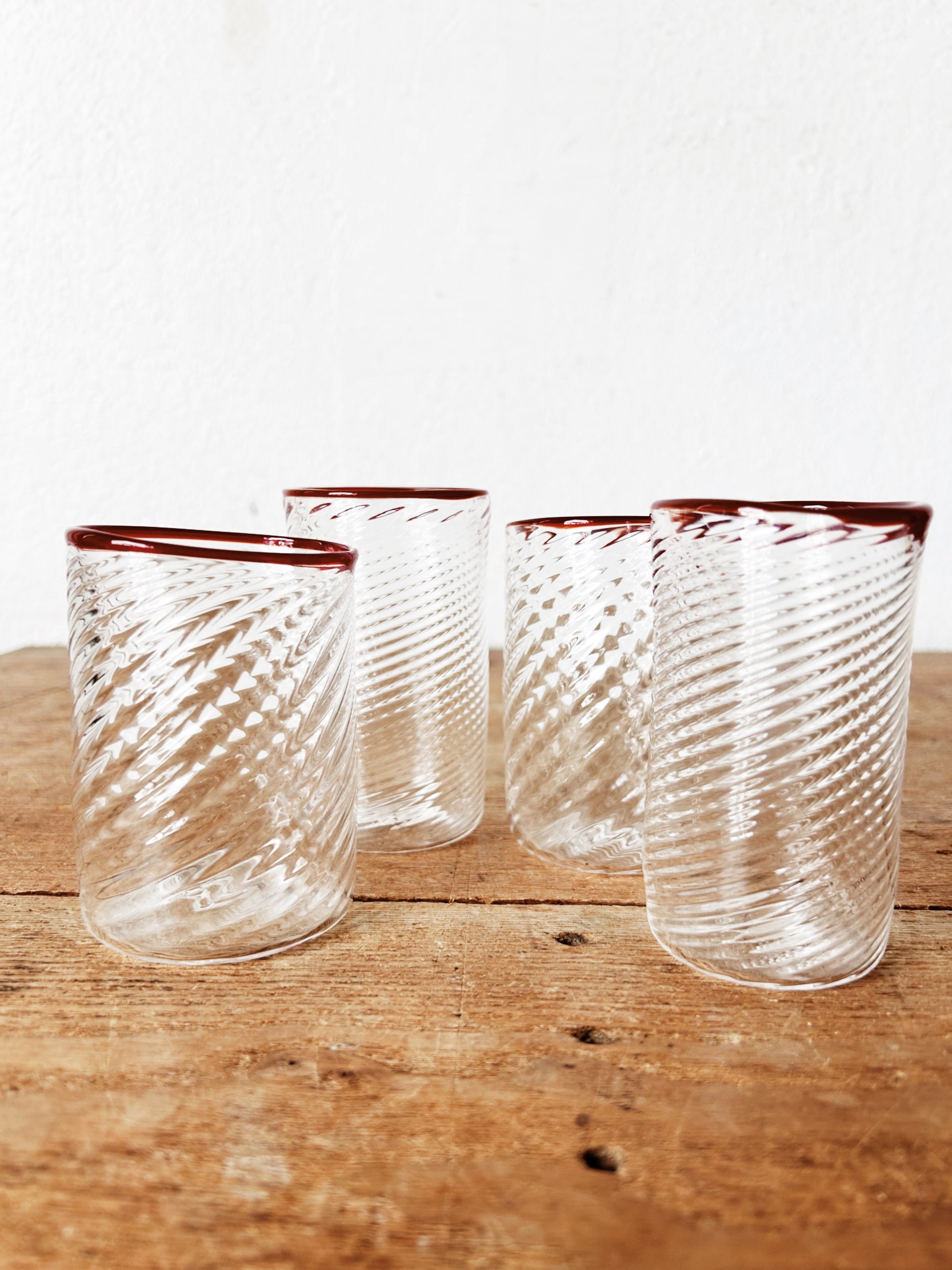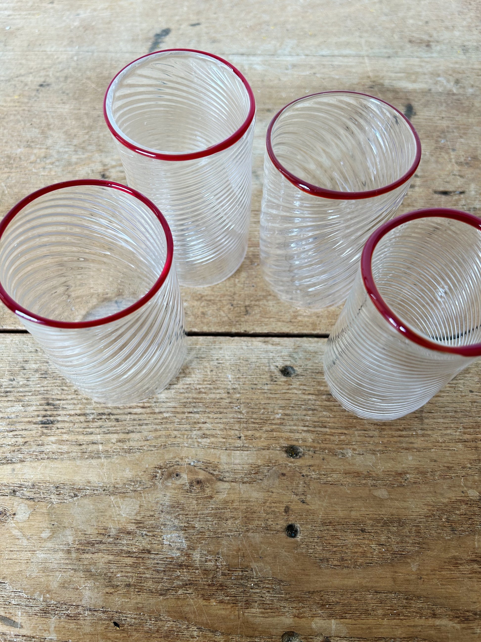 Very pretty hand blown glasses. All slightly different in shape. Cherry red rims. Perfect condition, set of four.