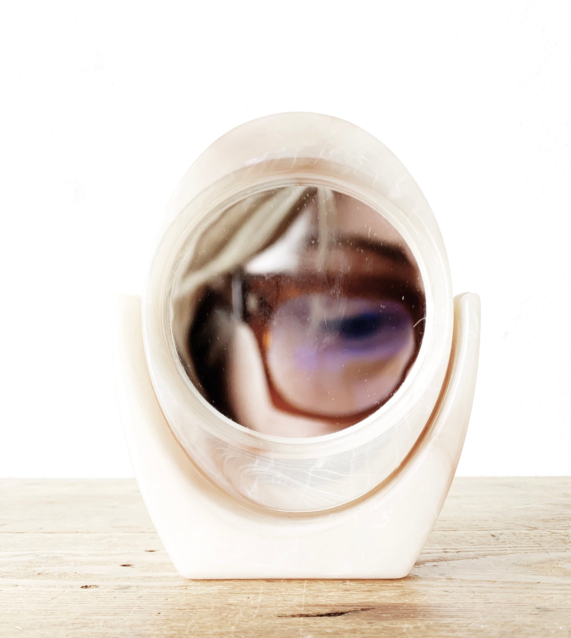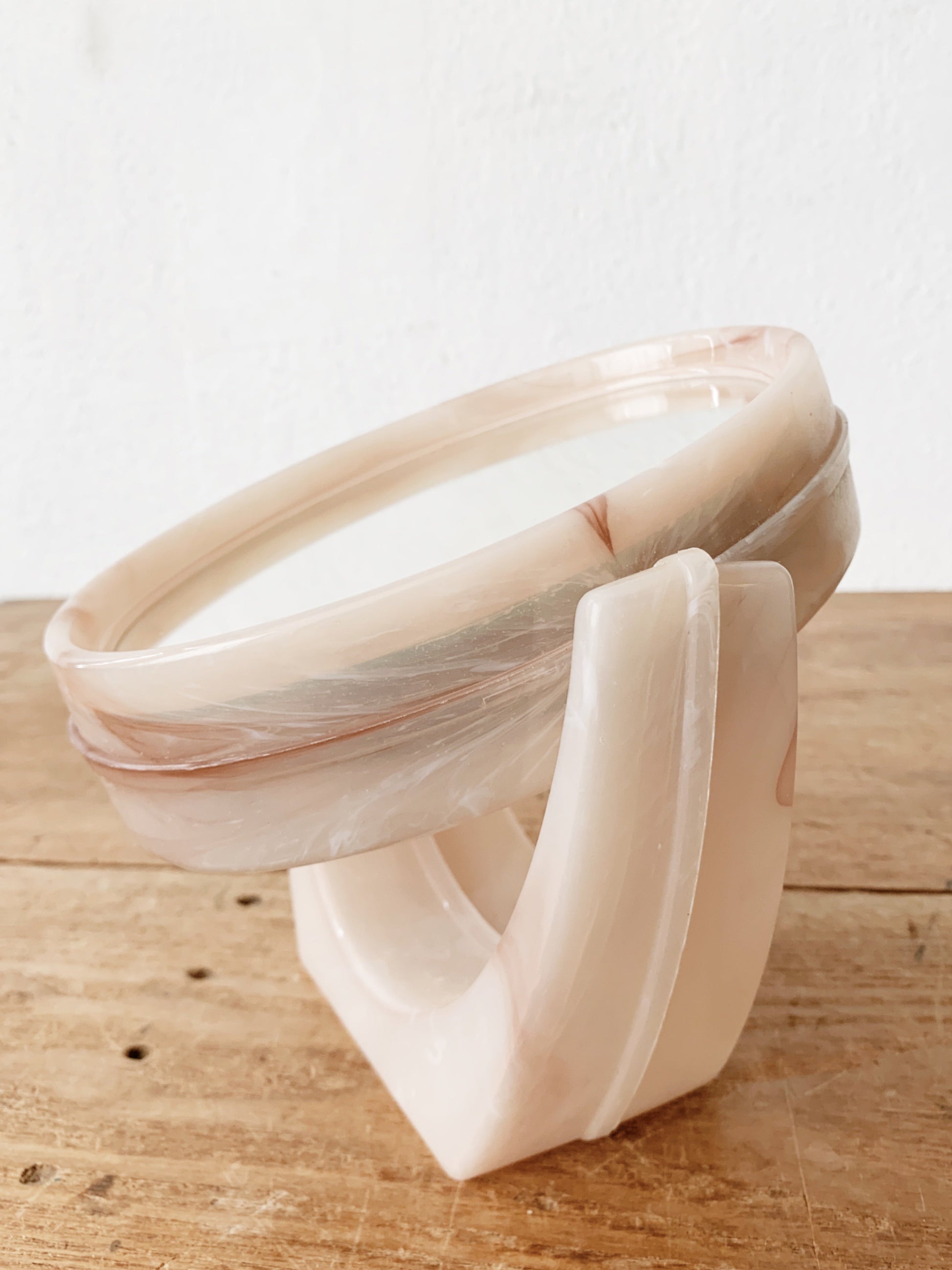 Vintage vanity mirror in pretty marbleized blushy light pink. One side magnifies.