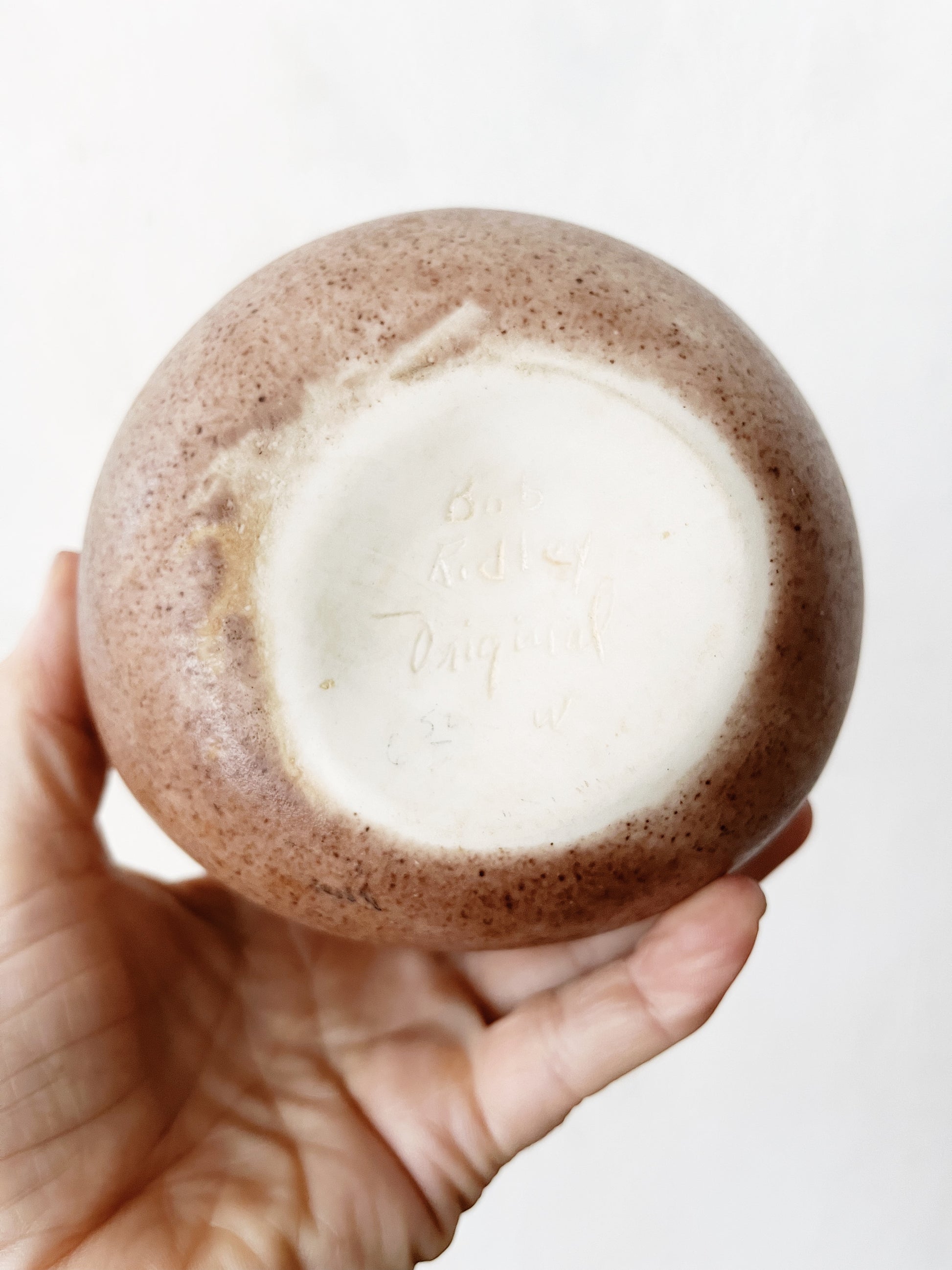 Biomorphic shape on this mid century Bob Ridley vase. Works as a pourer too. Matte mottled glaze
