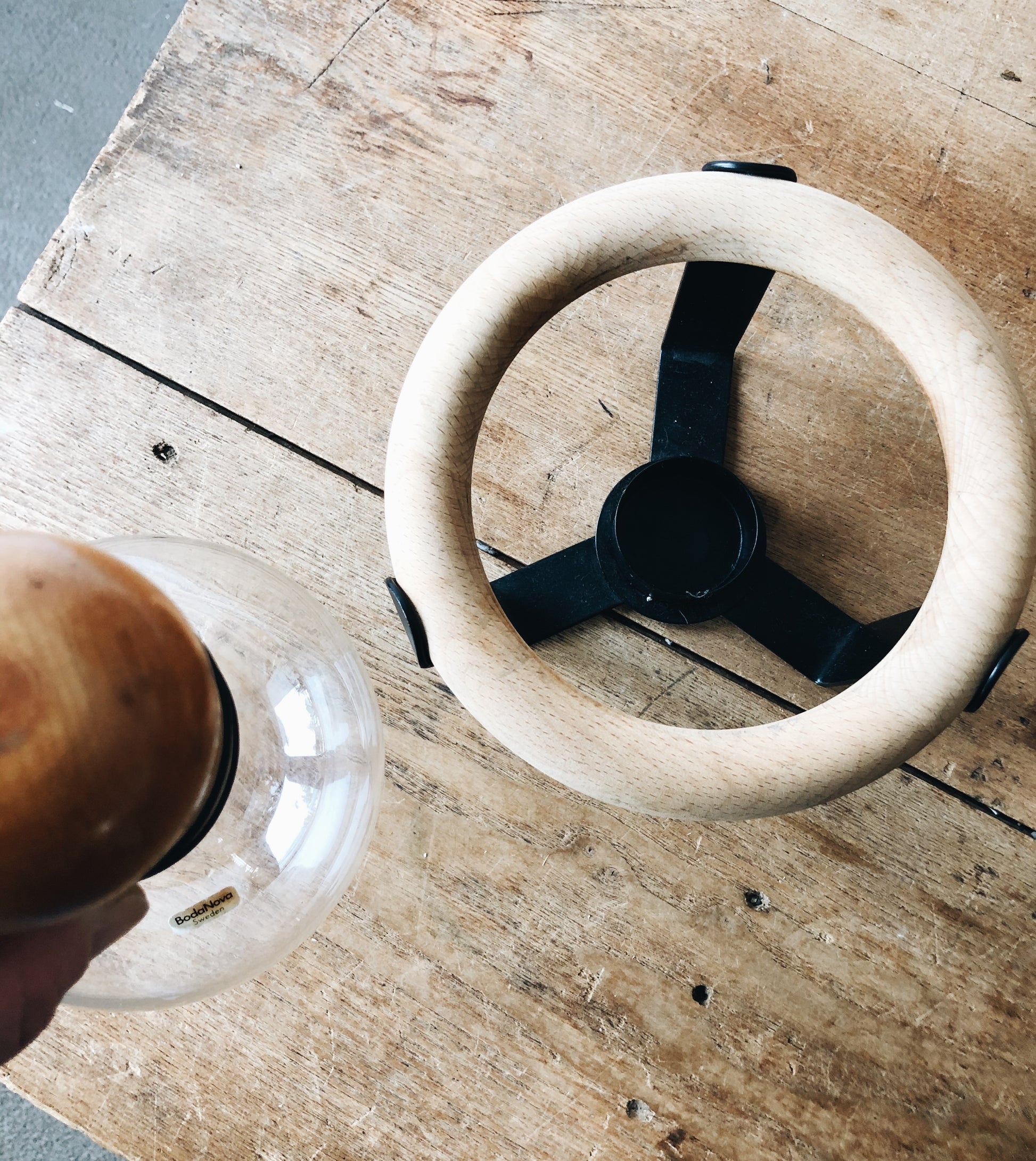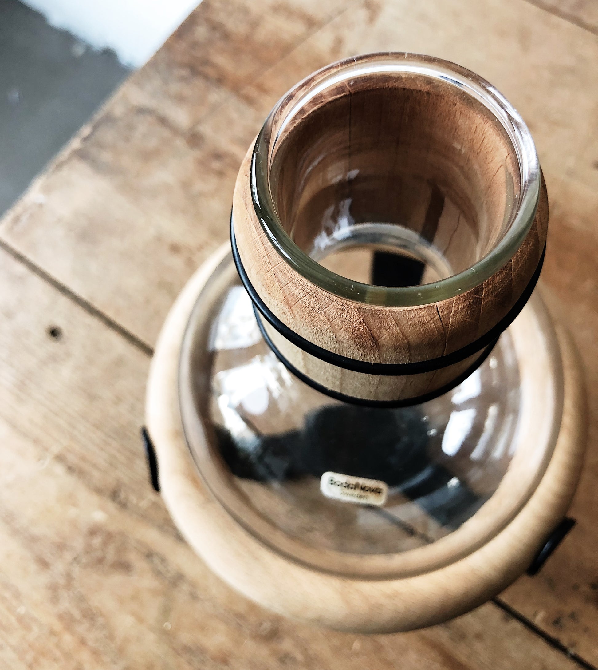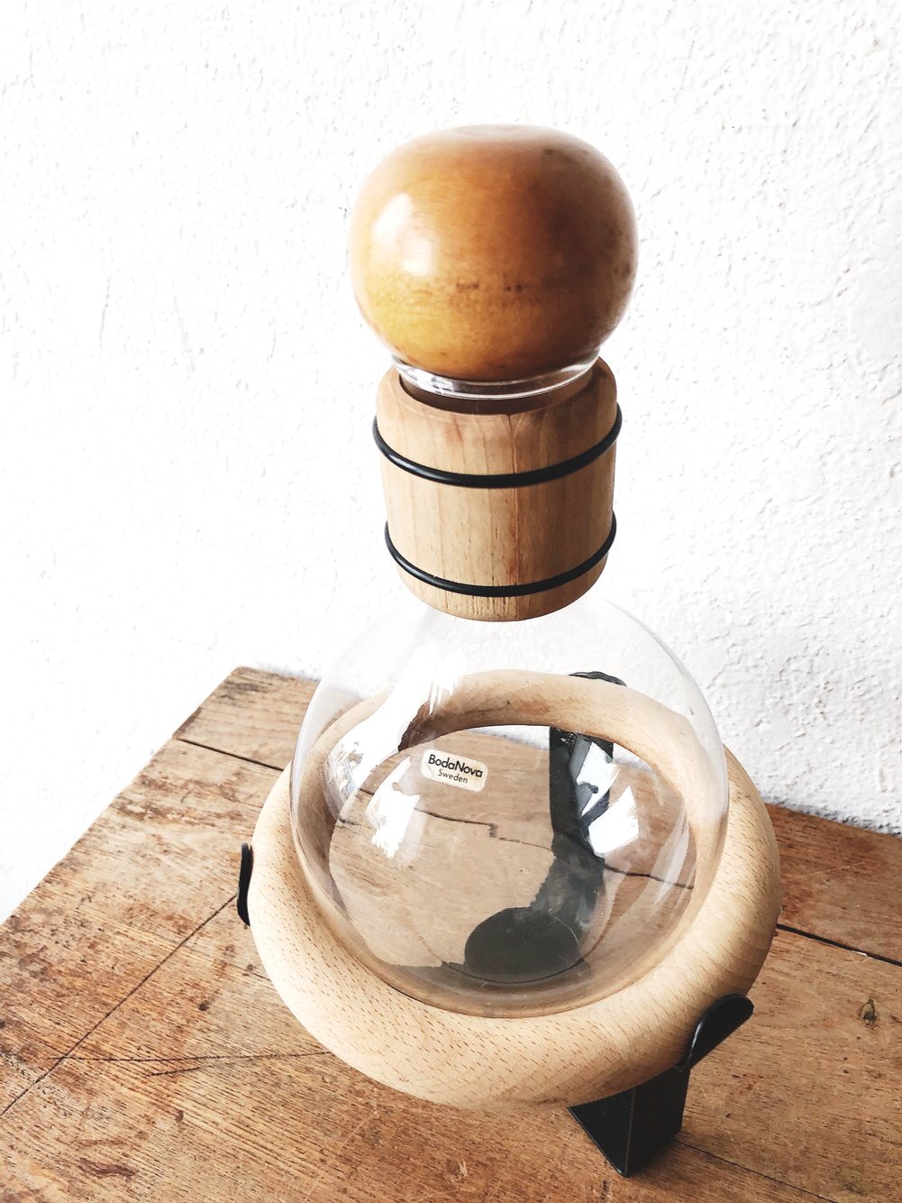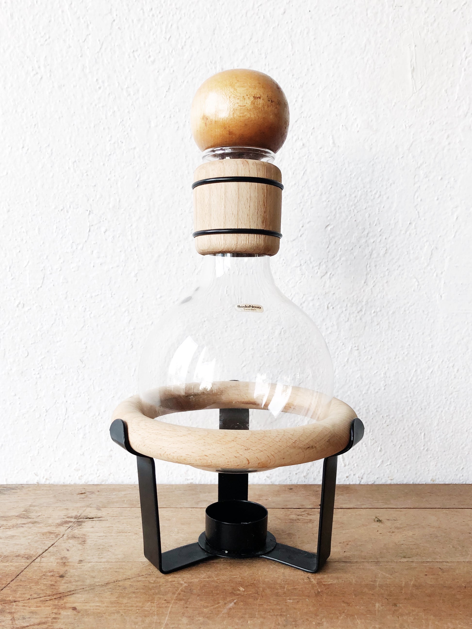 Nearly impossible to find, this vintage Boda nova coffee warmer is in like new condition. Designed by Ulf Hansen for Boda Nova Sweden. Comes with the glass carafe, stopper, stand and wood ring