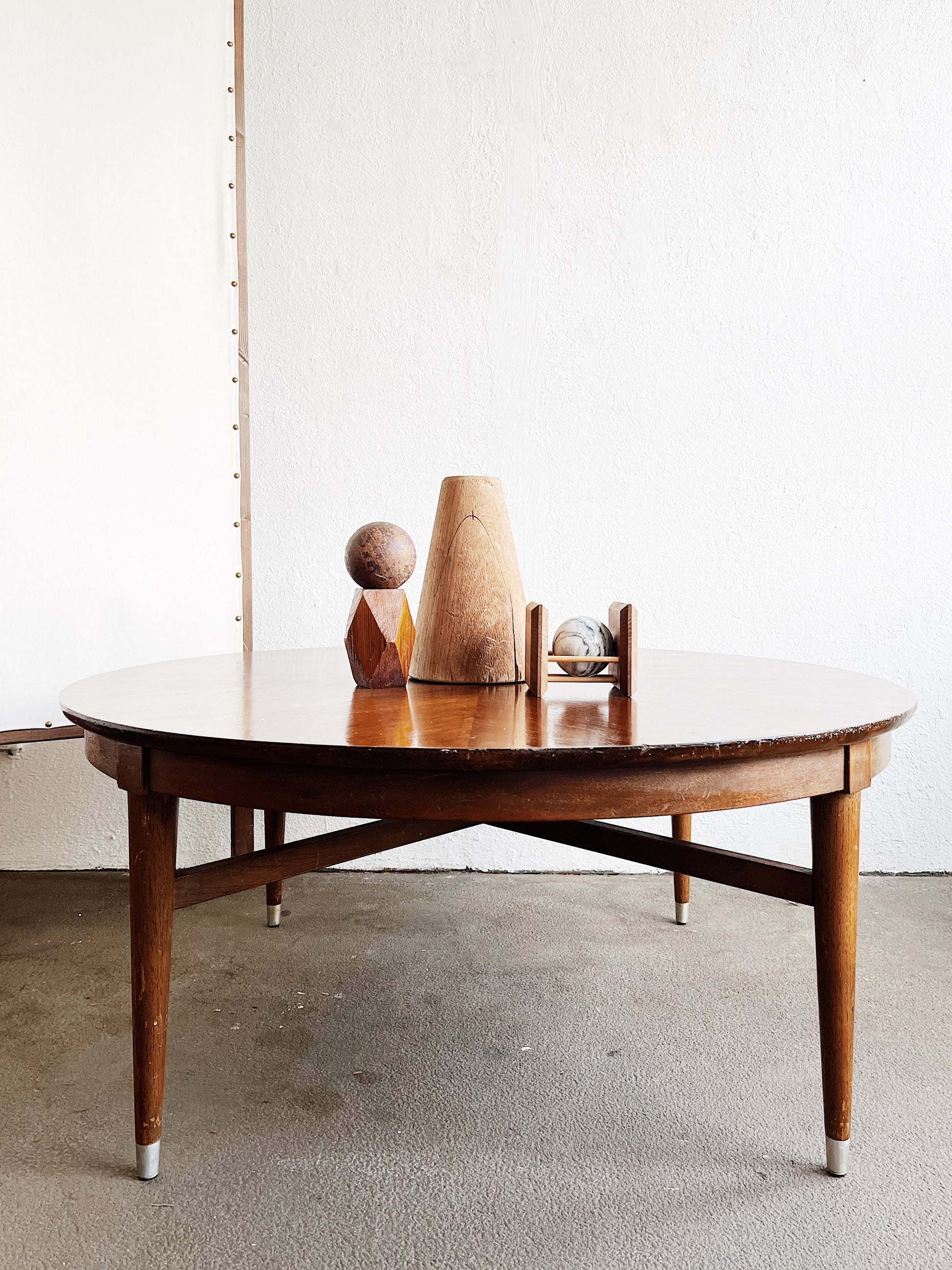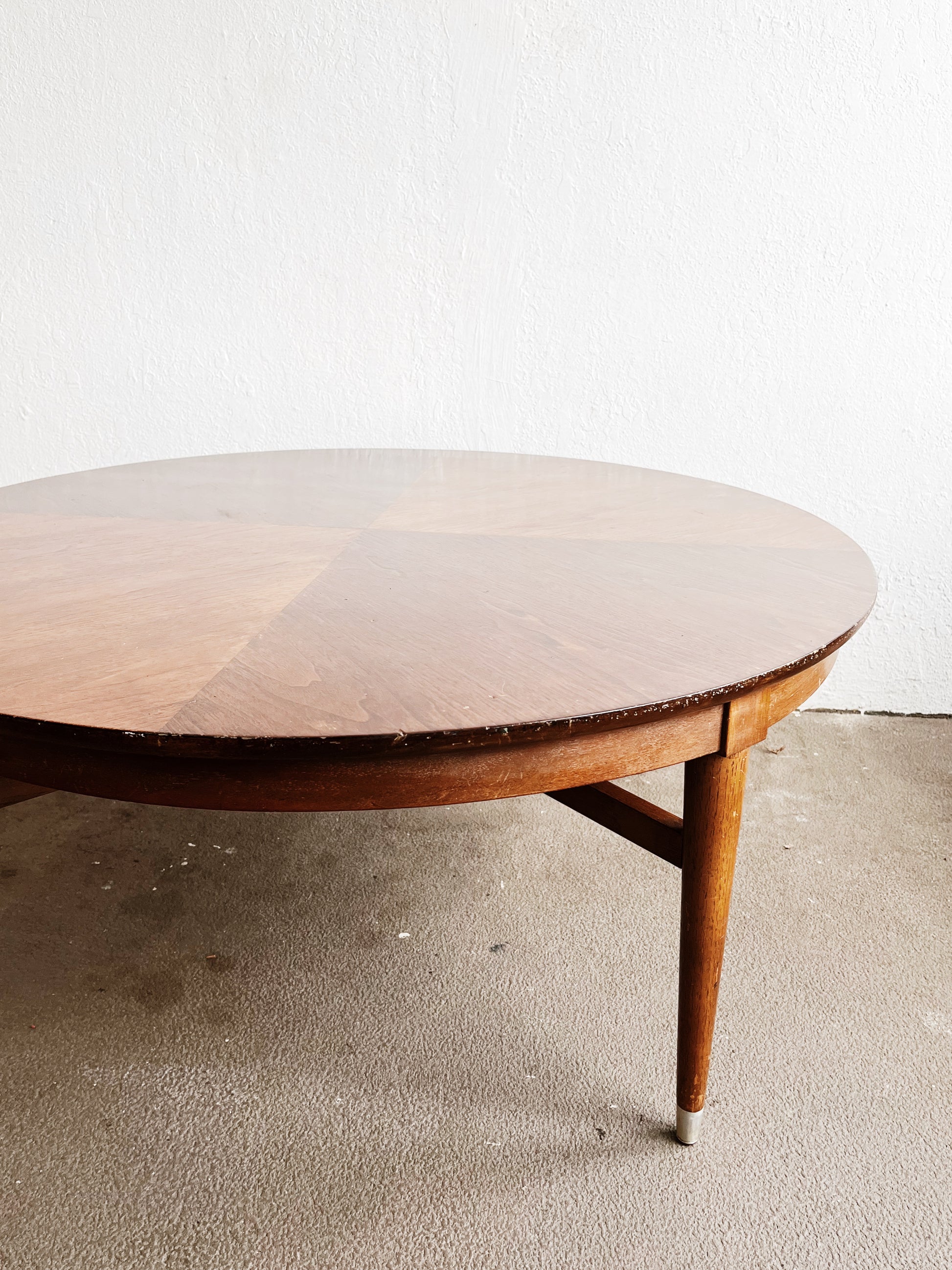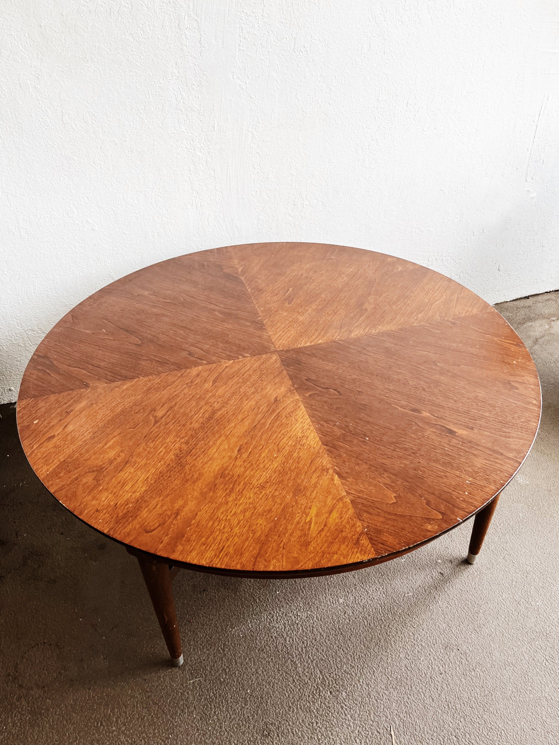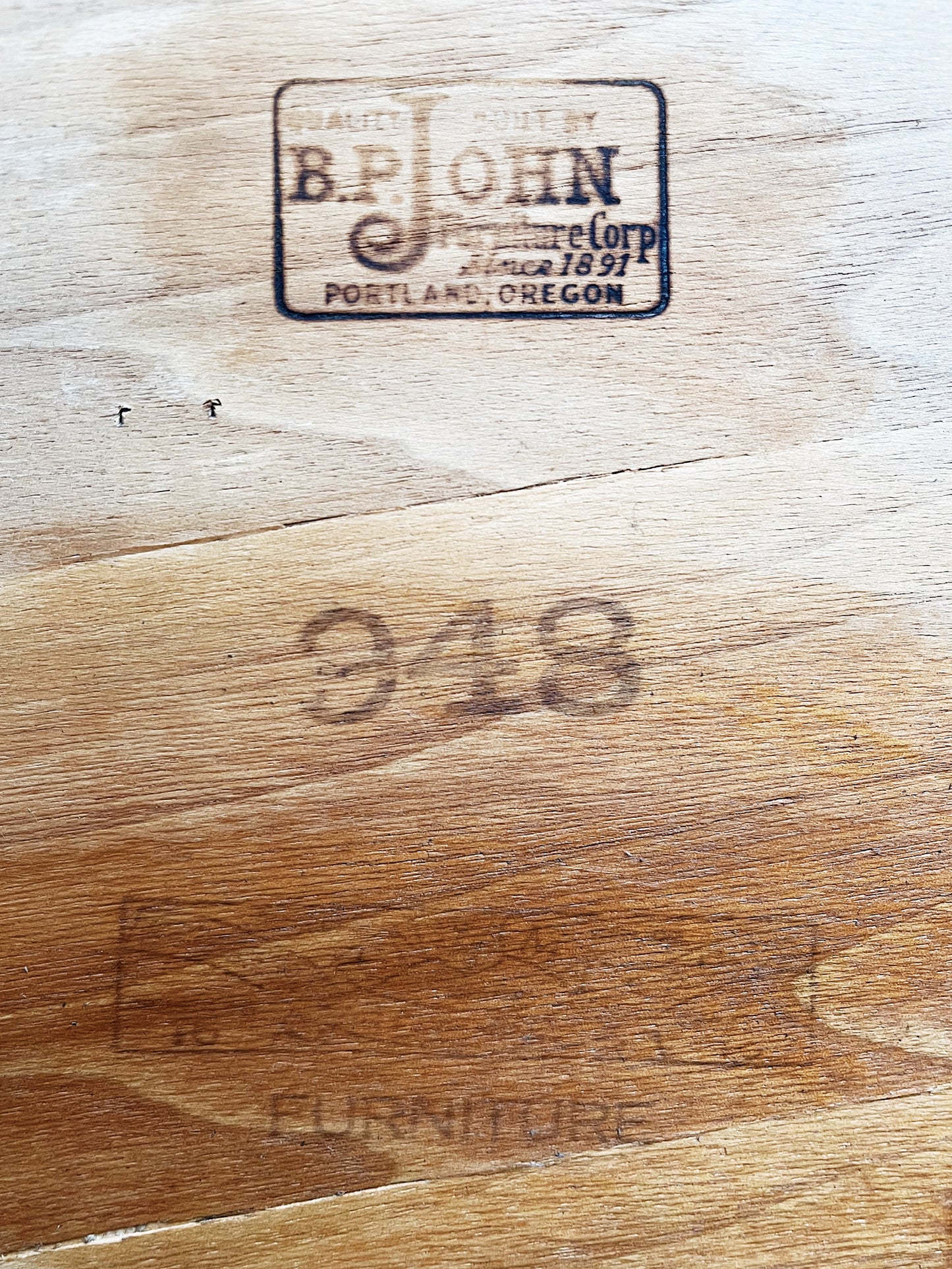 Mid century coffee table in a rarer round shape by iconic and local furniture maker B P John. Designing and manufacturing right here in Portland from the late 1800s until they closed in 1977, John’s designs tended to mimic the styles of the era. This one was fashioned after the Danish designs of the mid century. Stamped and marked below