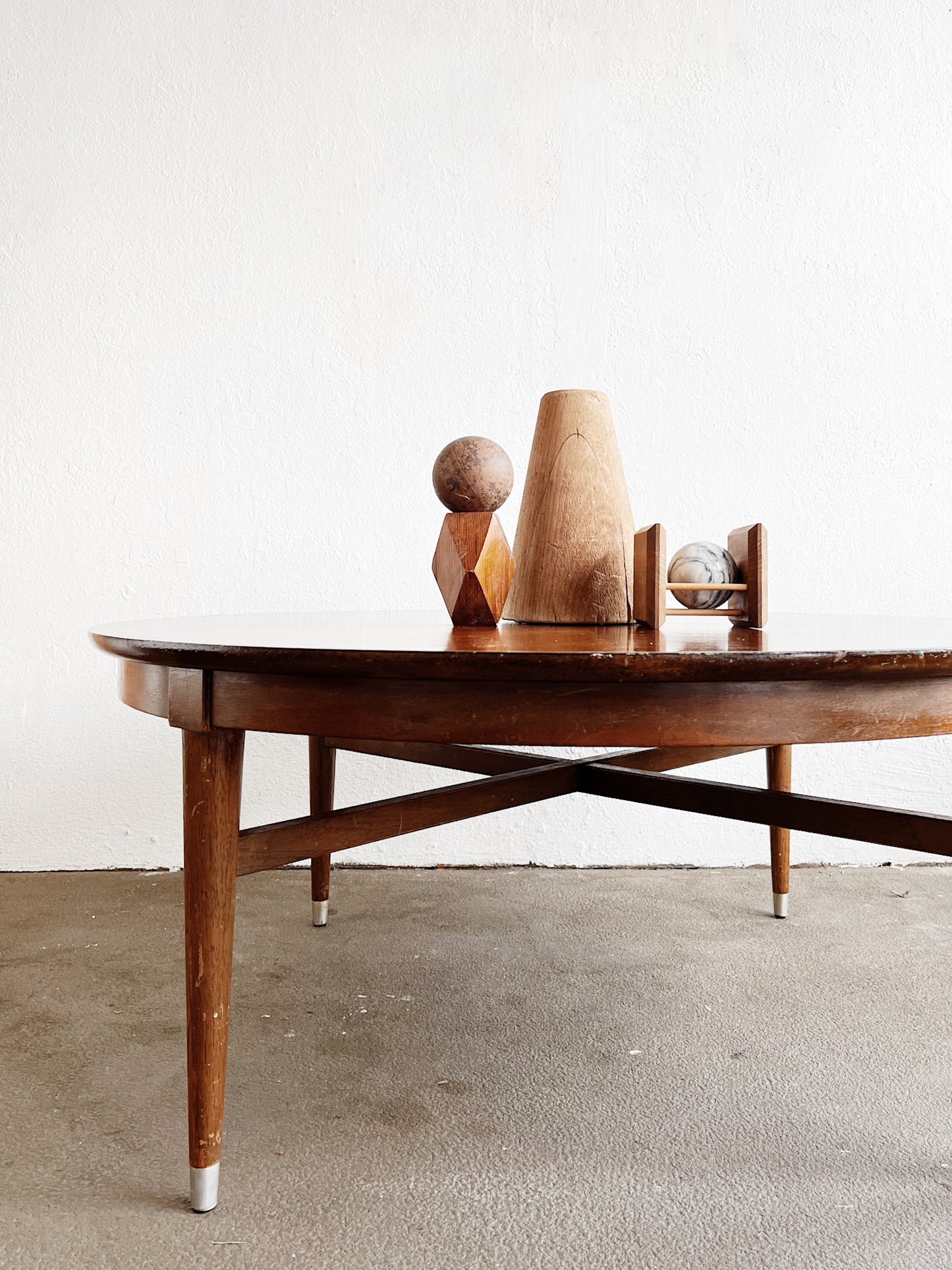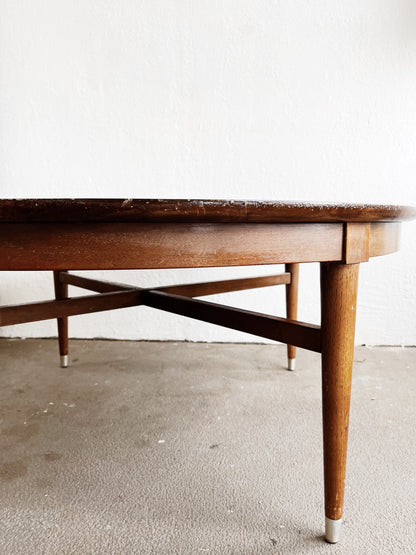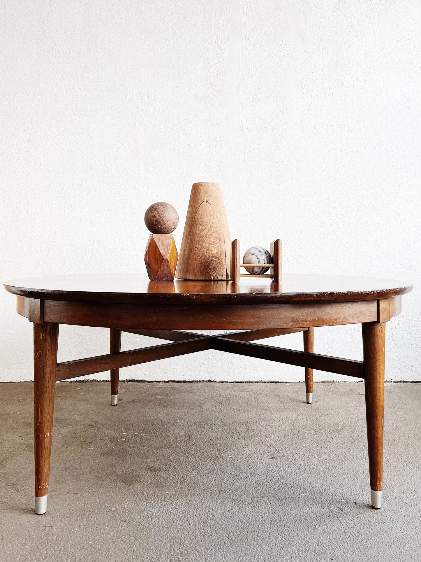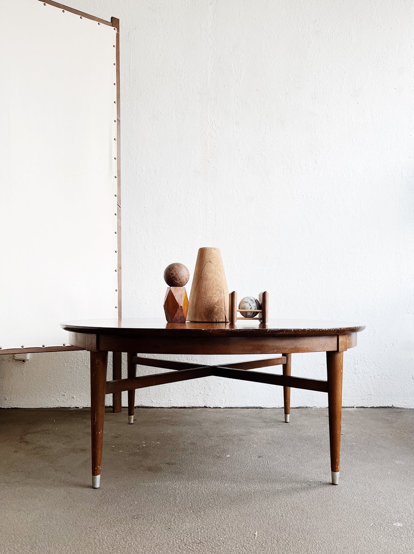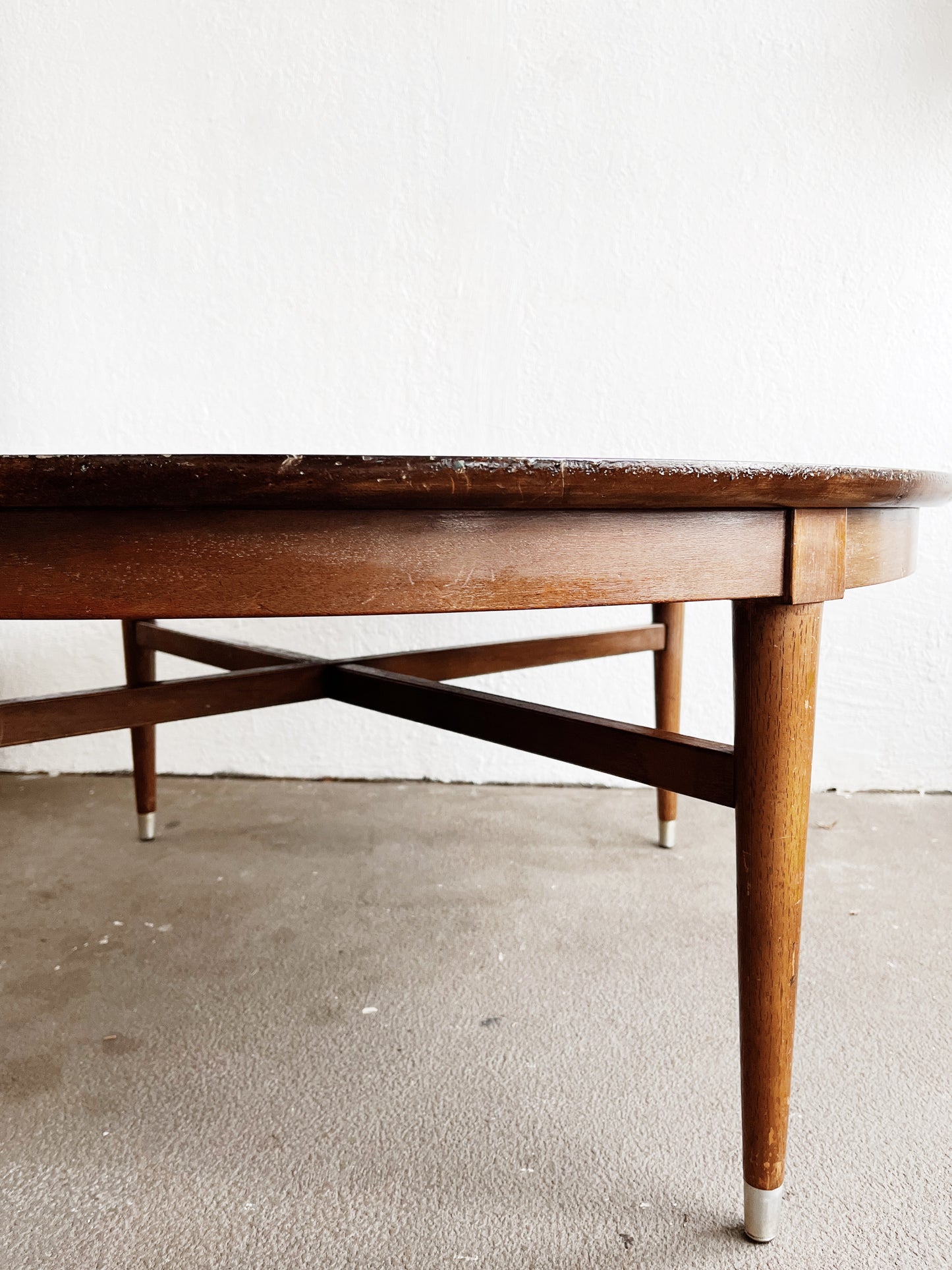 Mid century coffee table in a rarer round shape by iconic and local furniture maker B P John. Designing and manufacturing right here in Portland from the late 1800s until they closed in 1977, John’s designs tended to mimic the styles of the era. This one was fashioned after the Danish designs of the mid century. Stamped and marked below
