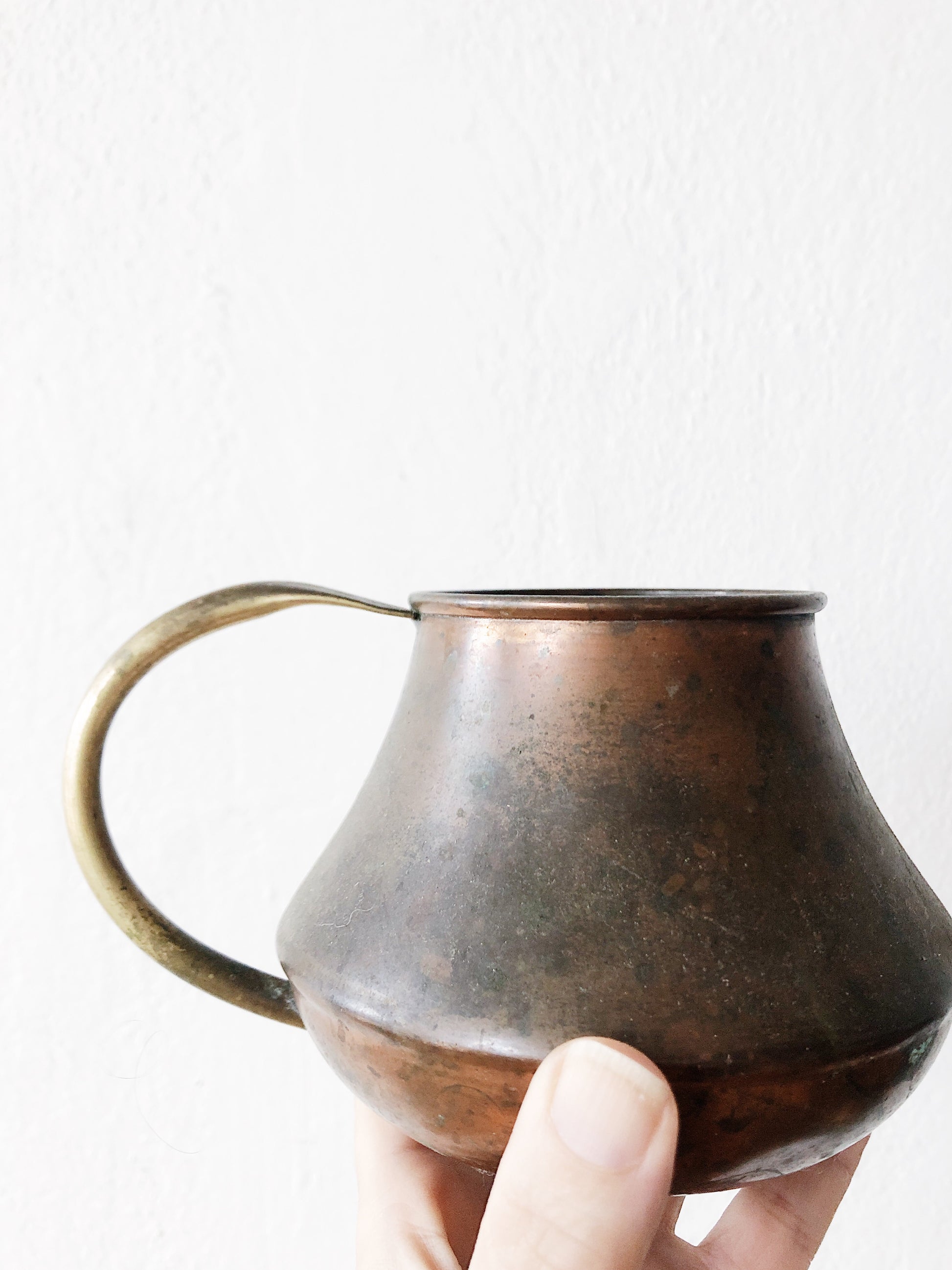 Vintage copper with brass handled watering can with beautiful form! Perfect spout for directional watering of houseplants. Holds enough for about two medium sized plants