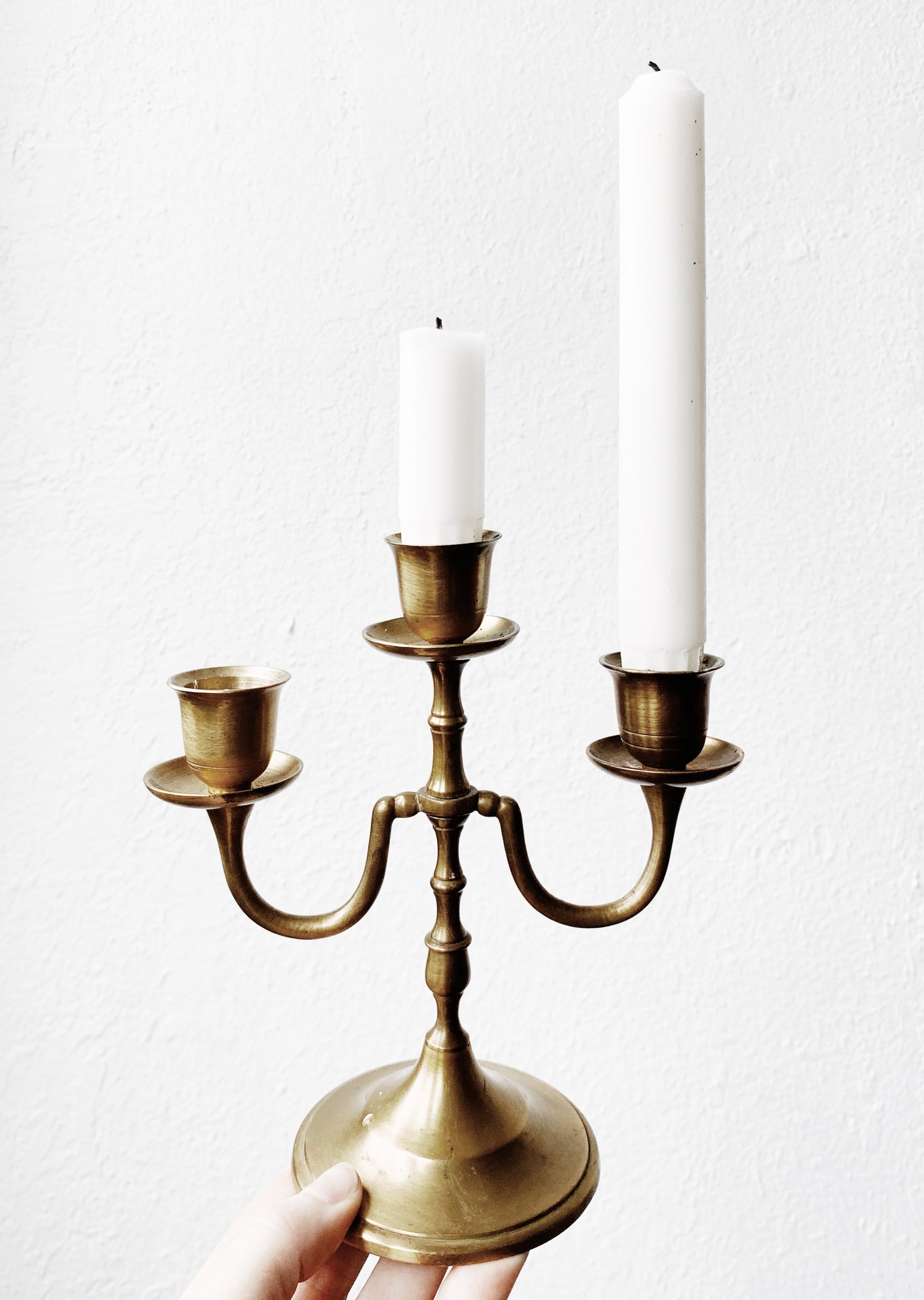 Lovely and simple vintage brass triple candelabra. Nice aged patina. Holds three standard tapers