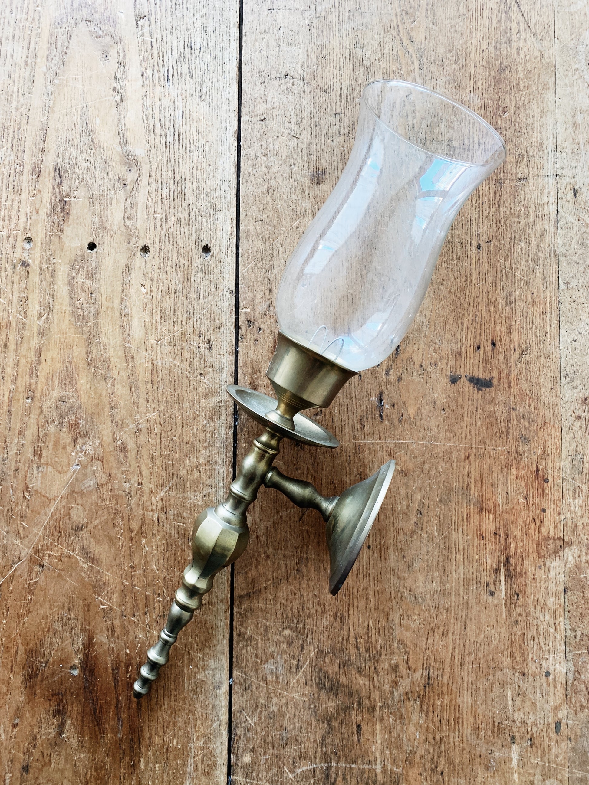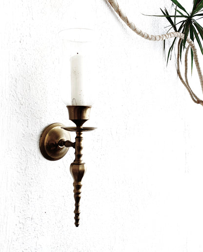 Weighty vintage brass candle sconce with glass hurricane shade. Love this in any room of the house! Such a great old world piece. It is substantial and very well made.