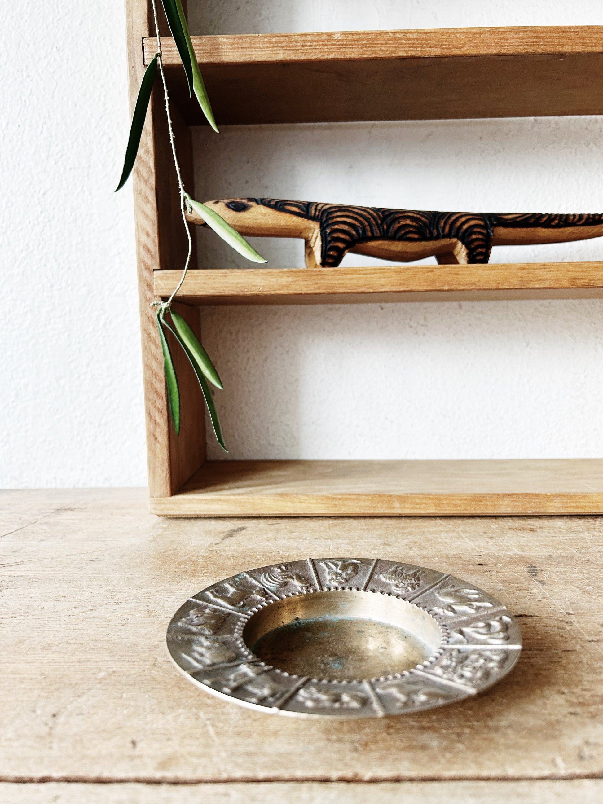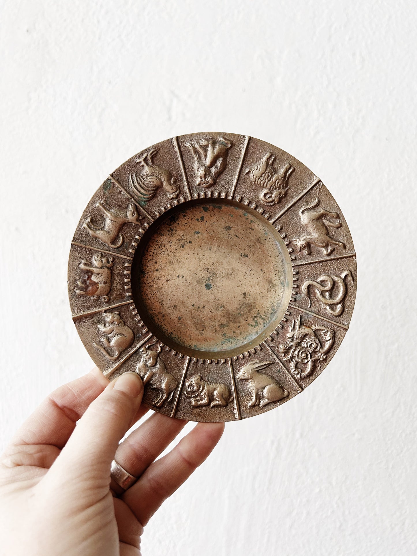 Vintage brass catchall dish featuring the Chinese zodiac. Nice aged patina. perfect for incense or jewelry