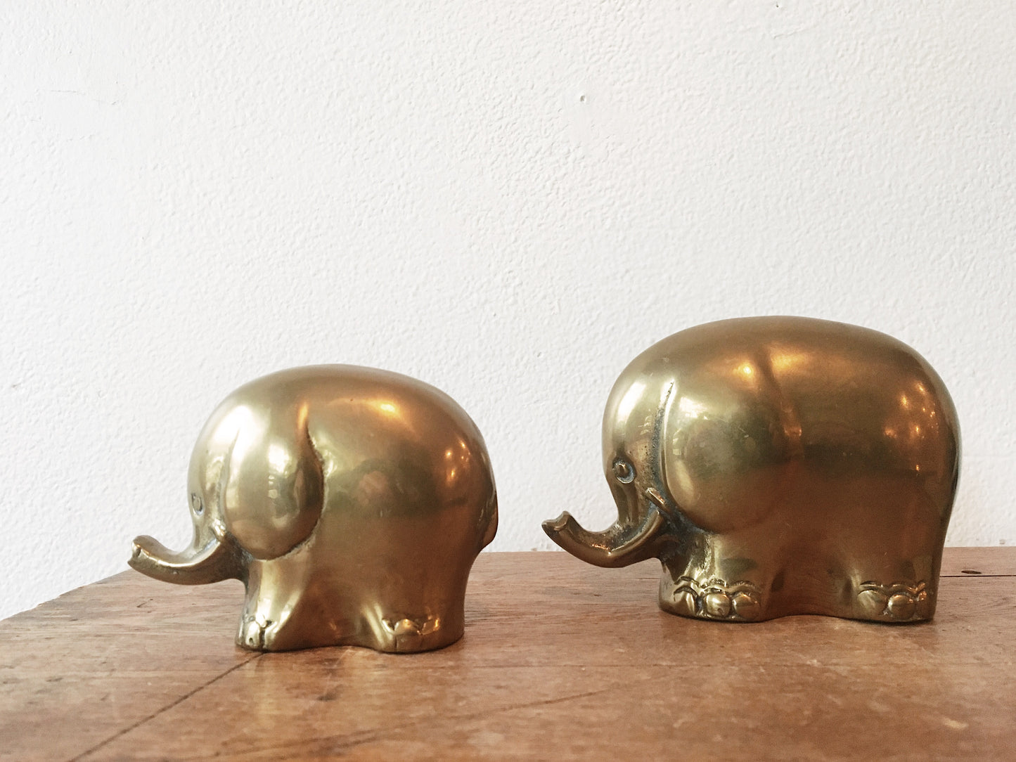 Vintage weighty brass elephant pair with lucky up turned trunks. Nice patina, excellent vintage condition.