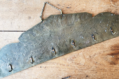 Great looking incised brass hanging rack. Has six brass hooks with copper nails. Comes with a brass hanging chain.