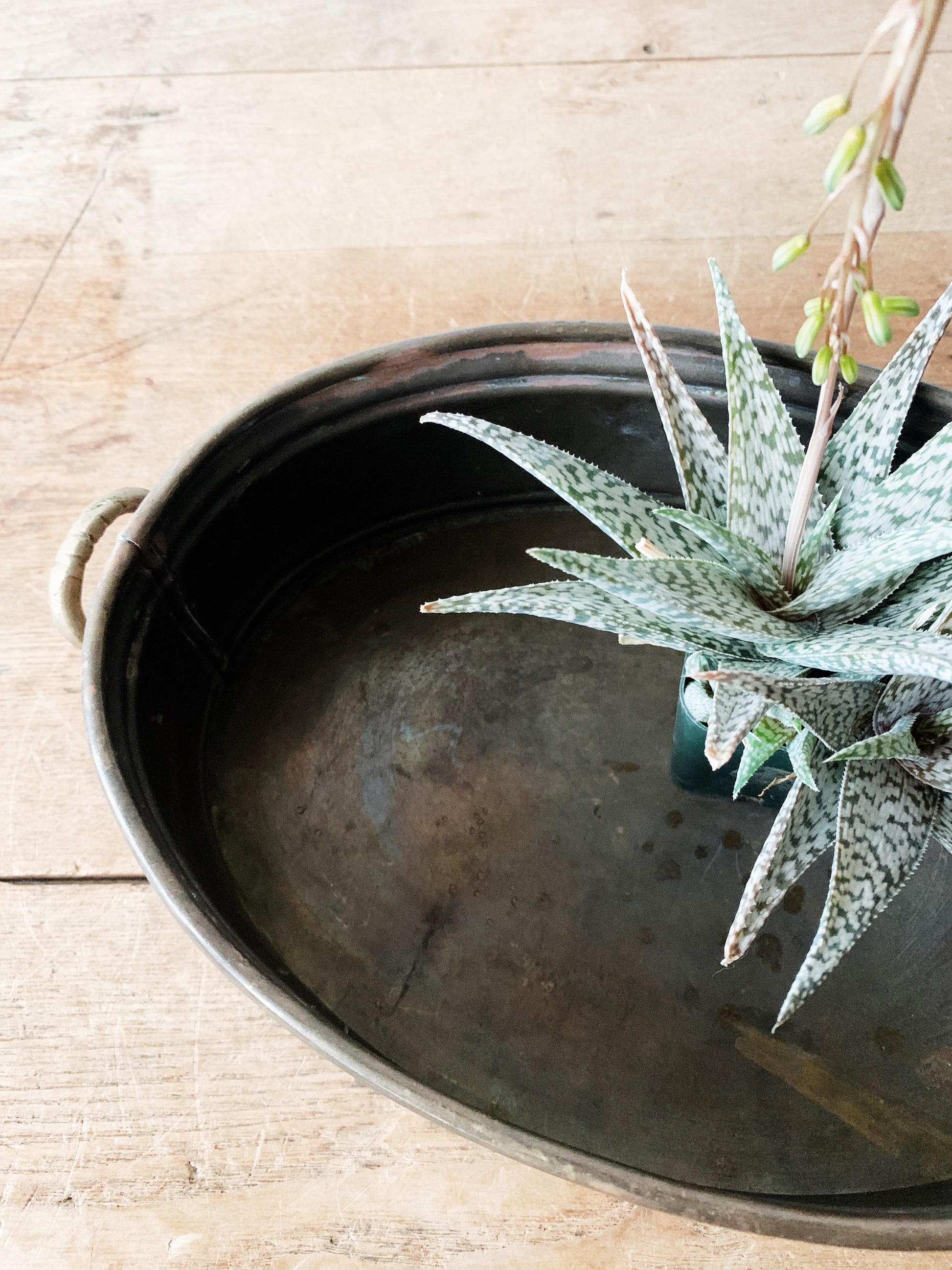 Wonderful aged patina on this old brass pot. Oblong shaped with handles