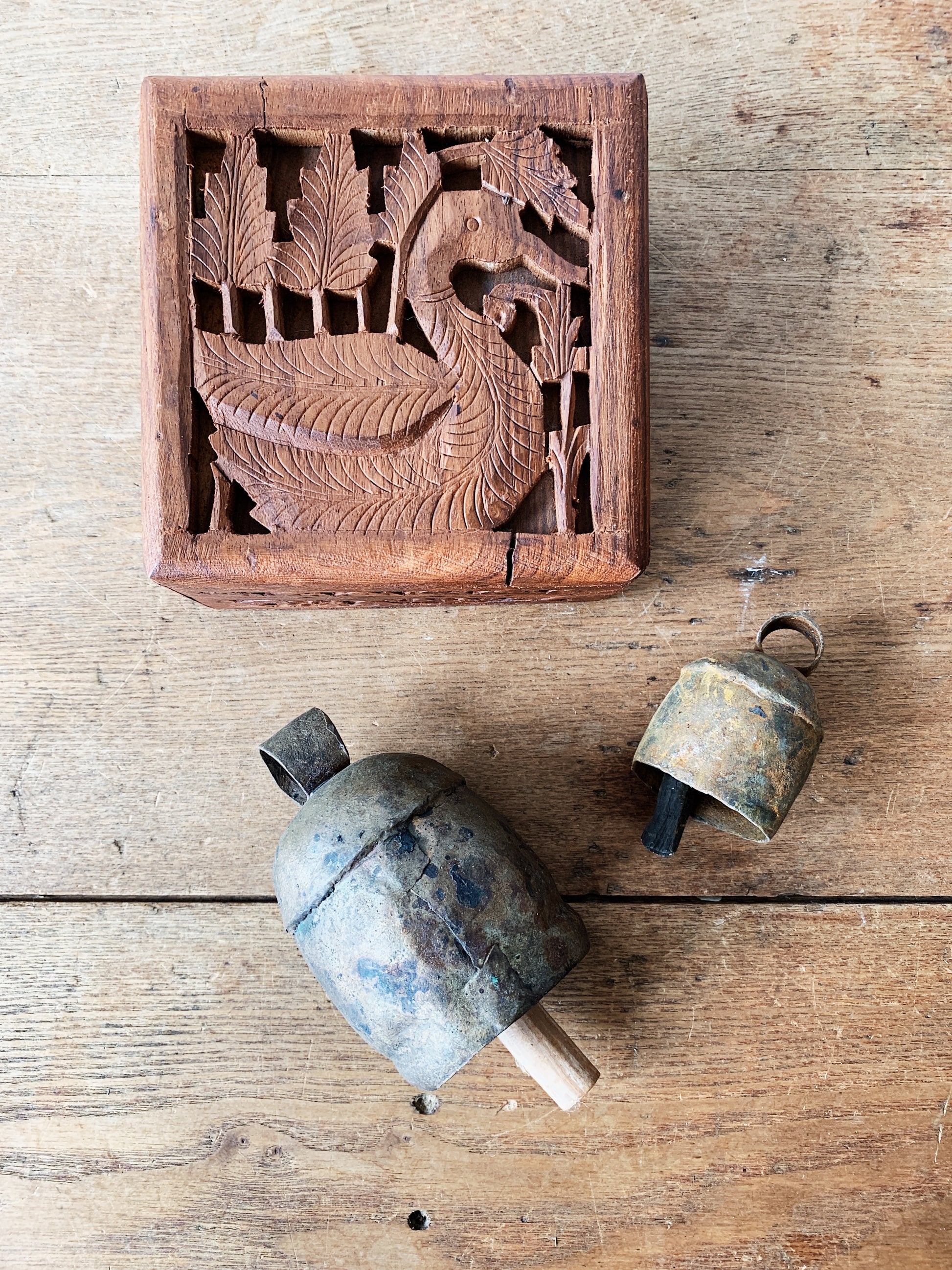 Vintage brass temple bells that will come with a strand of jute for hanging. Lovely tone and patina on these. Great for hanging on doorknobs or in the garden