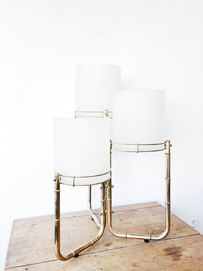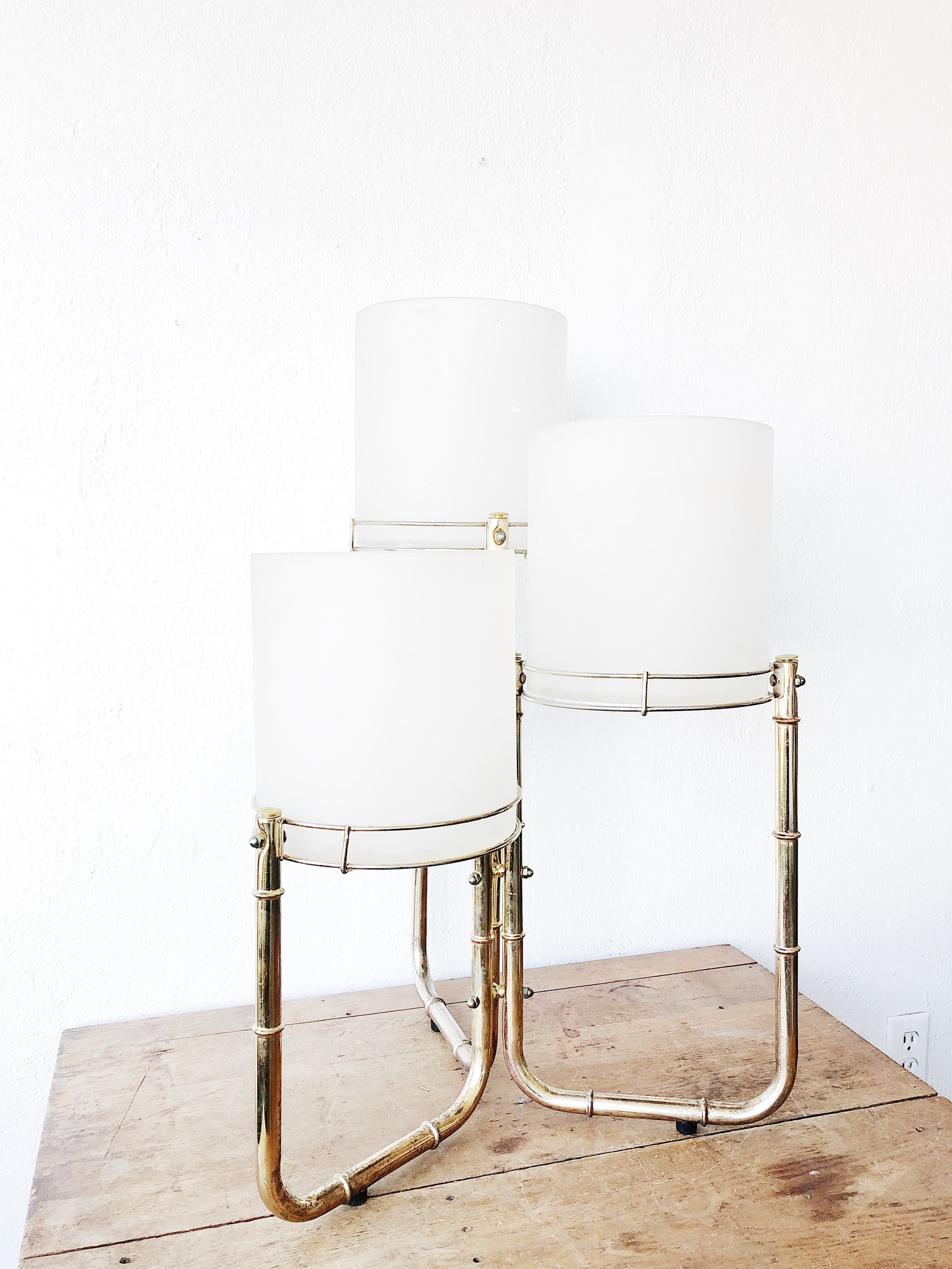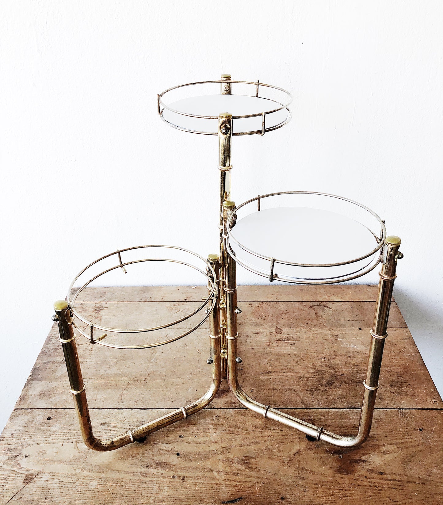 Three tier vintage brass stand for plants. Two shelves included and one free space for a plant pot to rest in. Great look to the brass ‘pipe’ base. Some minimal surface wear. Shelf bottoms can remove.