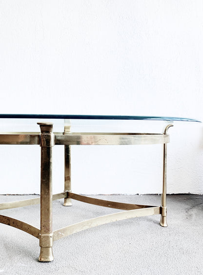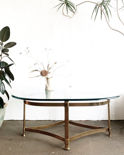 Glamorous vintage brass coffee table with thick, rounded edge oval glass top. The base and the glass are heavy! Really nice piece in great shape. Clear glass, base has a few minor marks but overall really excellent.
