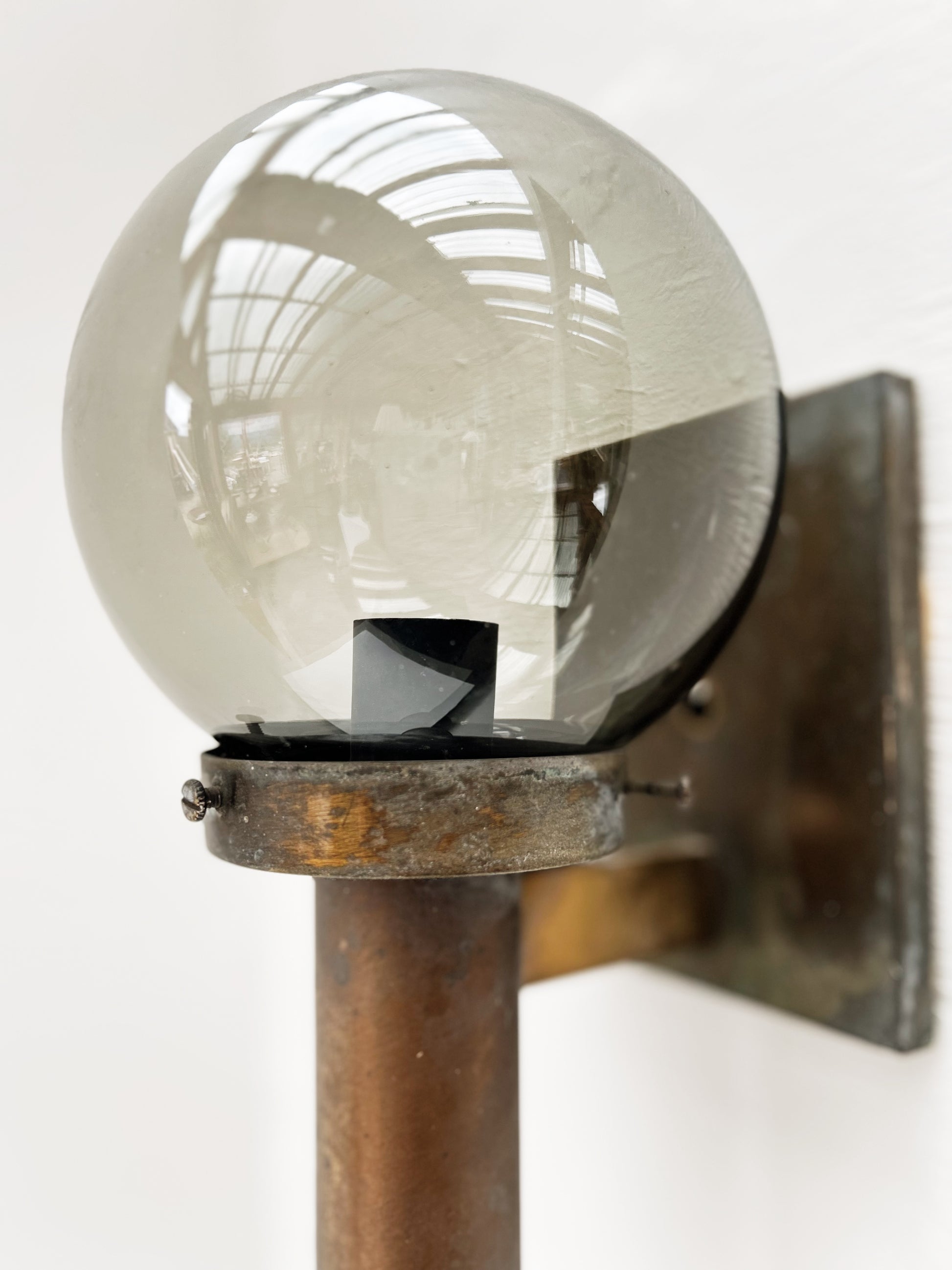 Perfectly weathered bronze sconce topped with a smoked glass globe. Hardwire installation