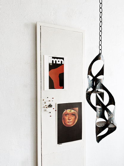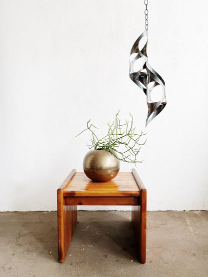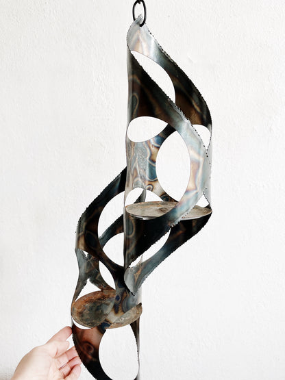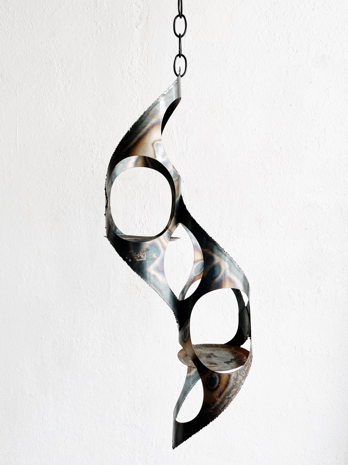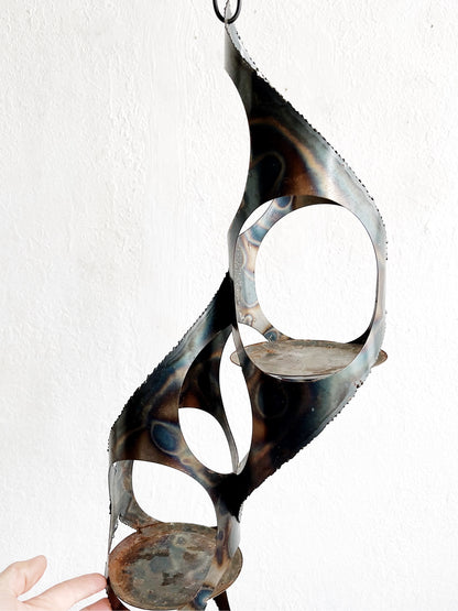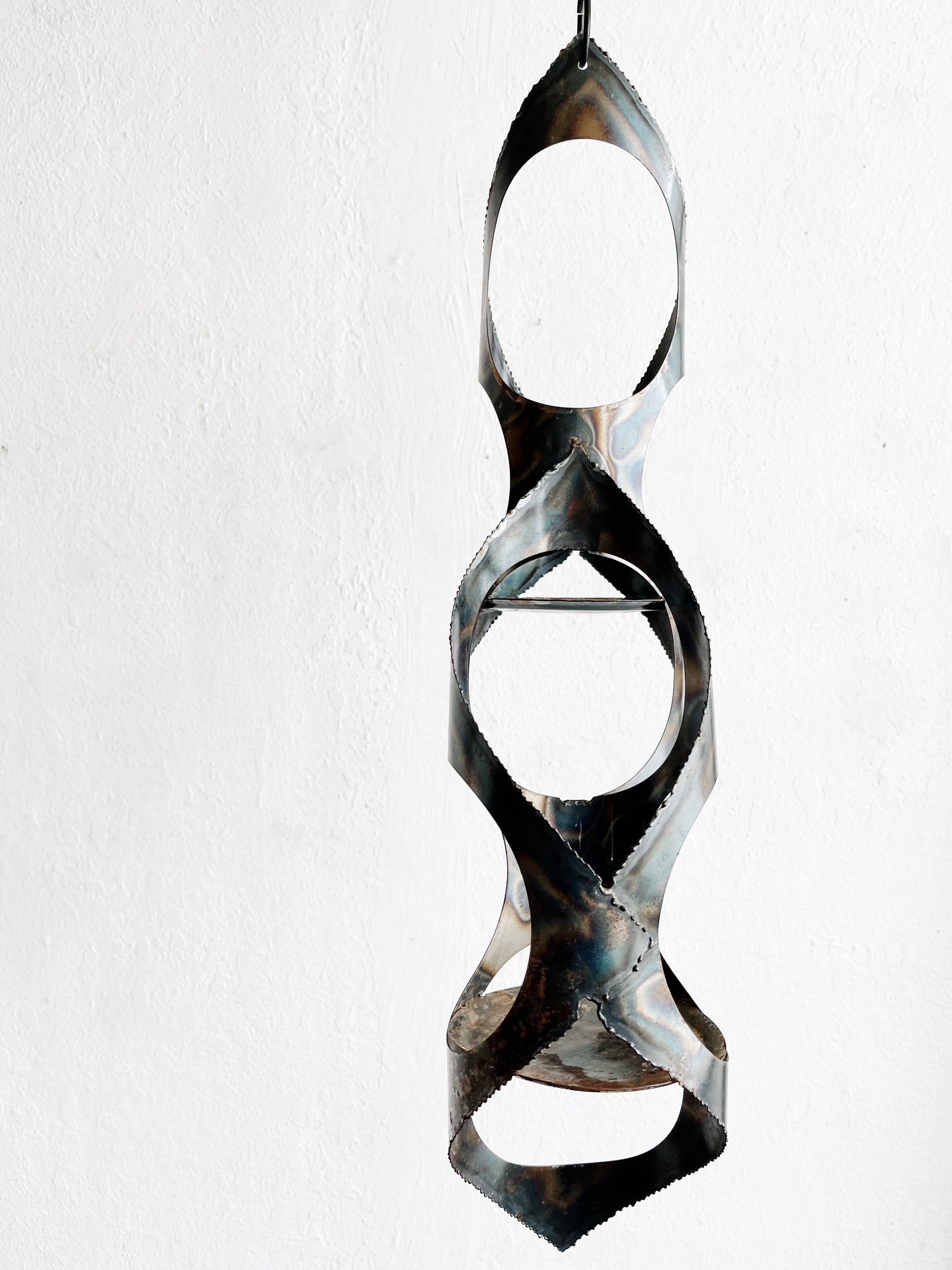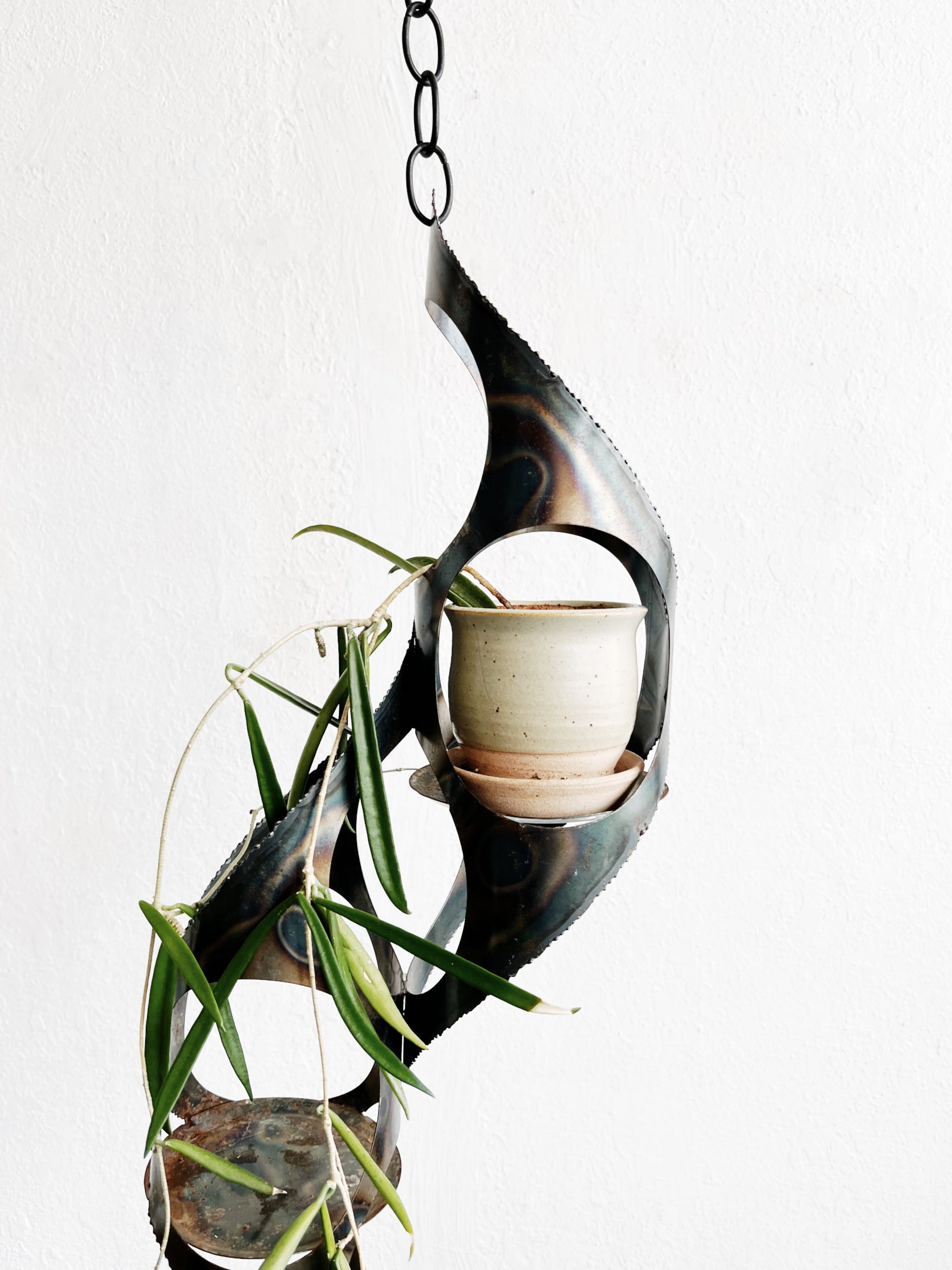 A metal hanger in the brutalist style. Holds smaller plants and/or candles. Hangs from a long chain and looks fabulous in a corner over a table