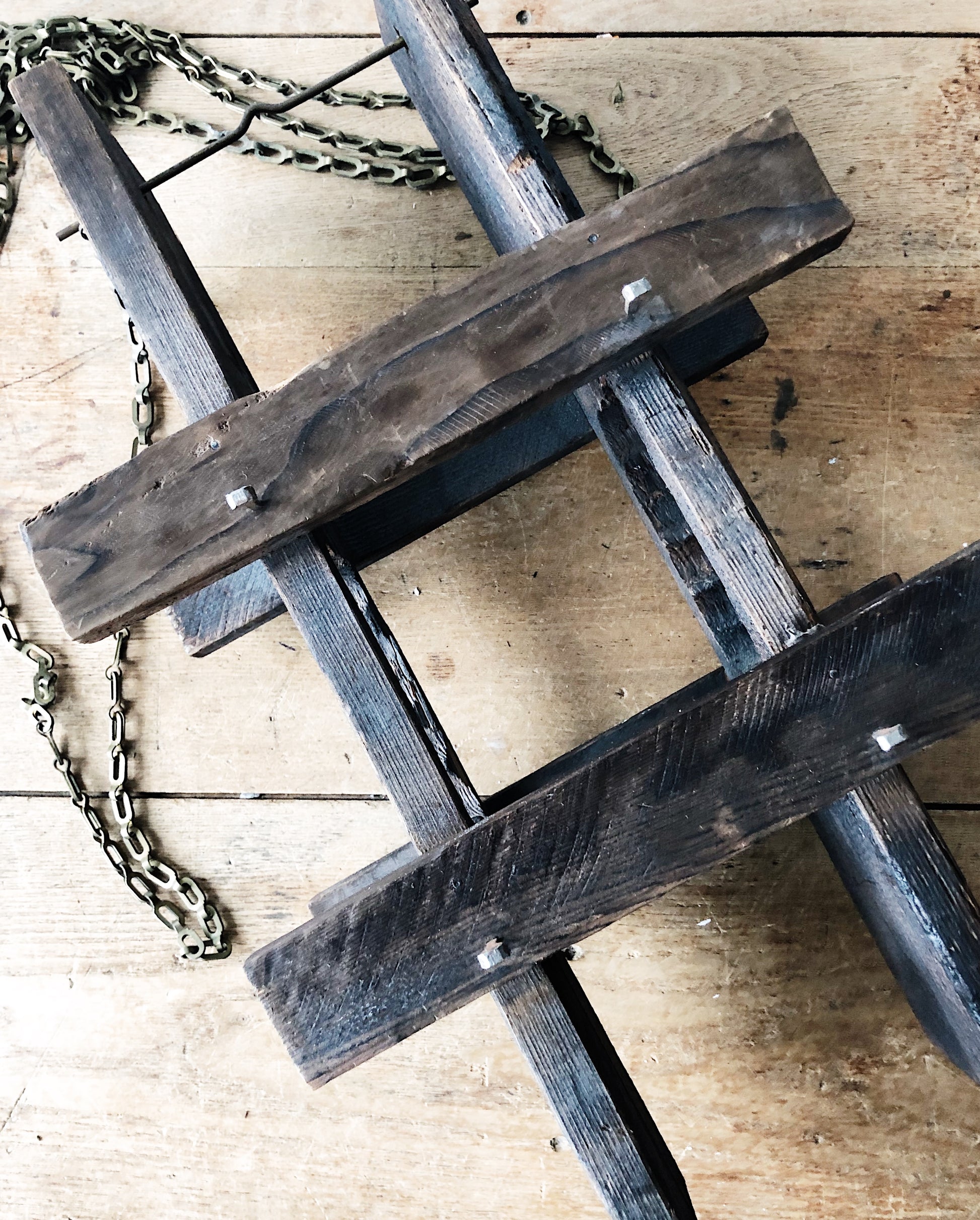 Carved wood lantern in the brutalist style. Nice old brass chain, lots of it, for hanging. Takes a stout pillar or even a small plant