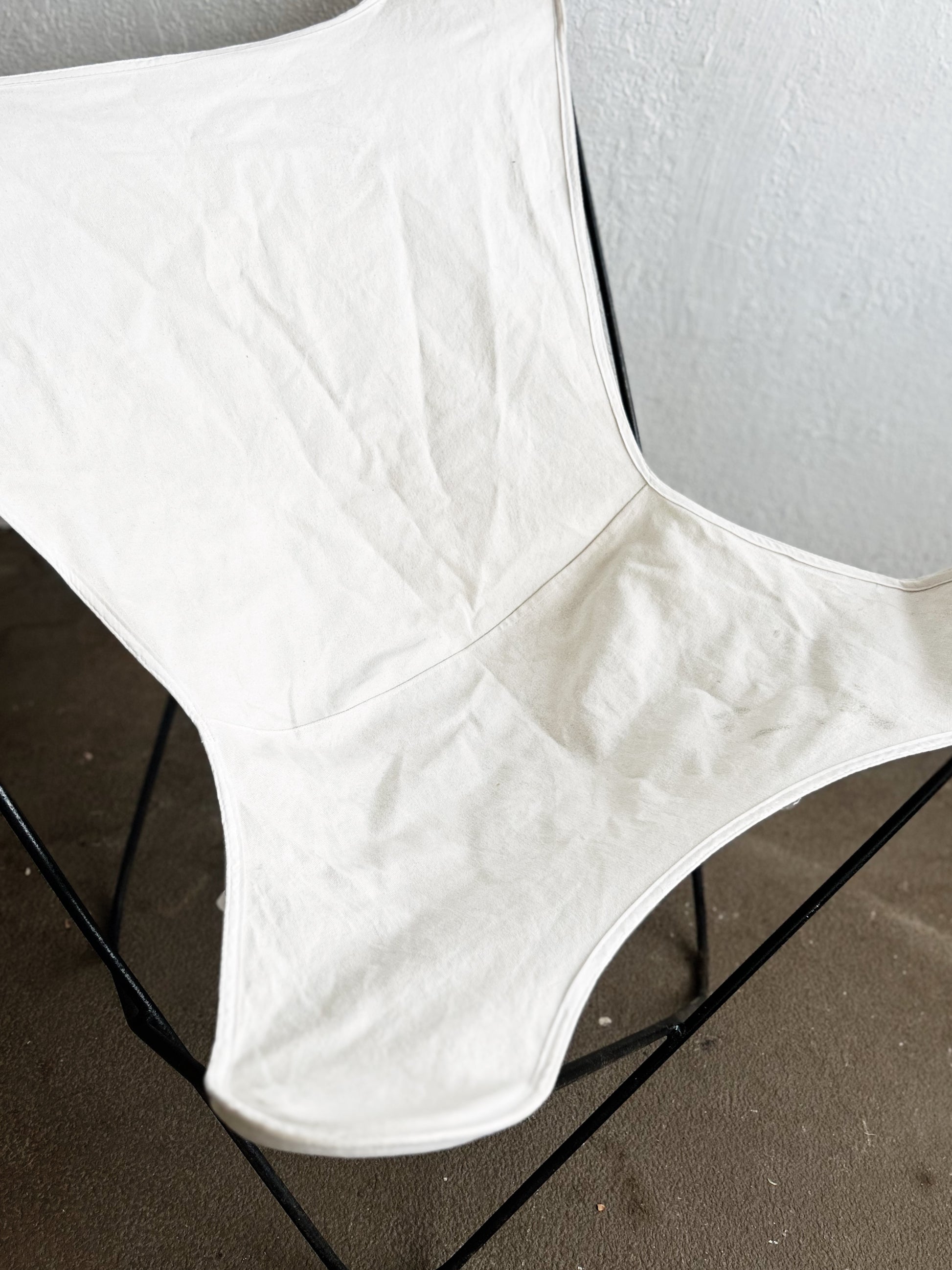 A classic and original butterfly chair with newer covers. This is the non collapsing type. Sits a little more firm than reproductions. Included is one warm white canvas cover (little bit of dirt stain that should wash out well) and one terracotta cover (never used)