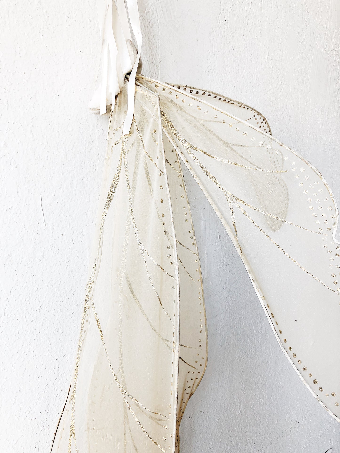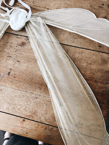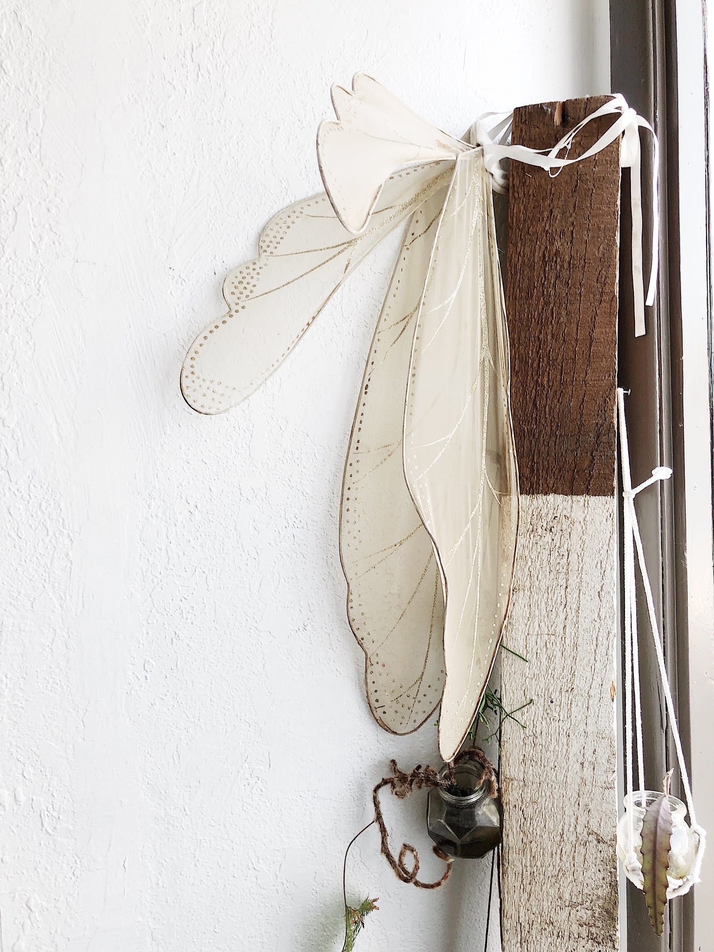 From an old ballet costume. Vintage velvet and organza wings with a touch of glittery gold (because, duh, fairies!) Ribbon ties and wire frame.