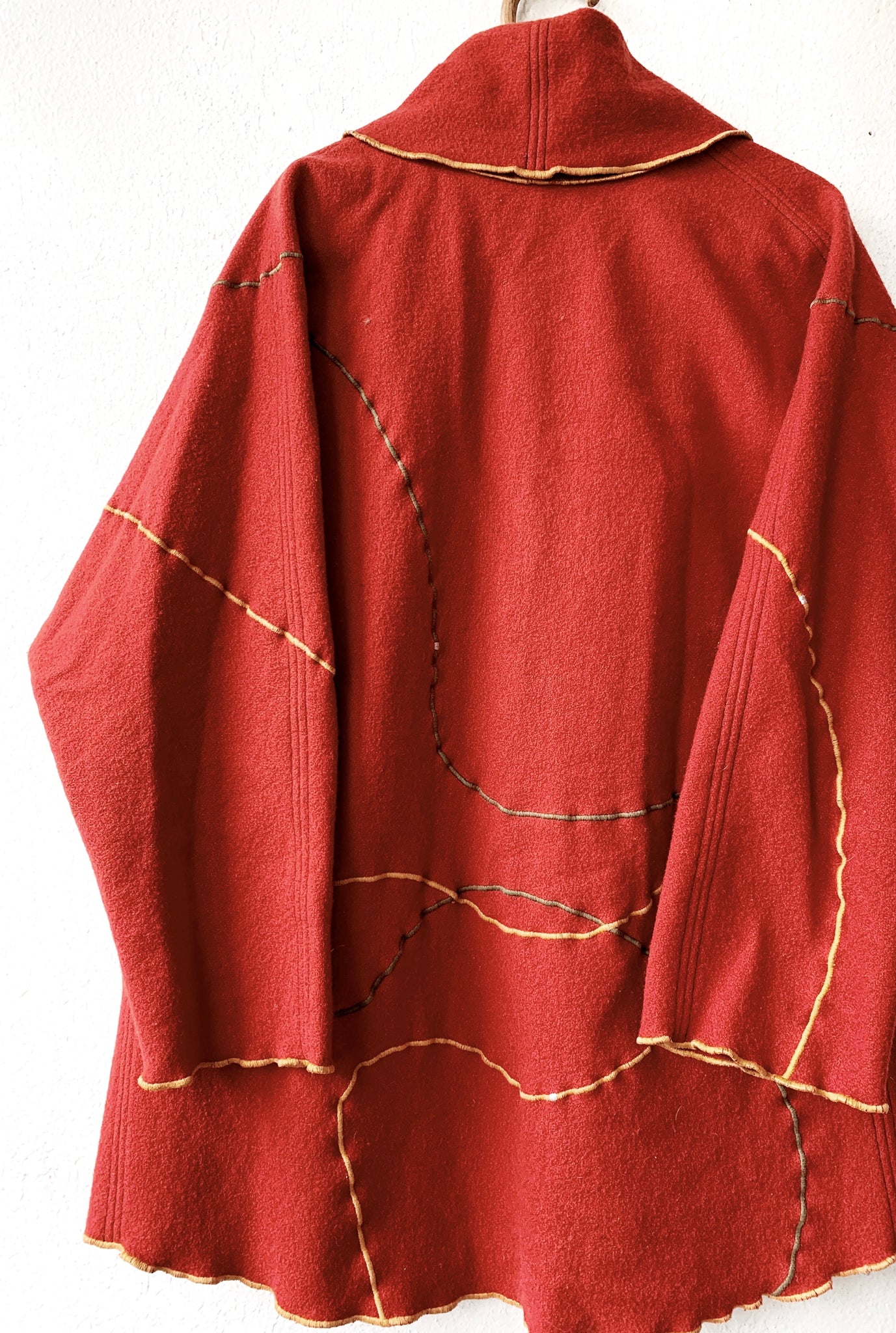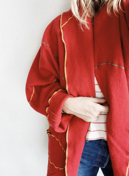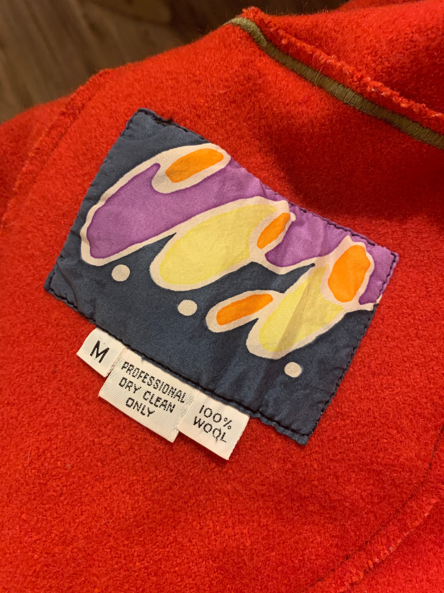Amazing vintage Cindy Owens Designs Wool jacket in cherry red with taupe and terra cotta stitching. Dolman sleeve and two pockets. Really beautifully made and in excellent condition.