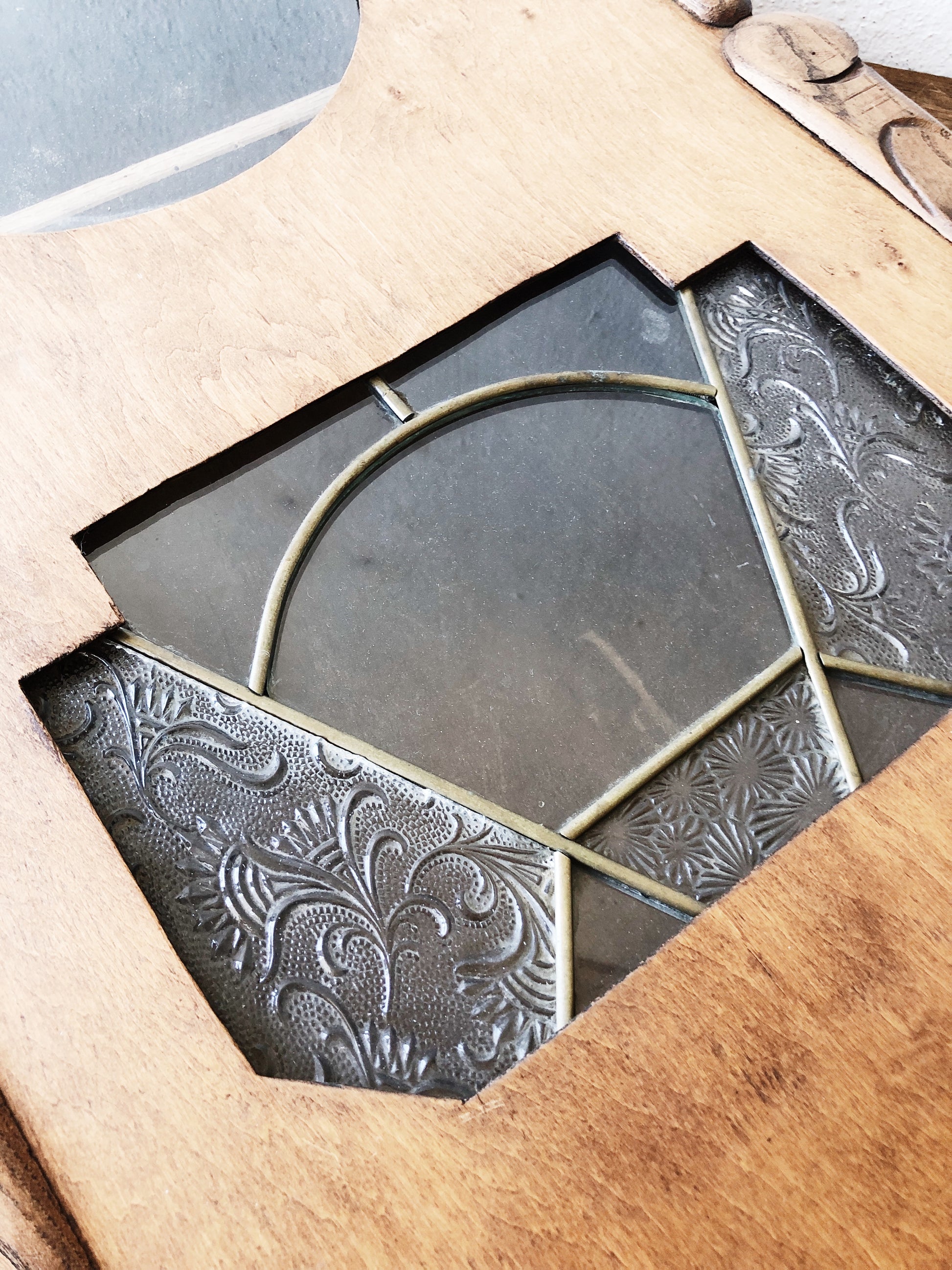 An old clock cabinet has been emptied and the beautiful case remains. Feathered leaded glass, and a small shelf inside. Closed with a hook latch. Old brass hardware
