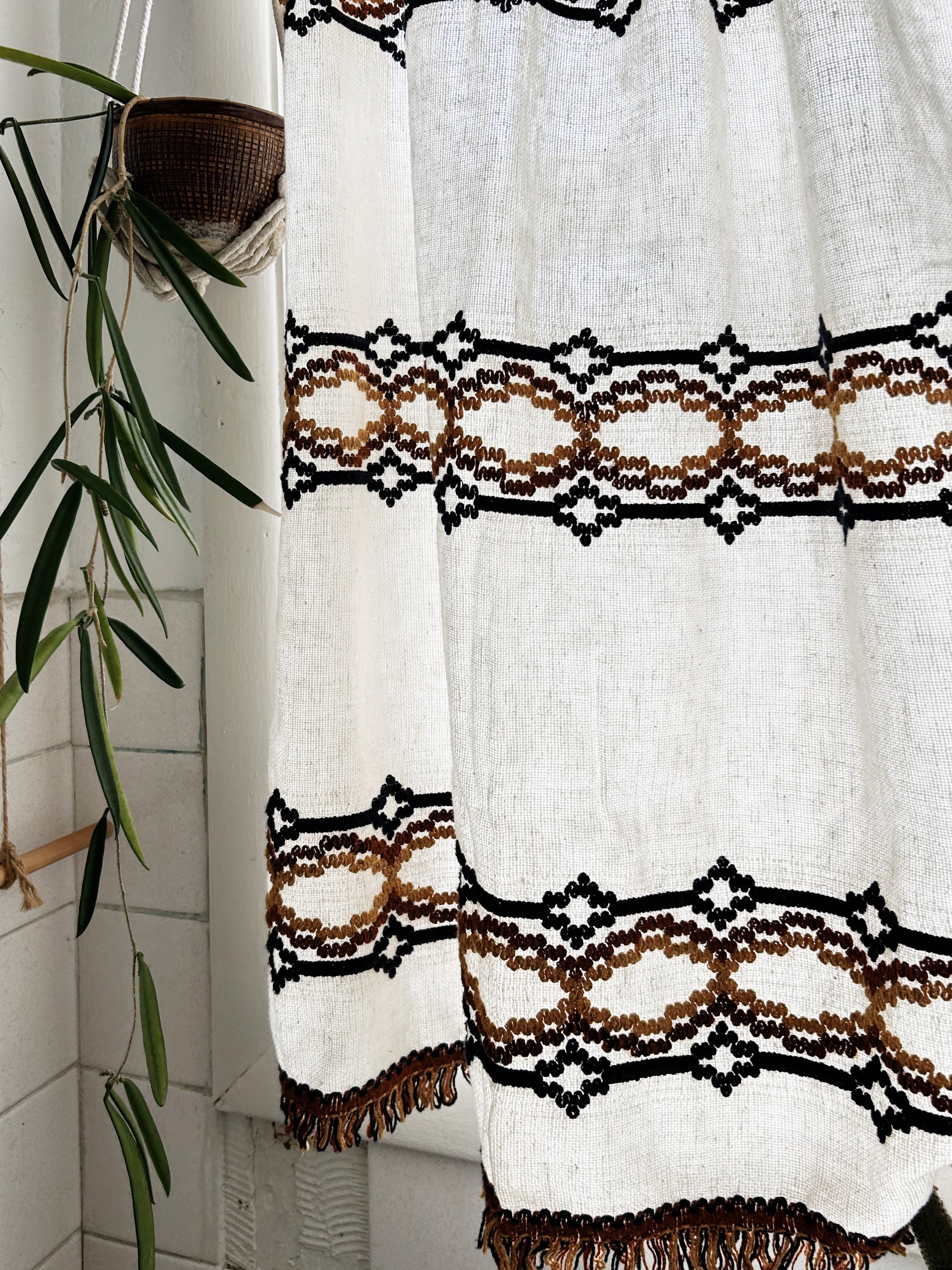 Handmade vintage cafe curtains. Linen and cotton crewel work is so charming. Filters the light nicely. Nice and soft