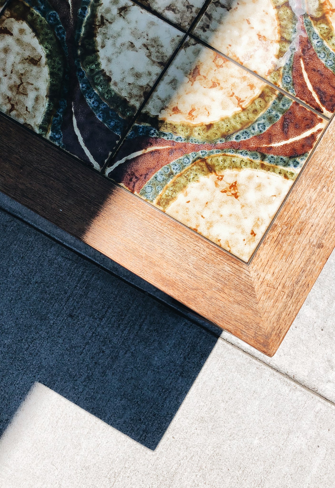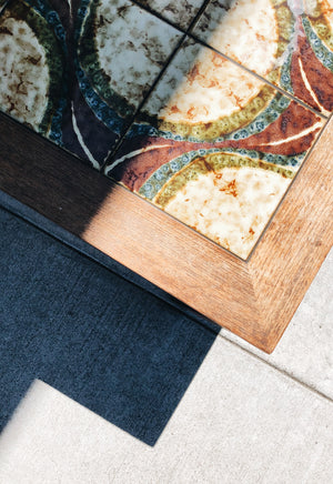 1970s California Tile coffee table. Teak parson leg base with the most gorgeously colored tiles. Heavy and solid. In wonderful condition with just the usual amount of vintage wear to the wood