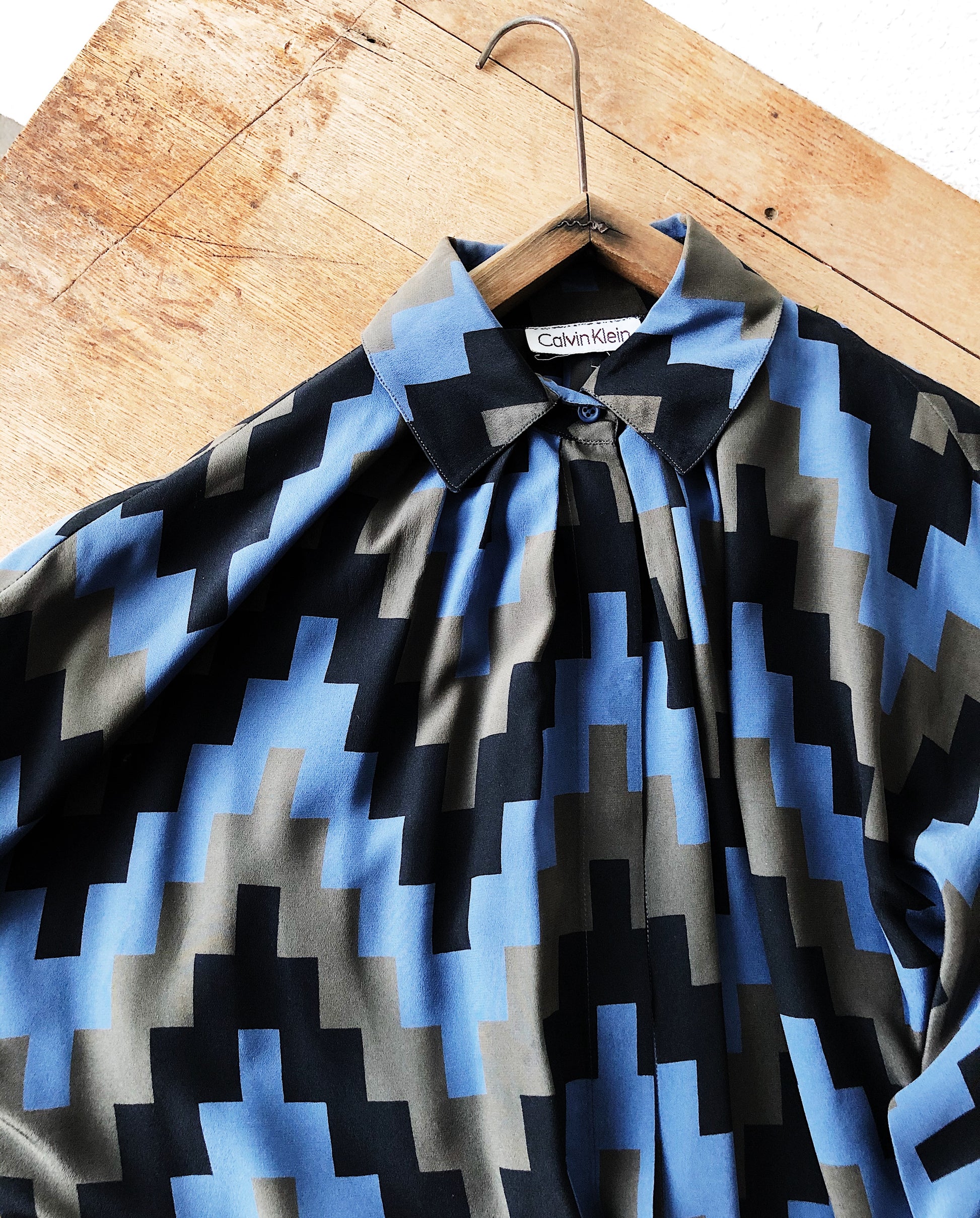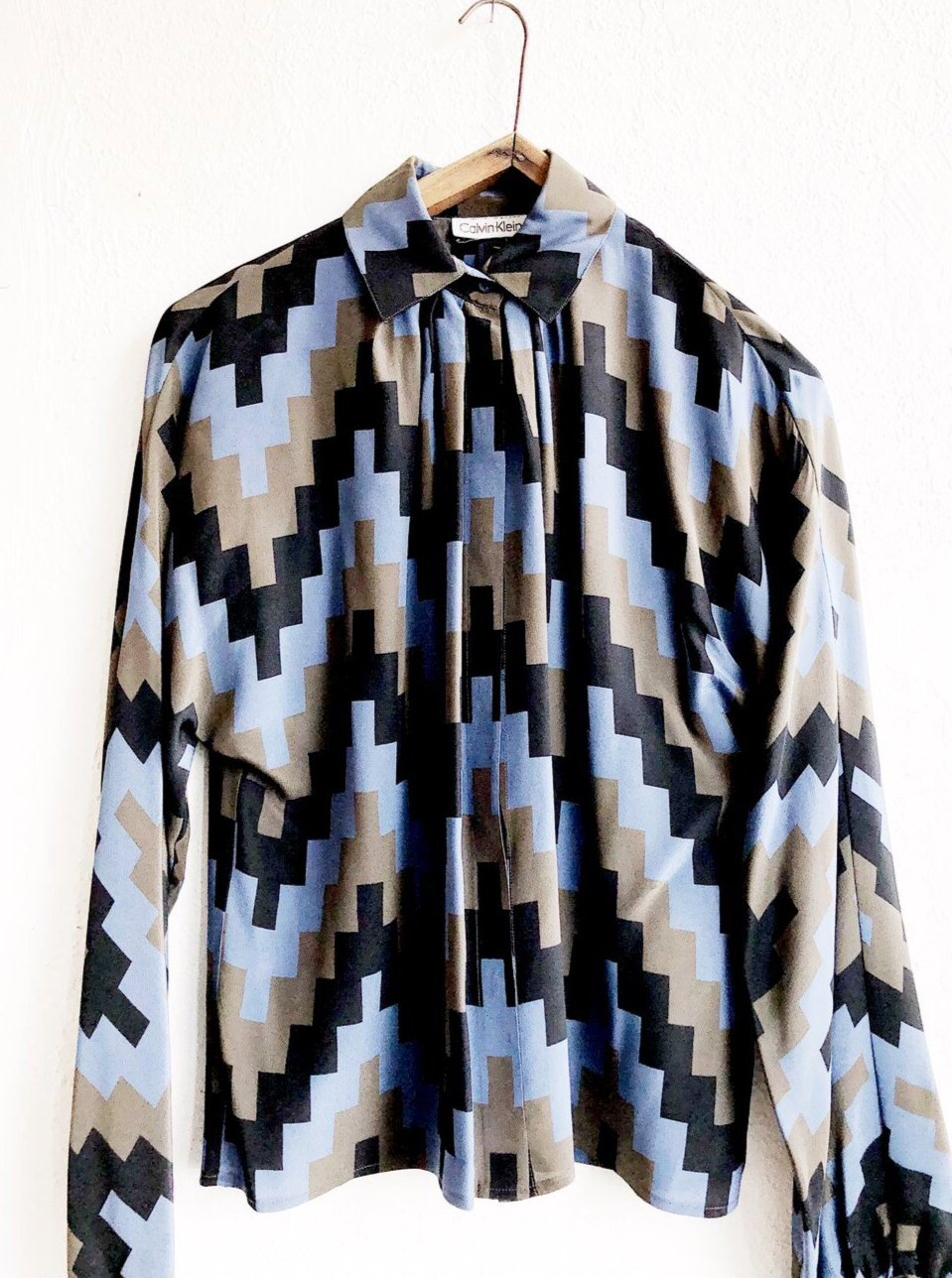 Fab pattern and colors on this vintage Calvin Klein silk. Dolman sleeve and knife pleat cuffs. Ruched neckline.
