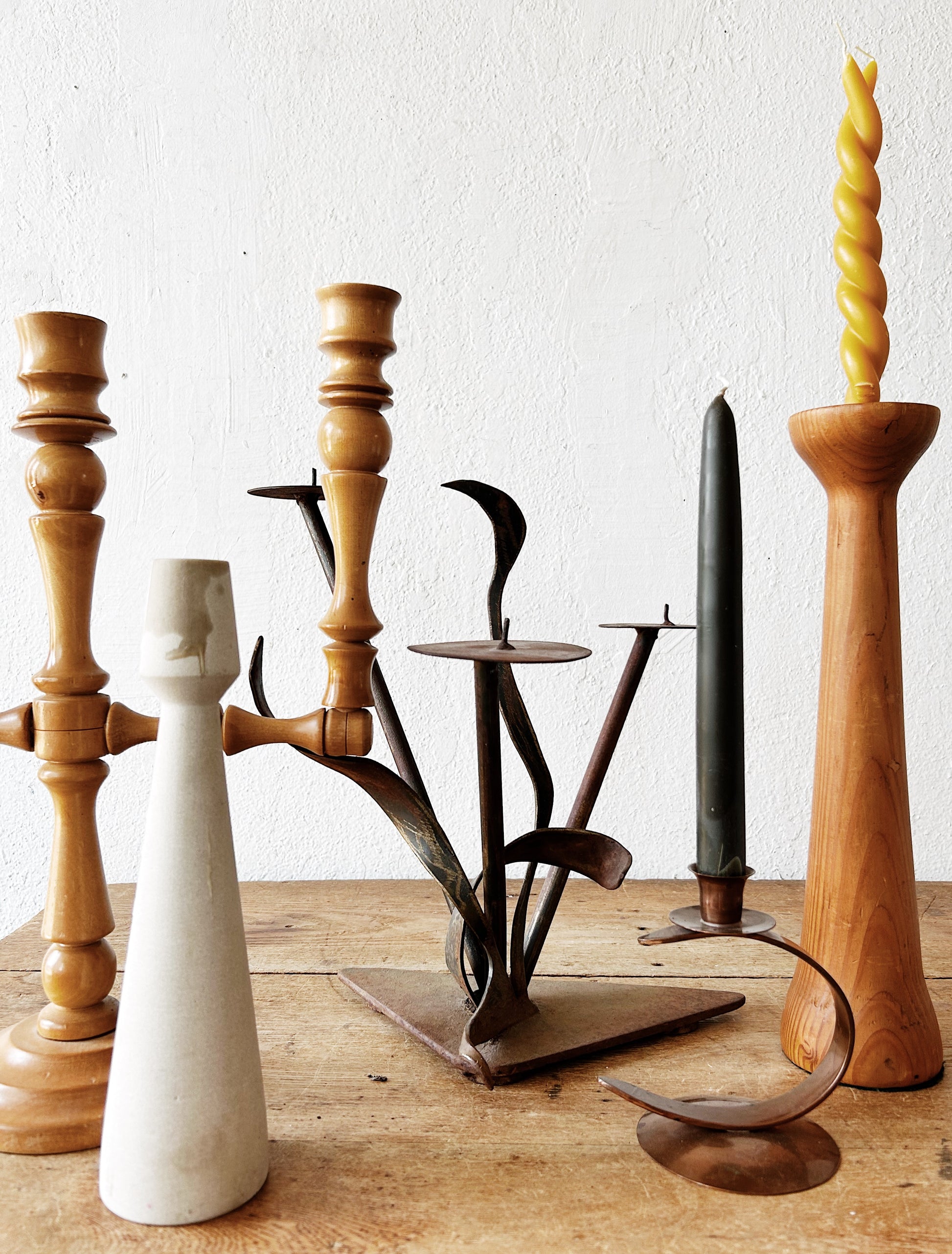 Womderful collection of vintage candlesticks and candelabras with varying styles. Each takes standard tapers (not included)